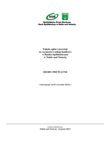 Tabela opłat i prowizji za czynności i usługi bankowe w Banku Spółdzielczym w Nakle nad Notecią OSOBY PRYWATNE ( obowiązuje od 01 września 2013r.) ostatnia aktualizacja: Nakło nad Notecią ·sierpień 2013 Uwagi wstępne 1. Użyte w tabeli opłat i prowizji określenia: Bank, Oddział, Filia, Punkt Kasowy oznaczają jednostki organizacyjne Banku Spółdzielczego w Nakle nad Notecią wykonujące obsługę klienta. 2. Prowizje od wpłat na rachunki bankowe pobiera się od wpłacającego, chyba że umowa z posiadaczem rachunku stanowi inaczej. 3. Zarząd Banku dopuszcza możliwość negocjowania z klientem indywidualnych stawek prowizji i opłat. 4. Prowizje i opłaty od dokonywanych transakcji gotówkowych i bezgotówkowych pobierane są w momencie wykonania transakcji. 5. Prowizja za prowadzenie rachunków pobierana jest za dany miesiąc ostatniego roboczego dnia miesiąca z rachunku klienta. 6. Prowizję i opłaty za wynajem skrytek, przechowywanie depozytów, wynajem portfeli i kluczy do wrzutni pobiera się do 10 za dany miesiąc. 7. Wysokość prowizji i opłat od operacji gotówkowych jak i bezgotówkowych pobrana jest z rachunku bankową notą memoriałową. Prowizja i opłaty od operacji gotówkowych mogą być pobierane gotówką w czasie dokonywania wpłaty z jednoczesnym odnotowaniem wysokości na dokumencie. 8. Pozostałe prowizje i opłaty w zależności od rodzaju pobierane są gotówkowo lub bezgotówkowo. 9. Opłaty miesięczne nie są pobierane w miesiącu rozpoczęcia oraz w miesiącu zakończenia korzystania z usługi świadczonej przez bank, a opłaty roczne są zwracane w części za niewykorzystany okres, jeżeli klient zrezygnował z usługi przed upływem roku od pobrania opłaty. 2 Rozdział I. Czynności i usługi bankowe dotyczące rachunków i przeprowadzania rozliczeń – waluta krajowa Rodzaj czynności bankowej Stawka obowiązująca (opłata w zł lub % kwoty) Tradycyjnie za pomocą w ramach (w kasie karty Internet Banku) własnej 1 Bankingu bez opłat 1. Otwarcie rachunku oszczędnościowo-rozliczeniowego 2. Prowadzenie rachunku oszczędnościowo-rozliczeniowego (nie dotyczy rachunku oszczędnościowo – rozliczeniowego osoby małoletniej „Junior”) Dyspozycje bezgotówkowe (przelewy) na rachunki bankowe (opłata od każdej dyspozycji): • prowadzone w Banku Spółdzielczym • prowadzone w innych bankach • przelewy realizowane w systemie SORBNET: a) powyżej 999.999,99 zł b) poniżej 1.000.000,00 zł ( nie pobiera się opłaty standardowej za przelew ) Dokonanie automatycznych przelewów z rachunków bankowych w terminie wskazanym przez Klienta – zlecenia stałe (opłata od każdej dyspozycji) 7,00 zł miesięcznie 7,00 zł miesięcznie 7,00 zł miesięcznie bez opłat 1,50 zł bez opłat 1,00 zł bez opłat 1,00 zł 15,00 zł 30,00 zł --- 15,00 zł 30,00 zł 2,00 zł --- 1,00 zł 5. Dokonywanie automatycznych przelewów z rachunków w terminie wskazanym przez Klienta – zlecenia stałe (opłata od każdej dyspozycji) wewnątrz banku --- --- --- 6. 7. Modyfikacja kwoty/terminu zlecenia stałego Modyfikacja kwoty/terminu zlecenia stałego dotyczącego przelewów wewnątrz banku Odwołanie zlecenia stałego Odwołanie zlecenia stałego dotyczącego przelewów wewnątrz banku Wpłaty gotówkowe • na rachunki w Banku Spółdzielczym 2,00 zł --- ----- 1,00 zł --- 2,00 zł --- ----- 2,00 zł --- bez opłat bez opłat --- 0,5% nie mniej niż 3,50 zł, nie więcej niż 150,00 zł zg. z zawartymi umowami (w przypadku braku umów – 0,5%, nie mniej niż 3,50 zł, nie więcej niż 150,00 zł) bez opłat 1,50 zł --- --- --- --- ----- ----- bez opłat bez opłat --- 3. 4. 8. 9. 10. • na rachunki w innych bankach • na rzecz Urzędów Skarbowych • • 11. na działalność pożytku publicznego2 wpłaty czynszów do wspólnot mieszkaniowych oraz prywatnych właścicieli kamienic posiadających rachunki w Banku Spółdzielczym Wypłaty gotówkowe 12. Dyspozycje bezgotówkowe (przelewy) realizowane z wpływów bieżących: bez opłat bez opłat --- 13. Prowadzenie rachunków lokat terminowych bez opłat --- bez opłat 14. Wpłaty i wypłaty z rachunków lokat terminowych bez opłat --- --- 15. Ustanowienie/zmiana pełnomocnictwa do dysponowania rachunkiem oszczędnościowym i wkładem terminowym – opłata od każdego pełnomocnika 16. Ustanowienie/zmiana pełnomocnictwa do dysponowania rachunkiem oszczędnościowo-rozliczeniowym i terminową lokatą oszczędnościową – opłata od każdego pełnomocnika 17. Polecenie zapłaty: 10,00 zł 10,00 zł 1 usługa dostępna w całodobowej strefie samoobsługowej : Nakło nad Notecią, ul. Sądowa 10,Nakło nad Notecią, ul. Rynek 9, Nakło nad Notecią ul. Asnyka 2, Sadki, ul. Powstańców Wlkp. 1,Bydgoszcz, ul. Abrahama 8,Bydgoszcz, ul. Śniadeckich 18, Potulice, ul. Bydgoska 13/41 2 dotyczy organizacji wymienionych w rejestrze organizacji pożytku publicznego publikowanym na stronie internetowej Ministerstwa Sprawiedliwości (www.ms.gov.pl) 3 • złożenie zlecenia wykonania polecenia zapłaty przez wierzyciela 2,00 zł • realizacja polecenia zapłaty z rachunku dłużnika 2,00 zł 2,00 zł 18. odwołanie polecenia zapłaty (za złożenie jednego odwołania) lub aktualizacja upoważnienia polecenia zapłaty • odmowa wykonania polecenia zapłaty z tytułu braku środków na rachunku dłużnika Potwierdzenie czeku gotówkowego i rozrachunkowego 10,00 zł 19. Wydanie książeczki czekowej 10,00 zł 20. 15,00 zł 21. Za przechowywanie zamówionych, a nieodebranych w terminie blankietów czekowych i kart przez okres dłuższy niż 30 dni Wysłanie na życzenie Klienta listem poleconym blankietów czekowych 22. Sporządzenie i przekazanie pocztą wyciągów bankowych (1 raz w miesiącu) bez opłat 23. Sporządzenie odpisu obrotów na jednym rachunku z bieżącego roku kalendarzowego na wniosek Klienta – za każdy poprzedni rok 50% więcej Sporządzenie odpisu (opłata za każdy odpis): 20,00 