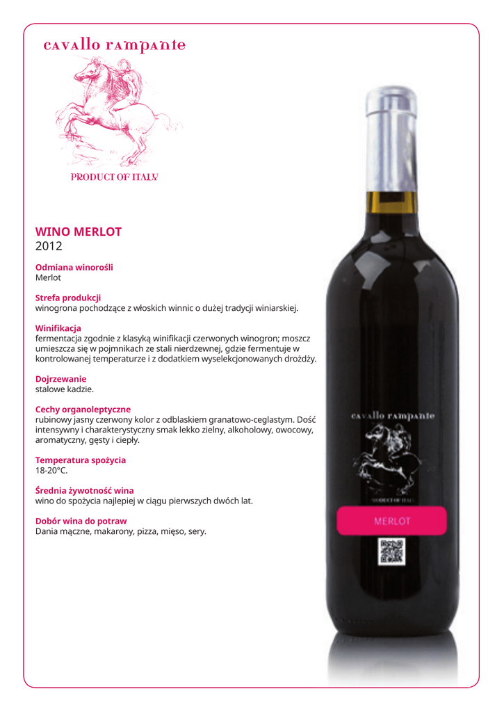cavallo rampante PRODUCT OF ITALY WINO MERLOT 2012 Odmiana winorośli Merlot Strefa produkcji winogrona pochodzące z włoskich winnic o dużej tradycji winiarskiej. Winifikacja fermentacja zgodnie z klasyką winifikacji czerwonych winogron; moszcz umieszcza się w pojmnikach ze stali nierdzewnej, gdzie fermentuje w kontrolowanej temperaturze i z dodatkiem wyselekcjonowanych drożdży. Dojrzewanie stalowe kadzie. Cechy organoleptyczne rubinowy jasny czerwony kolor z odblaskiem granatowo-ceglastym. Dość intensywny i charakterystyczny smak lekko zielny, alkoholowy, owocowy, aromatyczny, gęsty i ciepły. Temperatura spożycia 18-20°C. Średnia żywotność wina wino do spożycia najlepiej w ciągu pierwszych dwóch lat. Dobór wina do potraw Dania mączne, makarony, pizza, mięso, sery.