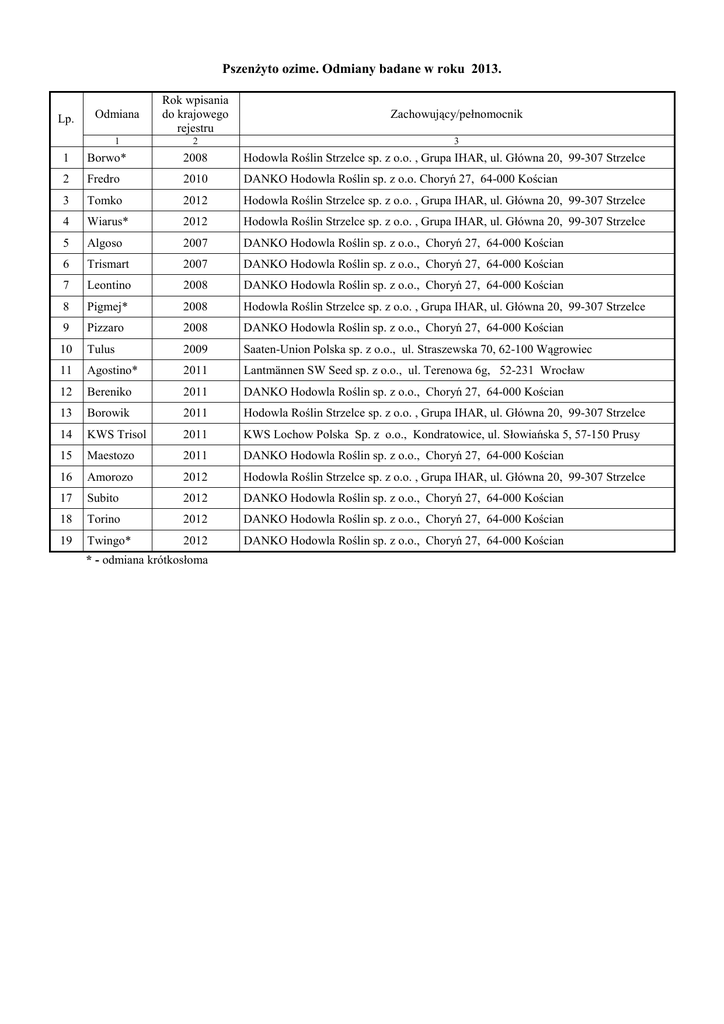 Pszenżyto ozime. Odmiany badane w roku 2013.