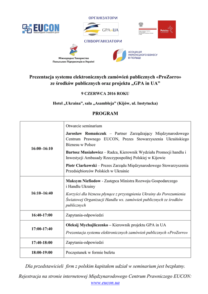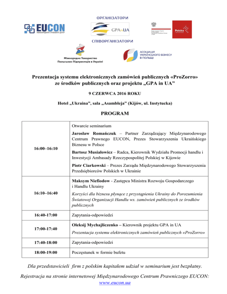 Prezentacja systemu elektronicznych zamówień publicznych «ProZorro» ze środków publicznych oraz projektu „GPA in UA” 9 CZERWCA 2016 ROKU Hotel „Ukraina”, sala „Asambleja” (Kijów, ul. Instytucka) PROGRAM Otwarcie seminarium Jarosław Romańczuk – Partner Zarządzający Międzynarodowego Centrum Prawnego EUCON, Prezes Stowarzyszenia Ukraińskiego Biznesu w Polsce 16:00–16:10 Bartosz Musiałowicz – Radca, Kierownik Wydziału Promocji handlu i Inwestycji Ambasady Rzeczypospolitej Polskiej w Kijowie Piotr Ciarkowski – Prezes Zarządu Międzynarodowego Stowarzyszenia Przedsiębiorców Polskich w Ukrainie Maksym Niefiodow - Zastępca Ministra Rozwoju Gospodarczego i Handlu Ukrainy 16:10–16:40 Korzyści dla biznesu płynące z przystąpienia Ukrainy do Porozumienia Światowej Organizacji Handlu ws. zamówień publicznych ze środków publicznych 16:40-17:00 Zapytania-odpowiedzi Oleksij Mychajliczenko – Kierownik projektu GPA in UA 17:00-17:40 Prezentacja systemu elektronicznych zamówień publicznych «ProZorro» 17:40-18:00 Zapytania-odpowiedzi 18:00-19:00 Poczęstunek w formie bufetu Dla przedstawicieli firm z polskim kapitałem udział w seminarium jest bezpłatny. Rejestracja na stronie internetowej Międzynarodowego Centrum Prawniczego EUCON: www.eucon.ua