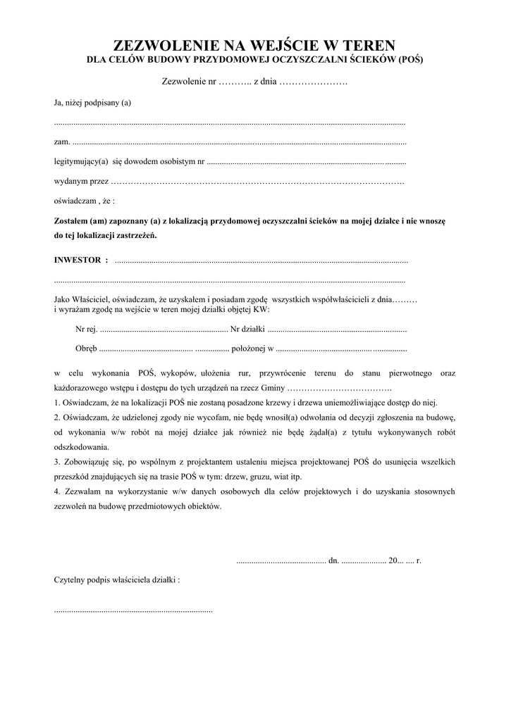 ZEZWOLENIE NA WEJŚCIE W TEREN DLA CELÓW BUDOWY PRZYDOMOWEJ OCZYSZCZALNI ŚCIEKÓW (POŚ) Zezwolenie nr ……….. z dnia …………………. Ja, niżej podpisany (a) .................................................................................................................................................................... zam. ............................................................................................................................................................ legitymujący(a) się dowodem osobistym nr ................................................................................... .......... wydanym przez …………………………………………………………………………………………. oświadczam , że : Zostałem (am) zapoznany (a) z lokalizacją przydomowej oczyszczalni ścieków na mojej działce i nie wnoszę do tej lokalizacji zastrzeżeń. INWESTOR : ......................................................................................................................................... .................................................................................................................................................................... Jako Właściciel, oświadczam, że uzyskałem i posiadam zgodę wszystkich współwłaścicieli z dnia……… i wyrażam zgodę na wejście w teren mojej działki objętej KW: Nr rej. ............................................................ Nr działki ................................................................. Obręb ............................................ ................ położonej w ............................................. ................ w celu wykonania POŚ, wykopów, ułożenia rur, przywrócenie terenu do stanu pierwotnego oraz każdorazowego wstępu i dostępu do tych urządzeń na rzecz Gminy ………………………………. 1. Oświadczam, że na lokalizacji POŚ nie zostaną posadzone krzewy i drzewa uniemożliwiające dostęp do niej. 2. Oświadczam, że udzielonej zgody nie wycofam, nie będę wnosił(a) odwołania od decyzji zgłoszenia na budowę, od wykonania w/w robót na mojej działce jak również nie będę żądał(a) z tytułu wykonywanych robót odszkodowania. 3. Zobowiązuję się, po wspólnym z projektantem ustaleniu miejsca projektowanej POŚ do usunięcia wszelkich przeszkód znajdujących się na trasie POŚ w tym: drzew, gruzu, wiat itp. 4. Zezwalam na wykorzystanie w/w danych osobowych dla celów projektowych i do uzyskania stosownych zezwoleń na budowę przedmiotowych obiektów. .......................................... dn. ..................... 20... .... r. Czytelny podpis właściciela działki : ..........................................................................