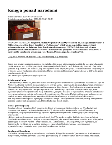 Księga ponad narodami Napisano dnia: 2014-04-18 18:15:04 Ostatnia aktualizacja dnia: 2015-12-13 21:38:11 WROCŁAW, HENRYKÓW. Krajowy Komitet Programu UNESCO postanowił, że „Księga Henrykowska” z XIII wieku oraz „Akta Braci Czeskich w Wielkopolsce” z XVI wieku są polskimi propozycjami walczącymi o wpis na światową listę dziedzictwa kulturowego UNESCO. Inicjatorami takiego potraktowania dzieła mnichów-cystersów z Henrykowa są prezydent Wrocławia Rafał Dutkiewicz i metropolita wrocławski arcybiskup Józef Kupny. Decyzja zapadnie w roku 2015. „Day, ut ia pobrusa, a ti poziwai” (Daj, ać ja pobruszę, a ty poczywaj)” Ponoć była gruba i niezdarna, przez co nie radziła sobie m.in. z mieleniem ziarna zbóż. I z tego powodu czeski rolnik, zarazem mąż polskiej gospodyni, mieszkającej w Brukalicach, zwrócił się do niej słowami: „Day, ut ia pobrusa, a ty poziwai”, co oznacza „Daj, niech ja będę mełł, a ty odpoczywaj”. To zdanie znalazło swoje miejsce w księdze „Liber fundationis claustri sanctae Mariae Virginis in Heinrichow”, prowadzonej w XIII wieku przez mnichów cysterskich. Jest pierwszym zapisanym w języku polskim. Dzieło opata Piotra - „Księga Henrykowska” to jest dzieło napisane w Henrykowie przez mnicha cysterskiego, opata Piotra”. Był on Niemcem, ale pisał językiem ówczesnej Europy, czyli po łacinie – zauważa ks. dr Jan Adamarczuk, wicerektor Metropolitalnego Wyższego Seminarium Duchownego w Henrykowie. – To dzieło ważne z punktu widzenia miejsca, w którym powstało, i wszystkiego, co w nim i wokół niego się działo. Pokazuje modlitwę i pracę cystersów prowadzoną przez wieki, fakty z otoczenia. Jednym z nich jest to wydarzenie z Brukalic, odnotowane przez wspomnianego mnicha, a dotyczące Czecha i jego żony Ślązaczki. Ujęto je w klasztorze budowanym na modę francuską, odległym jakieś pięćdziesiąt kilometrów od sporego przecież już wtedy Wrocławia. Ten niby kronikarski zapisek, a jaka jego historyczna ranga – szczególnie dla narodowej kultury. On ogromnie podniósł wartość całego opracowania, które składa się z dwóch części. Unikat pierwszej klasy Oryginał „Księgi Henrykowskiej” znajduje się dzisiaj w Muzeum Archidiecezjalnym we Wrocławiu i jest chroniony nad wyraz z racji swojej unikatowości. W miejscu, gdzie ona powstała, czyli w klasztorze w Henrykowie, znajduje się natomiast jej reprint z wyeksponowaną stronicą zawierającą zapis historycznej wypowiedzi. - W jego wykonanie ogromnie zaangażował się dr Adolf Juzwenko, dyrektor Zakładu Narodowego imienia Ossolińskich we Wrocławiu, z którym zastanawialiśmy się, jaką wartość może mieć to dzieło przez kilka godzin pozostające w naszych rękach – przypomina ks. dr J. Adamarczuk. – Z każdej strony nam wychodziło, że bezcenną. I z racji tego, co w niej jest napisane, i z powodu faktu historycznego – owego zdania wypowiedzianego po polsku, poza tym już tyle wieków ona istnieje. Fundament Henrykowa Nie będzie chyba przesady w stwierdzeniu, że obecnie „Księga Henrykowska” jest swoistym fundamentem miejscowości, w której powstała. Stanowiła go i wcześniej, ale to nie docierało do świadomości wielu osób. - Wstyd mi o tym powiedzieć, jednak wielu moich utytułowanych kolegów co prawda wie, gdzie zawarto pierwsze polskie zdanie, ale nie ma pojęcia, gdzie powstała księga je skrywająca – mówi dr Antoni Herbowski, burmistrz Ziębic. – Dlatego powinniśmy uczynić wszystko, aby to dzieło naprawdę stało się znakiem rozpoznawczym Henrykowa. Wpis na światową listę dziedzictwa kulturowego będzie dla tego doskonałą okazją i sposobnością, wszak pójdzie za nim wymiar promocyjny. Ileż to pieniędzy, jako „gmina”, musielibyśmy wyłożyć, aby zwrócić uwagę, iż chodzi o klasztor cystersów w Henrykowie koło Ziębic, że to u nas zaistniał tak ważny fakt historyczny. W przypadku owego wpisu zyska na tym całe otoczenie. Klasztor nad klasztorami W Polsce jest wiele klasztorów pocysterskich. Niektóre z nich nadal funkcjonują jako cysterskie, w tym na Dolnym Śląsku. Ten region w ogóle ma sporo takich kompleksów, ale powiat ząbkowicki najwięcej, że wymienię jeszcze Bardo i Kamieniec Ząbkowicki. - Gdybyśmy mieli zrobić jakiś ranking klasztorów cysterskich w województwie, to zapewne pod względem wielkości dominuje chyba ten w Lubiążu. Ale krzeszowski, w diecezji legnickiej, też do małych nie należy, zresztą tam ostatnimi laty wykorzystano bardzo dużo funduszy unijnych przeznaczonych na jego odnowienie – podkreśla ks. dr Jan Adamarczuk. – Henryków, gdzie archidiecezja wrocławska poniosła spore nakłady na wyeksponowanie piękna klasztoru i kościoła obecnie naprawdę wysoko cenionych, stoi przed ogromną szansą: to miejsce może zostać spopularyzowane właśnie poprzez „Księgę”. Osobiście uważam ten moment za ogromną szansę dla niego. Doborowe towarzystwo Aby znaleźć się na światowej liście obiektów UNESCO „kandydat” musi mieć unikatową wartość uniwersalną i spełniać jeden z dziesięciu dodatkowych kryteriów. Dzieło z Henrykowa – jak twierdzą obeznani z nim naukowcy, m.in. prof. Władysław Stępniak czy prof. Wojciech Mrozowicz – wychodzi jeszcze dalej. Będzie to oceniane przez specjalną komisję w Paryżu, która postanowi o jego dalszej delegacji. Niewykluczone, że „Księga Henrykowska” znajdzie się w gronie około tysiąca obiektów, w tym tak dziś znanych, jak włoskie Syrakuzy i skalna nekropolia w Pantalica, cypryjskie Pafos, grecka Mistra, technika druku chińskich drzeworytów i wiele innych. - Trudno mi jest pracować z zaciśniętymi non-stop kcikami, ale trzymam je, jak tylko mam wolną chwilę, za powodzenie starań, jeśli chodzi o Henryków i dzieło jego mnichów – mówi półżartobliwie burmistrz Antoni Herbowski. Pewne jest jedno, że w tym trwaniu nie pozostaje s