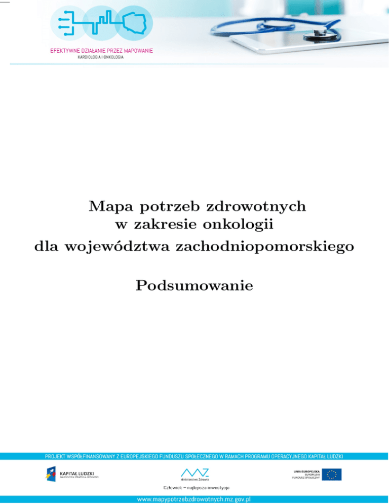 Mapa potrzeb zdrowotnych w zakresie onkologii dla województwa zachodniopomorskiego Podsumowanie Spis treści Informacje wstępne 3 I 3 Aspekty demograficzne i epidemiologiczne Struktura ludności 3 Demografia powiatów województwa zachodniopomorskiego 3 Zachorowania na nowotwory złośliwe 4 Zgony z powodu chorób onkologicznych 4 II 6 Analizy stanu i wykorzystania zasobów Lecznictwo szpitalne 6 1 Szpitale udzielające świadczeń onkologicznych 6 2 Analiza świadczeń szpitalnych 7 3 Analiza świadczeń chemioterapeutycznych 8 4 Analiza świadczeń radioterapeutycznych 9 Obszar Ambulatoryjnej Opieki Specjalistycznej 9 Obszar Podstawowej Opieki Zdrowotnej III 10 Prognozy potrzeb zdrowotnych 11 Prognoza demograficzna 11 1 Prognozowana struktura ludności 11 2 Prognozowana demografia powiatów województwa zachodniopomorskiego 11 Prognoza liczby chorych 11 1 Prognoza zachorowalności 11 2 Prognoza 5-letniej chorobowości 11 Prognoza świadczeń 11 1 Zakres szpitalny 11 2 Prognoza świadczań Pozytonowej Tomografii Emisyjnej (PET) 12 3 Zakres chemioterapia 12 4 Zakres radioterapia 12 2 Informacje wstępne 1. W niniejszym dokumencie uwzględniono rozpoznania onkologiczne z zakresu nowotworów złośliwych za wyjątkiem nieczerniakowych nowotworów skóry oraz nowotworów układu chłonnego i krwiotwórczego (kody: C00-C43, C45-C80, D05 wg Międzynarodowej Statystycznej Klasyfikacji Chorób i Problemów Zdrowotnych Rewizja dziesiąta) 2. W celu określenia liczby nowo zdiagnozowanych pacjentów onkologicznych w latach 2010-2012 wykorzystano dane Krajowego Rejestru Nowotworów uzupełnione o informacje sprawozdawcze Narodowego Funduszu Zdrowia. Działanie to nie polegało na bezkrytycznym połączeniu ww. zbiorów. Z bazy KRN wyłączeni zostali pacjenci, którzy mimo wpisu pierwszorazowego zostali, na podstawie udzielonych im świadczeń, zakwalifikowani jako pacjenci rozpoznani w latach wcześniejszych (tzw. follow-up). Natomiast z bazy NFZ wyłączeni zostali pacjenci, w przypadku których sprawozdano świadczenia z innym nowotworem niż w bazie KRN (nadrzędność bazy KRN nad bazą NFZ). Z tej grupy również zostali wyłączeni pacjenci, których ścieżka leczenia nie była adekwatna dla leczenia nowo zdiagnozowanego pacjenta z danym typem nowotworu. Informacje o ścieżce leczenia (obejmującej okres 365 dni od pierwszej daty pojawienia się w systemie) uwzględniały informacje o sprawozdanych procedurach wg ICD-9, sprawozdanych świadczeniach chemioterapii i radioterapii oraz informacje o zgonie pacjenta. Informacje zawarte w ścieżce leczenia pacjenta posłużyły również do oszacowania stadium zaawansowania nowotworu dla pacjentów, w przypadku których nie było określone stadium w bazie KRN 3. Tak przygotowana informacja o pacjentach posłużyła również do przekwalifikowania części świadczeń szpitalnych sprawozdanych z rozpoznaniem D37-D48 (związanych z leczeniem zachowawczym lub zabiegowym) na odpowiednie grupy rozpoznań onkologicznych. Cześć I , Aspekty demograficzne i epidemiologiczne Struktura ludności W 2014 roku województwo zachodniopomorskie zamieszkiwało 1,7 mln osób, co stanowi ok 4,5% ludności kraju. Było to 11. pod względem liczby ludności województwo w Polsce. Populacja województwa zachodniopomorskiego była, w demograficznym sensie, młodsza niż populacja Polski ogółem (udział grupy w wieku 65+ w ludności województwa zachodniopomorskiego wyniósł 14,6%, dla Polski ogółem 15,3%). Demografia powiatów województwa zachodniopomorskiego 1. Największą populacją cechował się Szczecin (407 tys., 24% populacji województwa). Natomiast najmniejsza liczba ludności (38 tys., 2,2% populacji województwa) zamieszkiwała powiat łobeski. 2. Jeśli zaś chodzi o zaawansowanie procesu starzenia się ludności w powiatach województwa zachodniopomorskiego to największe udziały osób w wieku 65 lat i więcej odnotowano w powiatach: m. Koszalin (17,6%), m. Szczecin i m. Świnoujście (17,4%), zaś najmniejszy w powiatach polickim (9,7%), koszalińskim (11,8%), goleniowskim (12,6%) i gryfińskim (12,9%.) 3 Zachorowania na nowotwory złośliwe 1. 2012 roku w woj. zachodniopomorskim zdiagnozowano 7 858 nowych przypadków nowotworów złośliwych, co było 7 najniższą wartością w kraju. W przeliczeniu na 100 tys. ludności było to 456 osób – 3. najwyższa wartość w kraju. 2. W Polsce w 2012 r. grupy nowotworów były zróżnicowane pod względem stadium zaawansowania choroby. Najwcześniej wykrywanymi nowotworami złośliwymi były nowotwory tarczycy i trzonu macicy - dla tych nowotworów był najmniejszy udział pacjentów w stadium IV. Z kolei na drugim biegunie znajdowały się nowotwory złośliwe trzustki, wątroby, pęcherzyka żółciowego. W tych przypadkach nowotwór u co najmniej 55% pacjentów rozpoznawano w IV stadium zaawansowania. 3. W woj. zachodniopomorskim najczęściej rozpoznawanymi nowotworami były nowotwory oskrzela i płuca (1 352 przypadki), nowotwory piersi (945), jelita grubego (653), gruczołu krokowego (665), pęcherza moczowego (368) oraz odbytnicy i odbytu (319). Zgony z powodu chorób onkologicznych 1. Nowotwory złośliwe są drugą co do częstości przyczyną zgonów mieszkańców woj. zachodniopomorskiego, podobnie jak i wszystkich pozostałych województw. W latach 2011-2013 r. były przyczyną 22,3% ogółu zgonów mieszkańców województwa (24,5% zgonów mężczyzn i 19,9% zgonów kobiet) i są to odsetki nieco niższe niż w całej Polsce (odpowiednio 24,5%, 26,0% i 22,8%). 2. Współczynnik rzeczywisty zgonów z powodu ogółu nowotworów mieszkańców woj. zachodniopomorskiego wynosił 255 na 100 tys. ludności i jest on wyższy od ogólnopolskiego o 4,7%, przy czym nadwyżka ta jest wyższa w przypadku kobiet (7,1%) niż mężczyzn (2,7%). Po uwzględnieniu różnic wynikających ze struktury wieku województwa (wartości SMR) nadwyżka umieralności mieszkańców województwa w stosunku do po