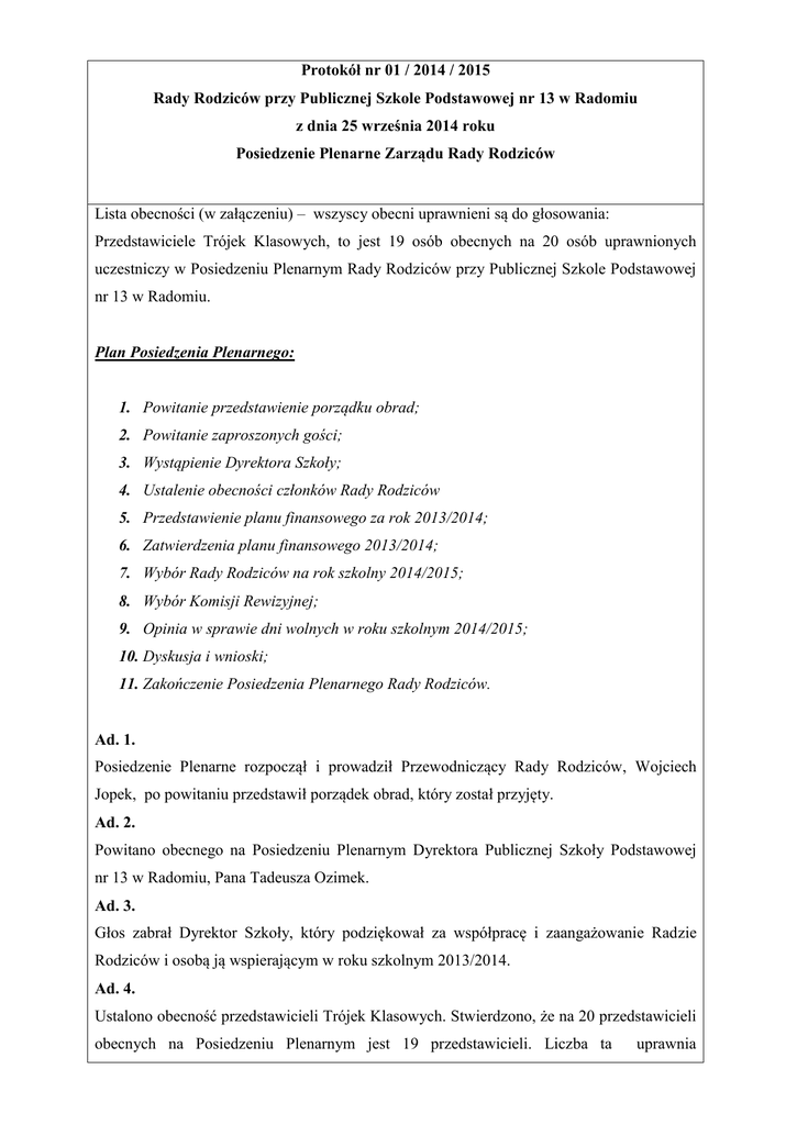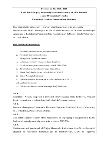 Protokół nr 01 / 2014 / 2015 Rady Rodziców przy Publicznej Szkole Podstawowej nr 13 w Radomiu z dnia 25 września 2014 roku Posiedzenie Plenarne Zarządu Rady Rodziców Lista obecności (w załączeniu) – wszyscy obecni uprawnieni są do głosowania: Przedstawiciele Trójek Klasowych, to jest 19 osób obecnych na 20 osób uprawnionych uczestniczy w Posiedzeniu Plenarnym Rady Rodziców przy Publicznej Szkole Podstawowej nr 13 w Radomiu. Plan Posiedzenia Plenarnego: 1. Powitanie przedstawienie porządku obrad; 2. Powitanie zaproszonych gości; 3. Wystąpienie Dyrektora Szkoły; 4. Ustalenie obecności członków Rady Rodziców 5. Przedstawienie planu finansowego za rok 2013/2014; 6. Zatwierdzenia planu finansowego 2013/2014; 7. Wybór Rady Rodziców na rok szkolny 2014/2015; 8. Wybór Komisji Rewizyjnej; 9. Opinia w sprawie dni wolnych w roku szkolnym 2014/2015; 10. Dyskusja i wnioski; 11. Zakończenie Posiedzenia Plenarnego Rady Rodziców. Ad. 1. Posiedzenie Plenarne rozpoczął i prowadził Przewodniczący Rady Rodziców, Wojciech Jopek, po powitaniu przedstawił porządek obrad, który został przyjęty. Ad. 2. Powitano obecnego na Posiedzeniu Plenarnym Dyrektora Publicznej Szkoły Podstawowej nr 13 w Radomiu, Pana Tadeusza Ozimek. Ad. 3. Głos zabrał Dyrektor Szkoły, który podziękował za współpracę i zaangażowanie Radzie Rodziców i osobą ją wspierającym w roku szkolnym 2013/2014. Ad. 4. Ustalono obecność przedstawicieli Trójek Klasowych. Stwierdzono, że na 20 przedstawicieli obecnych na Posiedzeniu Plenarnym jest 19 przedstawicieli. Liczba ta uprawnia do podejmowania uchwał. Ad. 5. W dalszej kolejności Skarbnik, Pani Marzena Bochniewska-Pająk przedstawiła sprawozdanie finansowe za rok szkolny 2013/2014. Obecni przedstawiciele z poszczególnych klas mogli zapoznać się osobiście z zestawieniem przychodów i wydatków. Ad. 6. Zestawienie przychodów i wydatków w roku szkolnym 2013/2014 poddane zostało w głosowaniu jawnym. Jednogłośnie obecni przedstawiciele Trójek Klasowych przyjęli przedstawione zestawienie przychodów i wydatków. Ad. 7. Obecni przedstawiciele na Posiedzeniu Plenarnym zgłosili kandydatury do Rady Rodziców na rok szkolny 2014/2015. Zgłoszone osoby to: Wojciech Jopek, Rafał Słomka, Luiza Przeniosło oraz Marzena Bochniewska-Pająk. W toku przeprowadzonego głosowania wybrano: - Wojciech Jopek, Przewodniczący Rady Rodziców; - Rafał Słomka, Zastępca Przewodniczącego Rady Rodziców; - Luiza Przeniosło, Sekretarz; - Marzena Bochniewska-Pająk. Skarbnik. Po zakończonych wyborach głos zabrał Wojciech Jopek, który podziękował za udzielenie mu zaufania co do dalszej współpracy z Dyrekcją oraz Gronem Pedagogicznym w roku szkolnym 2014/2015. Ad. 8. W dalszej kolejności podczas Posiedzenia zgłoszono kandydatury do Komisji Rewizyjnej. Zgłoszone osoby to: Ewa Senderowska, Adam Jamrozy, Paweł Szczepanowski. W toku przeprowadzonego głosowania wybrano: - Adam Jamrozy, Przewodniczący Komisji Rewizyjnej; - Ewa Senderowska i Paweł Szczepanowski, Członek. Po zakończonych wyborach głos zabrał Adam Jamrozy, który również podziękował za obdarzone zaufanie. Ad. 9. Następnie Dyrektor Szkoły, Pan Tadeusz Ozimek przedstawił dni wolne od nauki w roku szkolnym 2014/2015, tzw. dni dyrektorskie. W obecnym roku szkolnym są to następujące dni: 13.10.2014, 10.11.2014, 2 i 5.01.2015, 01.04.2015, 5.06.2015. Przedstawione terminy zostały przyjęte w głosowaniu jawnym jednogłośnie. Ad. 10. Podczas dyskusji i wolnych wniosków Przewodniczący Rady Rodziców, Wojciech Jopek złożył wniosek ustny dotyczący utworzenia dodatkowej zakładki „Rada Rodziców” na stronie internetowej Szkoły w zakładce „Informacja dla rodziców”. Wniosek pisemny zostanie przedłożony w terminie późniejszym. Wniosek ten został poparty przez obecnych przedstawicieli Trójek Klasowych. W dalszej dyskusji ustalono, że w roku szkolnym 2014/2015 nie będzie podwyższana składna na Radę Rodziców, która została uchwalona , Uchwałą nr 2/2012/2013 z dnia 26.09.2012 roku. Następnie głos zabrał Pan Tadeusz Ozimek, który poinformował, że 100-lecie Szkoły z miesiąca czerwca 2015 roku zostało przełożone na miesiąc wrzesień 2015 roku z przyczyn nie zależnych od Szkoły. Na zakończenie głos zabrał Wojciech Jopek, który podziękował jeszcze raz za obdarzone zaufanie oraz poprosił wszystkich przedstawicieli Trójek Klasowych o zachęcanie w swoich klasach jak i w środowisk poza szkolnym o dokonywanie wpłat na rzecz Rady Rodziców. Niniejszy Protokół zostanie umieszczony na stronie internetowej Szkoły bezzwłocznie po zrealizowaniu wniosku przez Dyrekcję Szkoły o utworzenie dodatkowej zakładki „Rada Rodziców” na stronie internetowej Szkoły w zakładce „Informacja dla rodziców”. Przewodniczący Rady Rodziców przy PSP 13 w Radomiu / - / Wojciech Jopek Podpis na oryginale