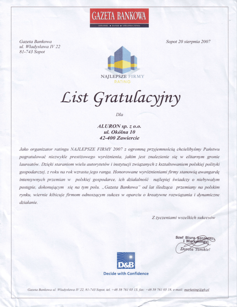 GazetaBankowa ul. WadysławaIV 22 Bl-713Sopot Sopor20 sierpnia2007 NĄJLEPSZE }.IRMY List gratuforyry Dla ALURON sp.z o.o. ul. okólna 10 42-400Zuwiercie Jako organizator ratingu NAJLEPSZE FIRMY 2007 z ogromną przyjemnościąchcielibyśmyPaństwu pogratulować niezwykle prestizowego wyróznienia, jakim jest znalezienie się w elitarnym gronie polskiej polityki laureatów. Dzięki staraniom wielu autorytetów i insĘtucji nviązanych z l<ształtowaniem gospodarczej, z roku na rok wzrastajego ranga, Honorowane wyróżnieniamifirmy stanowią awangardę intensyvnych przemian w polskiej gospodarce, ich dziatalność najlepiej świadczy o niebywałym postępie, dokonującym się na Ęm polu. ,,Gazeta Banknwa', od lat śledząca przemiany na polskim rynku, wiernie kibicuje firmom odnoszącym sukces w oparciu o lcreatywneron,uiązania i dynamiczne działanie. Z zyczeniami wszelkich sukcesów NNlt/l sNr/z Ę=llŃ t r ( - t D. l t I ! F - ! Decidewith Confidence Gazeta Bankowa ul, WłaĄstawa IV 22, 8}-743 Sopot, tel. +18 58 761 05 13,fax: +48 58 761 05 ]8, e-mail: [email protected]