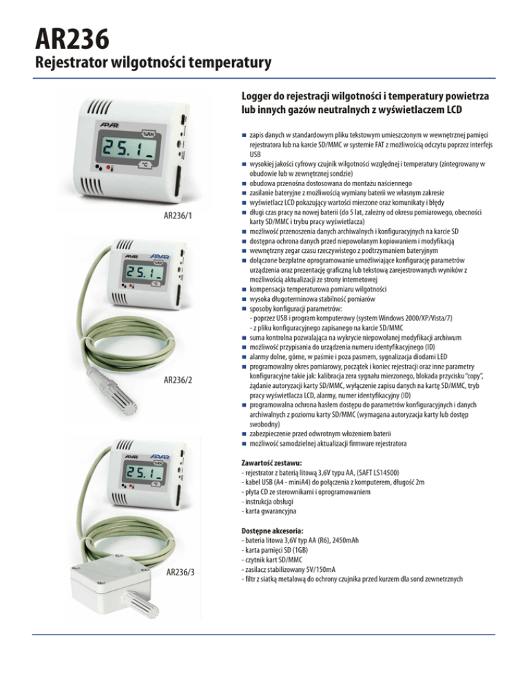 AR236 Rejestrator wilgotności temperatury Logger do rejestracji wilgotności i temperatury powietrza lub innych gazów neutralnych z wyświetlaczem LCD n zapis danych w standardowym pliku tekstowym umieszczonym w wewnętrznej pamięci AR236/1 AR236/2 rejestratora lub na karcie SD/MMC w systemie FAT z możliwością odczytu poprzez interfejs USB n wysokiej jakości cyfrowy czujnik wilgotności względnej i temperatury (zintegrowany w obudowie lub w zewnętrznej sondzie) n obudowa przenośna dostosowana do montażu naściennego n zasilanie bateryjne z możliwością wymiany baterii we własnym zakresie n wyświetlacz LCD pokazujący wartości mierzone oraz komunikaty i błędy n długi czas pracy na nowej baterii (do 5 lat, zależny od okresu pomiarowego, obecności karty SD/MMC i trybu pracy wyświetlacza) n możliwość przenoszenia danych archiwalnych i konfiguracyjnych na karcie SD n dostępna ochrona danych przed niepowołanym kopiowaniem i modyfikacją n wewnętrzny zegar czasu rzeczywistego z podtrzymaniem bateryjnym n dołączone bezpłatne oprogramowanie umożliwiające konfigurację parametrów urządzenia oraz prezentację graficzną lub tekstową zarejestrowanych wyników z możliwością aktualizacji ze strony internetowej n kompensacja temperaturowa pomiaru wilgotności n wysoka długoterminowa stabilność pomiarów n sposoby konfiguracji parametrów: - poprzez USB i program komputerowy (system Windows 2000/XP/Vista/7) - z pliku konfiguracyjnego zapisanego na karcie SD/MMC n suma kontrolna pozwalająca na wykrycie niepowołanej modyfikacji archiwum n możliwość przypisania do urządzenia numeru identyfikacyjnego (ID) n alarmy dolne, górne, w paśmie i poza pasmem, sygnalizacja diodami LED n programowalny okres pomiarowy, początek i koniec rejestracji oraz inne parametry konfiguracyjne takie jak: kalibracja zera sygnału mierzonego, blokada przycisku “copy”, żądanie autoryzacji karty SD/MMC, wyłączenie zapisu danych na kartę SD/MMC, tryb pracy wyświetlacza LCD, alarmy, numer identyfikacyjny (ID) n programowalna ochrona hasłem dostępu do parametrów konfiguracyjnych i danych archiwalnych z poziomu karty SD/MMC (wymagana autoryzacja karty lub dostęp swobodny) n zabezpieczenie przed odwrotnym włożeniem baterii n możliwość samodzielnej aktualizacji firmware rejestratora Zawartość zestawu: - rejestrator z baterią litową 3,6V typu AA, (SAFT LS14500) - kabel USB (A4 - miniA4) do połączenia z komputerem, długość 2m - płyta CD ze sterownikami i oprogramowaniem - instrukcja obsługi - karta gwarancyjna AR236/3 Dostępne akcesoria: - bateria litowa 3,6V typ AA (R6), 2450mAh - karta pamięci SD (1GB) - czytnik kart SD/MMC - zasilacz stabilizowany 5V/150mA - filtr z siatką metalową do ochrony czujnika przed kurzem dla sond zewnetrznych Dane Techniczne Dane Montażowe wewnętrzna lub zewnętrzna w osłonie ochronnej (ABS, szerokość szczelin 1mm) Sonda pomiarowa Zakres pomiarowy - wilgotność 0 ÷ 100 %RH - temperatura -30 ÷ 80 °C Wymiary 80x80x25 mm Mocowanie 4 wkręty M3 Materiał ABS UL94-V0 0,1 %RH i 0,1 °C Histereza ±1% RH Stabilność długoterminowa <0,5% RH/rok Czas odpowiedzi (63%) 10s (przepływ powietrza > 1m/s) Okres pomiaru i zapisu programowalny od 10s do 24 godz. Środowisko pracy powietrze i gazy neutralne, bezpyłowe Interfejs do komunikacji z komputerem USB, sterowniki kompatybilne z systemem Windows/2000/XP/Vista/7 STATUS Rozdzielczość pomiarowa 80 widok z przodu COPY ±0,5°C (w zakresie 20 ÷ 30°C) ±0,5 ÷ 1,8°C (w pozostałym zakresie) READ WRITE - temperatura SD/MMC CARD ±3 %RH (w zakresie 20 ÷ 80 %RH) ±3 ÷ 5 %RH (w pozostałym zakresie) widok z boku - wilgotność USB Dokładność pomiaru 25 widok z tyłu Pamięć danych (nieulotna) - wewnętrzna 4MB, typu FLASH, system plików FAT12, zapis do 75 tys. pomiarów - zewnętrzna (złącze z wyrzutnikiem) karta SD/MMC, FAT16, FAT32, zalecany rozmiar ≤ 1GB i FAT16, maksymalny rozmiar 2GB Zegar czasu rzeczywistego (RTC) kwarcowy, data (rrrr:mm:dd), czas (gg:mm:ss), uwzględnia lata przestępne Sygnalizacja optyczna wyświetlacz LCD, 4 diody LED: „READ/WRITE”, „Status”, 2 alarmy Wyświetlacz LCD (7-segmentowy) Ilość cyfr 3, wysokość cyfr 10mm Zasilanie bateria litowa 3,6V typ AA (R6), 2450mAh, (SAFT LS14500) Czas pracy nowej baterii (1) do 5 lat (w temperaturze 20 ÷ 30°C) 80 Zewnętrzne sondy pomiarowe w obudowie z przewodem Znamionowe warunki użytkowania -20 ÷ 70°C, <100 %RH (bez kondensacji) Obudowa naścienna, materiał ABS UL94-V0, kolor biały Stopień ochrony IP20 (brak ochrony przed wnikaniem wody i kondensacją) Wymiary obudowy 80 x 80 x 25 mm Pozycja pracy dowolna Masa ~97g (z baterią) z przewodem ~1500 mm 62 ~1500 mm otwory montażowe Φ4,3 mm 58 46 (1) n czas pracy zależy od okresu pomiarowego, obecności karty SD/MMC, trybu pracy wyświetlacza LCD oraz temperatury otoczenia : - 5 lat (okres pomiaru >10 min, zapis w pamięci wewnętrznej, dane kopiowane wyłącznie przez USB, LCD w trybie ekonomicznym, 20÷30°C) - 20 miesięcy (okres pomiaru >10 min, zapis w pamięci wewnętrznej, dane kopiowane wyłącznie przez USB, LCD w trybie ciągłym, 20÷30°C) - 7 miesięcy (okres pomiaru 10 s, pamięć wewnętrzna, dane kopiowane wyłącznie przez USB, 20÷30°C) - 1,5 roku (okres pomiaru > 10 min, zapis na karcie SD/MMC, LCD w trybie ekonomicznym, 20÷30°C) - 4 miesiące (okres pomiaru 10 s, zapis na karcie SD/MMC, 20÷30°C) n nieużywana karta SD/MMC zainstalowana w gnieździe również skraca czas pracy baterii n jednorazowe przeniesienie całej zawartości pamięci wewnętrznej (4MB) na kartę SD/MMC trwa około 2 min i zużywa do 2 mAh pojemności baterii (testowane na kartach pamięci firm SanDisk, Kingston) n użycie akcesoryjnego zasilacza wydłuży czas pracy nowej baterii do około 8 lat (20÷30°C) 15 43 34 64 Sposób Zamawiania AR236 / o Rodzaj sondy pomiarowej zintegrowana wewnętrzna (standard) zewnętrzna z przewodem 1,5m zewnętrz