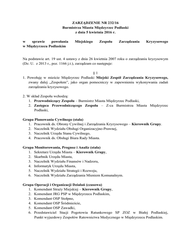 ZARZĄDZENIE NR 232/16 Burmistrza Miasta Międzyrzec Podlaski z dnia 5 kwietnia 2016 r. w sprawie powołania w Międzyrzecu Podlaskim Miejskiego Zespołu Zarządzania Kryzysowego Na podstawie art. 19 ust. 4 ustawy z dnia 26 kwietnia 2007 roku o zarządzaniu kryzysowym (Dz. U. z 2013 r., poz. 1166 j.t.), zarządzam co następuje: §1 1. Powołuję w mieście Międzyrzec Podlaski Miejski Zespół Zarządzania Kryzysowego, zwany dalej „Zespołem”, jako organ pomocniczy w zapewnieniu wykonywania zadań zarządzania kryzysowego. 2. W skład Zespołu wchodzą: 1. Przewodniczący Zespołu – Burmistrz Miasta Międzyrzec Podlaski, 2. Zastępca Przewodniczącego Zespołu – Z-ca Burmistrza Miasta Międzyrzec Podlaski, Grupa Planowania Cywilnego (stała) 1. Pracownik ds. Obrony Cywilnej i Zarządzania Kryzysowego – Kierownik Grupy. 2. Naczelnik Wydziału Obsługi Organizacyjno-Prawnej, 3. Naczelnik Urzędu Stanu Cywilnego, 4. Pracownik ds. Obsługi Biura Rady Miasta. Grupa Monitorowania, Prognoz i Analiz (stała) 1. Sekretarz Urzędu Miasta – Kierownik Grupy, 2. Skarbnik Urzędu Miasta, 3. Naczelnik Wydziału Finansów i Nadzoru, 4. Informatyk Urzędu Miasta, 5. Naczelnik Wydziału Strategii i Rozwoju, 6. Naczelnik Wydziału Zarządzania Mieniem Komunalnym. Grupa Operacji i Organizacji Działań (czasowa) 1. Komendant Straży Miejskiej – Kierownik Grupy, 2. Komendant JRG PSP w Międzyrzecu Podlaskim, 3. Komendant OSP Stołpno, 4. Komendant OSP Śródmieście, 5. Komendant OSP Zawadki, 6. Przedstawiciel Stacji Pogotowia Ratunkowego SP ZOZ w Białej Podlaskiej, Punkt wyjazdowy Zespołów Ratownictwa Medycznego w Międzyrzecu Podlaskim. Grupa Zabezpieczenia Logistycznego (czasowa) 1. Dyrektor PUK Sp. z o.o. w Międzyrzecu Podlaskim – Kierownik Grupy, 2. Komendant Komisariatu Policji w Międzyrzecu Podlaskim, 3. Kierownik Posterunku Energetycznego PGE Dystrybucja S.A. w Międzyrzecu Podlaskim, 4. Dyrektor VEOLIA Wschód Sp. z o.o. Zakład Międzyrzec Podlaski, 5. Prezes Przedsiębiorstwa PKS w Międzyrzecu Podlaskim. Grupa Opieki Zdrowotnej i Pomocy Socjalno-Bytowej (czasowa) 1. Dyrektor SP ZOZ w Międzyrzecu Podlaskim – Kierownik Grupy, 2. Kierownik Miejskiego Ośrodka Pomocy Społecznej w Międzyrzecu Podlaskim, 3. Naczelnik Wydziału Edukacji, Kultury i Sportu. 4. Naczelnik Wydziału Ochrony Środowiska i Rolnictwa. 3. Przewodniczący, w zależności od uzasadnionych potrzeb, do składu Zespołu może powoływać specjalistów, ekspertów, przedstawicieli społecznych organizacji ratowniczych, organów administracji publicznej oraz inne osoby. 4. Kierownicy Grup wybierani są przez Przewodniczącego Zespołu. 5. Włączenie w skład Zespołu pracowników, o których mowa w pkt 3, odbywa się na wniosek Przewodniczącego. 6. Siedzibą Zespołu jest Urząd Miasta Międzyrzec Podlaski, ul. Pocztowa 8, a terenem działania jest obszar miasta Międzyrzec Podlaski. 7. Przewodniczący Zespołu, może zarządzić posiedzenie Zespołu w innym miejscu niż określone w pkt 6. 1. 2. 3. 4. §2 Posiedzeniom Zespołu przewodniczy Burmistrz Miasta a w razie jego nieobecności Z-ca Burmistrza Miasta. Zespół wykonuje zadania zawarte w Ustawie o zarządzaniu kryzysowym z dnia 26 kwietnia 2007 roku i rozporządzeniach wykonawczych do wymienionej ustawy. Do zadań Zespołu należy w szczególności: - Ocena występujących i potencjalnych zagrożeń mogących mieć wpływ na bezpieczeństwo publiczne i prognozowanie tych zagrożeń, - Przygotowanie propozycji działań i przedstawienie burmistrzowi wniosków dotyczących wykonania, zmiany lub zaniechania działań ujętych w planie reagowania kryzysowego, - Przekazywanie do publicznej wiadomości informacji związanych z zagrożeniami, - Opiniowanie Miejskiego Planu Zarządzania Kryzysowego. Organizację i tryb pracy zespołu określa „Regulamin Pracy Miejskiego Zespołu Zarządzania Kryzysowego w Międzyrzecu Podlaskim” §3 Funkcjonowanie Zespołu finansowane jest ze środków budżetu Miasta. §4 Obsługę kancelaryjno-biurową Zespołu zapewnia podinspektor ds. Obrony Cywilnej i Zarządzania Kryzysowego – Koordynator BIP. §5 Tracą moc zarządzenia: 1. Zarządzenie Nr 51/2003 Burmistrza Miasta Międzyrzeca Podlaskiego z dnia 30 maja 2003 r. w sprawie powołania Gminnego Zespołu Reagowania. 2. Zarządzenie Nr 125/2007 Burmistrza Miasta Międzyrzeca Podlaskiego z dnia 12 listopada 2007 r. w sprawie powołania Miejskiego Zespołu Zarządzania Kryzysowego. 3. Zarządzenie Nr 369/2009 Burmistrza Miasta Międzyrzeca Podlaskiego z dnia 26 czerwca 2009 r. w sprawie zmiany zarządzenia w sprawie powołania Miejskiego Zespołu Zarządzania Kryzysowego. 4. Zarządzenie Nr 204/2012 Burmistrza Miasta Międzyrzeca Podlaskiego z dnia 27 kwietnia 2012 r. w sprawie zmiany zarządzenia w sprawie powołania Miejskiego Zespołu Zarządzania Kryzysowego. §6 Wykonanie zarządzenia powierzam Przewodniczącemu Zespołu. §7 Zarządzenie wchodzi w życie z dniem podpisania i podlega przekazaniu jednostkom organizacyjnym i pomocniczym miasta Międzyrzeca Podlaskiego oraz komórkom organizacyjnym Urzędu Miasta.
