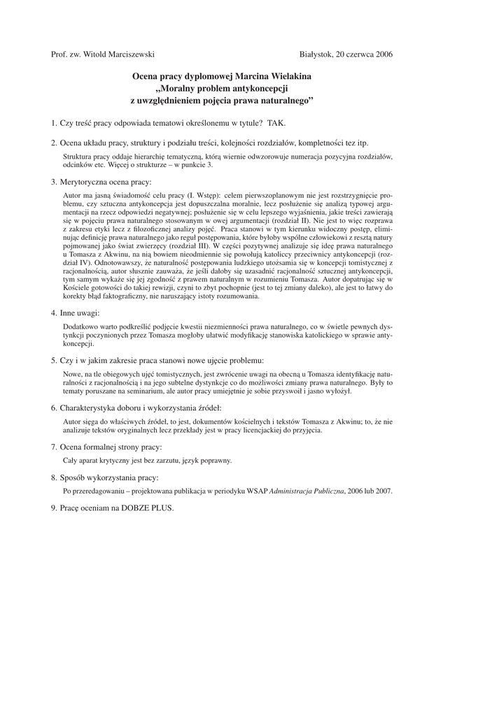 Prof. zw. Witold Marciszewski Białystok, 20 czerwca 2006 Ocena pracy dyplomowej Marcina Wielakina „Moralny problem antykoncepcji z uwzgl˛ednieniem poj˛ecia prawa naturalnego” 1. Czy treść pracy odpowiada tematowi określonemu w tytule? TAK. 2. Ocena układu pracy, struktury i podziału treści, kolejności rozdziałów, kompletności tez itp. Struktura pracy oddaje hierarchi˛e tematyczna,˛ która˛ wiernie odwzorowuje numeracja pozycyjna rozdziałów, odcinków etc. Wi˛ecej o strukturze – w punkcie 3. 3. Merytoryczna ocena pracy: Autor ma jasna˛ świadomość celu pracy (I. Wst˛ep): celem pierwszoplanowym nie jest rozstrzygni˛ecie problemu, czy sztuczna antykoncepcja jest dopuszczalna moralnie, lecz posłużenie si˛e analiza˛ typowej argumentacji na rzecz odpowiedzi negatywnej; posłużenie si˛e w celu lepszego wyjaśnienia, jakie treści zawieraja˛ si˛e w poj˛eciu prawa naturalnego stosowanym w owej argumentacji (rozdział II). Nie jest to wi˛ec rozprawa z zakresu etyki lecz z filozoficznej analizy poj˛eć. Praca stanowi w tym kierunku widoczny post˛ep, eliminujac ˛ definicj˛e prawa naturalnego jako reguł post˛epowania, które byłoby wspólne człowiekowi z reszta˛ natury pojmowanej jako świat zwierz˛ecy (rozdział III). W cz˛eści pozytywnej analizuje si˛e ide˛e prawa naturalnego u Tomasza z Akwinu, na nia˛ bowiem nieodmiennie si˛e powołuja˛ katoliccy przeciwnicy antykoncepcji (rozdział IV). Odnotowawszy, że naturalność post˛epowania ludzkiego utożsamia si˛e w koncepcji tomistycznej z racjonalnościa,˛ autor słusznie zauważa, że jeśli dałoby si˛e uzasadnić racjonalność sztucznej antykoncepcji, tym samym wykaże si˛e jej zgodność z prawem naturalnym w rozumieniu Tomasza. Autor dopatrujac ˛ si˛e w Kościele gotowości do takiej rewizji, czyni to zbyt pochopnie (jest to tej zmiany daleko), ale jest to łatwy do korekty bład ˛ faktograficzny, nie naruszajacy ˛ istoty rozumowania. 4. Inne uwagi: Dodatkowo warto podkreślić podj˛ecie kwestii niezmienności prawa naturalnego, co w świetle pewnych dystynkcji poczynionych przez Tomasza mogłoby ułatwić modyfikacj˛e stanowiska katolickiego w sprawie antykoncepcji. 5. Czy i w jakim zakresie praca stanowi nowe uj˛ecie problemu: Nowe, na tle obiegowych uj˛eć tomistycznych, jest zwrócenie uwagi na obecna˛ u Tomasza identyfikacj˛e naturalności z racjonalnościa˛ i na jego subtelne dystynkcje co do możliwości zmiany prawa naturalnego. Były to tematy poruszane na seminarium, ale autor pracy umiej˛etnie je sobie przyswoił i jasno wyłożył. 6. Charakterystyka doboru i wykorzystania źródeł: Autor si˛ega do właściwych źródeł, to jest, dokumentów kościelnych i tekstów Tomasza z Akwinu; to, że nie analizuje tekstów oryginalnych lecz przekłady jest w pracy licencjackiej do przyj˛ecia. 7. Ocena formalnej strony pracy: Cały aparat krytyczny jest bez zarzutu, j˛ezyk poprawny. 8. Sposób wykorzystania pracy: Po przeredagowaniu – projektowana publikacja w periodyku WSAP Administracja Publiczna, 2006 lub 2007. 9. Prac˛e oceniam na DOBZE PLUS.