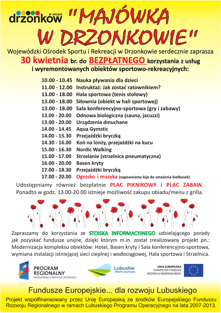 "MAJÓWKA W DRZONKOWIE" Wojewódzki Oœrodek Sportu i Rekreacji w Drzonkowie serdecznie zaprasza 30 kwietnia br. do BEZP£ATNEGO korzystania z us³ug i wyremontowanych obiektów sportowo-rekreacyjnych: 10.00 - 10.45 Nauka p³ywania dla dzieci 11.00 - 12.00 Instrukta¿: Jak zostaæ ratownikiem? 13.00 - 18.00 Hala sportowa (tenis sto³owy) 13.00 - 18.00 Si³ownia (obiekt w hali sportowej) 13.00 - 18.00 Sala konferencyjno-sportowa (gry i zabawy) 13.00 - 20.00 Odnowa biologiczna (sauna, jacuzzi) 13.00 - 20.00 Urz¹dzenia dmuchane 14.00 - 14.45 Aqua Gymstic 14.00 - 15.30 Przeja¿d¿ki bryczk¹ 14.30 - 16.00 Koñ na lon¿y, przeja¿d¿ki na kucu 15.00 - 16.30 Nordic Walking 15.00 - 17.00 Strzelanie (strzelnica pneumatyczna) 16.00 - 20.00 Basen kryty 17.00 - 18.30 Przeja¿d¿ki bryczk¹ 17.00 - 20.00 Ognisko i muzyka (zapewniamy kije do sma¿enia kie³basek) Udostêpniamy równie¿ bezp³atnie PLAC PIKNIKOWY i PLAC ZABAW. Ponadto w godz. 13.00-20.00 istnieje mo¿liwoœæ zakupu obiadu/menu z grilla. Zapraszamy do korzystania ze STOISKA INFORMACYJNEGO udzielaj¹cego porady jak pozyskaæ fundusze unijne, dziêki którym m.in. zosta³ zrealizowany projekt pn.: Modernizacja kompleksu obiektów: Hotel, Basen kryty i Sala konferencyjno-sportowa, wymiana instalacji istniej¹cej sieci cieplnej i wodoci¹gowej, Hala sportowa i Strzelnica. Warte zachodu Fundusze Europejskie... dla rozwoju Lubuskiego Projekt wspó³finansowany przez Uniê Europejsk¹ ze œrodków Europejskiego Funduszu Rozwoju Regionalnego w ramach Lubuskiego Programu Operacyjnego na lata 2007-2013.
