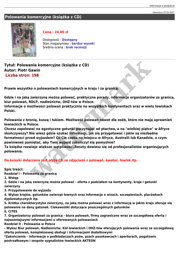 Informacje o produkcie Utworzono 07-03-2017 Polowania komercyjne (książka z CD) Cena : 24,00 zł Dostępność : Dostępny Stan magazynowy : bardzo wysoki Średnia ocena : brak recenzji er m ar k Tytuł: Polowania komercyjne (książka z CD) Autor: Piotr Gawin Liczba stron: 198 Prawie wszystko o polowaniach komercyjnych w kraju i za granicą. Gdzie i na jaką zwierzynę można polować, praktyczne porady, informacje organizatorów za granicą, biur polowań, RDLP, nadleśnictw, OHZ-tów w Polsce. Informacje o możliwości polowań praktycznie na wszystkich kontynentach oraz w wielu łowiskach Polski. at Polowania z bronią, kuszą i łukiem. Możliwość polowań nawet dla osób, które nie mają uprawnień łowieckich w Polsce. Chcesz zapolować na egzotyczne gatunki poczynając od ptactwa, a na "wielkiej piątce" w Afryce skończywszy? Nie wiesz gdzie szukać informacji, jak się przygotować i jakie są niezbędne formalnosci przed wyjazdem? Co Cię czeka na miejscu w Afryce, Australii lub Kanadzie, o czym powinieneś pamiętać, aby Twój wyjazd zakończył się pomyślnie? Ta księżka rozwieje większe wątpliwosci.Reszty dowiesz się od profesjonalistów organizujących polowania. w Do ksiazki dołączona jest płyta CD ze zdjęciami z polowań, kwater, łowisk itp. Spis treści: Rozdział I - Polowania za granicą 1. Wstęp 2. Gdzie i na jaką zwierzynę można polować - oferta z podziałem na kontynenty, kraje i gatunki zwierzyny 3. Przygotowanie do wyjzadu 4. Wykaz krajów, gatunków zwierząt łownych oraz informacje o wizach, szczepieniach, placówkach dyplomatycznych itp. 5. Krótka charakterystyka zwierzyny, na jaką można polować wraz z informacją w jakim kraju oferuje się polowanie na dany gatunek. Ciekawostki dotyczące poszczególnych gatunków 6. CITES 7. Organizatorzy polowań za granicą - biura polowań, firmy zagraniczne wraz ze szczegółową ofertą i najważniejszymi informacjami o oferowanych polowaniach Rozdział II - Polowania w Polsce - Wykaz Biur polowań, Nadleśnictw, Kół łowieckich i OHZ-tów oferujących polowania wraz ze szczegółową ofertą polowań, kompleksowej obsługi i informacjami dodatkowymi *Zakończenie - informacje o podkładaczach psów, psach posokowcach i aporterach, pogotowiu postrzałkowym i zespole sygnalistów łowieckich AKTEON w at er m ar k *Skrócony łowiecki słownik PL - DE *Skrócony łowiecki słownik PL - GB