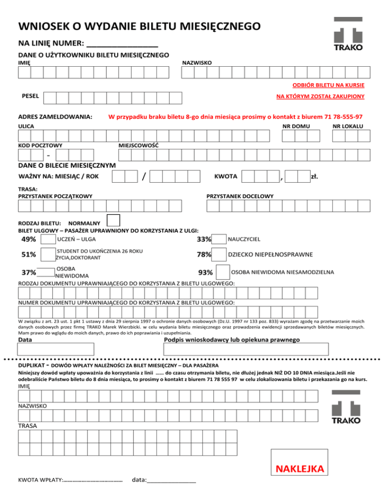 WNIOSEK O WYDANIE BILETU MIESIĘCZNEGO NA LINIĘ NUMER: ______________ DANE O UŻYTKOWNIKU BILETU MIESIĘCZNEGO IMIĘ NAZWISKO ODBIÓR BILETU NA KURSIE PESEL NA KTÓRYM ZOSTAŁ ZAKUPIONY ADRES ZAMELDOWANIA: W przypadku braku biletu 8-go dnia miesiąca prosimy o kontakt z biurem 71 78-555-97 ULICA NR DOMU KOD POCZTOWY NR LOKALU MIEJSCOWOŚĆ DANE O BILECIE MIESIĘCZNYM WAŻNY NA: MIESIĄC / ROK / KWOTA TRASA: PRZYSTANEK POCZĄTKOWY zł. PRZYSTANEK DOCELOWY RODZAJ BILETU: NORMALNY BILET ULGOWY – PASAŻER UPRAWNIONY DO KORZYSTANIA Z ULGI: UCZEŃ – ULGA 49% 33% 51% , STUDENT DO UKOŃCZENIA 26 ROKU ŻYCIA,DOKTORANT 78% NAUCZYCIEL DZIECKO NIEPEŁNOSPRAWNE OSOBA OSOBA NIEWIDOMA NIESAMODZIELNA 93% NIEWIDOMA RODZAJ DOKUMENTU UPRAWNIAJĄCEGO DO KORZYSTANIA Z BILETU ULGOWEGO: 37% NUMER DOKUMENTU UPRAWNIAJĄCEGO DO KORZYSTANIA Z BILETU ULGOWEGO: W związku z art. 23 ust. 1 pkt 1 ustawy z dnia 29 sierpnia 1997 o ochronie danych osobowych (Dz.U. 1997 nr 133 poz. 833) wyrażam zgodę na przetwarzanie moich danych osobowych przez firmę TRAKO Marek Wierzbicki. w celu wydania biletu miesięcznego oraz prowadzenia ewidencji sprzedawanych biletów miesięcznych. Mam prawo do wglądu do moich danych, prawo do ich poprawiania i uzupełniania. Data Podpis wnioskodawcy lub opiekuna prawnego DUPLIKAT - DOWÓD WPŁATY NALEŻNOŚCI ZA BILET MIESIĘCZNY – DLA PASAŻERA Niniejszy dowód wpłaty upoważnia do korzystania z linii …… do czasu otrzymania biletu, nie dłużej jednak NIŻ DO 10 DNIA miesiąca.Jeśli nie odebraliście Państwo biletu do 8 dnia miesiąca, to prosimy o kontakt z biurem 71 78 555 97 w celu zlokalizowania biletu i przekazania go na kurs. IMIĘ NAZWISKO TRASA NAKLEJKA KWOTA WPŁATY:………………………………… data:______________