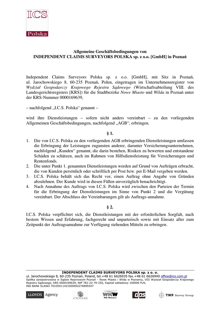 Allgemeine Geschäftsbedingungen von INDEPENDENT CLAIMS SURVEYORS POLSKA sp. z o.o. [GmbH] in Poznań Independent Claims Surveyors Polska sp. z o.o. [GmbH], mit Sitz in Poznań, ul. Jarochowskiego 8, 60-235 Poznań, Polen, eingetragen im Unternehmensregister von Wydział Gospodarczy Krajowego Rejestru Sądowego (Wirtschaftsabteilung VIII. des Landesgerichtsregisters [KRS]) für die Stadtbezirke Nowe Miasto und Wilda in Poznań unter der KRS-Nummer 0000169639, – nachfolgend „I.C.S. Polska“ genannt – wird ihre Dienstleistungen – sofern nicht anders vereinbart – zu den vorliegenden Allgemeinen Geschäftsbedingungen, nachfolgend „AGB“, erbringen. § 1. 1. 2. 3. 4. Die von I.C.S. Polska zu den vorliegenden AGB erbringenden Dienstleistungen umfassen die Erbringung der Leistungen zugunsten anderer, darunter Versicherungsunternehmen, nachfolgend „Kunden“ genannt, die darin bestehen, Risiken zu bewerten und entstandene Schäden zu schätzen, auch im Rahmen von Hilfsdienstleistung für Versicherungen und Rentenfonds. Die unter Punkt 1. genannten Dienstleistungen werden auf Grund von Aufträgen erbracht, die von Kunden persönlich oder schriftlich per Post bzw. per E-Mail vergeben werden. I.C.S. Polska behält sich das Recht vor, einen Auftrag ohne Angabe von Gründen abzulehnen. Der Kunde wird in diesen Fällen unverzüglich benachrichtigt. Nach Annahme des Auftrags von I.C.S. Polska wird zwischen den Parteien der Termin für die Erbringung der Dienstleistungen im Sinne von Punkt 2 und die Vergütung vereinbart. Der Abschluss der Vereinbarungen gilt als Auftrags-annahme. § 2. I.C.S. Polska verpflichtet sich, die Dienstleistungen mit der erforderlichen Sorgfalt, nach bestem Wissen und Erfahrung, fachgerecht und unparteiisch sowie mit Einsatz aller zum Zeitpunkt der Auftragsannahme zur Verfügung stehenden Mitteln zu erbringen. INDEPENDENT CLAIMS SURVEYORS POLSKA sp. z o. o. ul. Jarochowskiego 8, 60-235 Poznań, Poland, tel.+48 61 6626935 fax.+48 61 6626940 [email protected] Spółka zarejestrowana w Sądzie Rejonowym Poznań - Nowe Miasto i Wilda w Poznaniu, VIII Wydział Gospodarczy Krajowego Rejestru Sądowego, KRS 0000169639, NIP 782-22-70-255, Kapitał zakładowy 100000 PLN, ING BANK SLASKI 70105011421000002276899347 -2– § 3. I.C.S. Polska ist berechtigt, einen anderen Dienstleister mit der Erbringung von TeilDienstleistungen zu beauftragen (Subunternehmer). Eine solche Beauftragung bedarf der schriftlichen Einwilligung des Kunden, gemäß § 1, Punkt 2. Ausgeschlossen davon sind Aufträge, zu deren Ausführung es erforderlich ist, Handlungen im Ausland durchzuführen. Die Einwilligung des Kunden hat zur Folge, dass der Subunternehmer gegenüber I.C.S. Polska – und unmittelbar dem Kunden – für die vertragsgemäße Ausführung des Auftrages haftet. Kunde und I.C.S. Polska sind gemeinsam für die Zahlung der Vergütung an den Subunternehmer verantwortlich. § 4. Der Kunde verpflichtet sich, mit I.C.S. Polska bei der Dienstleistungserbringung eng zusammenzuarbeiten, insbesondere bei Auftragserteilung und gegebenenfalls später alle erforderlichen Informationen und Unterlagen I.C.S. Polska bereitzustellen. Bei mangelnder Zusammenarbeit ist I.C.S. Polska berechtigt, vom Auftrag zurückzutreten und vereinbarte Vergütungen in Rechnung zu stellen. § 5. Wenn nicht anders zwischen den Parteien vereinbart, erstellt I.C.S. Polska einen Ergebnisbericht und stellt diesen dem Kunden zu. § 6. 1. 2. 3. 4. 5. Die Zahlung der vereinbarten Vergütungen erfolgt auf das Bankkonto, das I.C.S. Polska in der Rechnung angegeben hat, und innerhalb der genannten Zahlungsfrist. Als Zahlungseingang gilt das Datum des Geldeingangs auf dem Bankkonto der I.C.S. Polska. Bei Zahlungsverzug werden gesetzliche Verzugszinsen berechnet. Bei mehrfachem Zahlungsverzug (mindestens zweimal nacheinander) ist I.C.S. Polska berechtigt, die Annahme weiterer Aufträge dieses Kunden zu verweigern. Die Vergütungen umfassen auch Ausgaben, die I.C.S. Polska in Zusammenhang mit diesem Auftrag entstanden sind. § 7. 1. 2. I.C.S. Polska haftet für die vertragliche Ausführung von Dienstleistungen und ist im Rahmen der AGB haftbar. I.C.S. Polska haftet nicht für Schäden, die aus den nachfolgenden Gründen bei der Ausführung von Dienstleistungen entstanden sind: INDEPENDENT CLAIMS SURVEYORS POLSKA sp. z o. o. ul. Jarochowskiego 8, 60-235 Poznań, Poland, tel.+48 61 6626935 fax.+48 61 6626940 [email protected] Spółka zarejestrowana w Sądzie Rejonowym Poznań - Nowe Miasto i Wilda w Poznaniu, VIII Wydział Gospodarczy Krajowego Rejestru Sądowego, KRS 0000169639, NIP 782-22-70-255, Kapitał zakładowy 100000 PLN, ING BANK SLASKI 70105011421000002276899347 -3- 3. 4. 1) Handlungen oder Unterlassungen des Kunden, insbesondere: a. Unvollständige, fehlerhafte Informationen bzw. Unterlagen, gemäß § 4 b. Fehlerhafte Auftragserteilungen c. Fehlende Zustimmung zu dem von I.C.S. Polska vorgeschlagenen Subunternehmer d. Mangelhafte Zusammenarbeit, die für den Auftrag erforderlich ist 2) Fehlerhafte Software oder mangelhafte Ausrüstung, die die Nutzung der Informationen, die vom Kunden zur Verfügung gestellt wurden, erschweren 3) Fehlerhaftes Gutachten von der erbrachten Dienstleistung oder Verzug bei seiner Lieferung 4) Höhere Gewalt, im Sinne von unvorhersehbaren Ereignissen 5) Handlungen von Dritten 6) Mangelhafte Dienstleistungen eines vom Kunden akzeptierten Subunternehmers Die Beschränkung der Haftung (§7. Punkte 2.2 bis 2.5) bezieht sich auf Handlungs- oder Unterlassungsfolgen von Personen, mit Hilfe derer I.C.S. Polska die Dienstleistungen ausführt. I.C.S. Polska haftet im Rahmen ihrer Haftpflichtversicherung. Schadenersatz-ansprüche bei einem einzelnen Auftrag sind jedoch auf das Sechsfache der Vergütung begrenzt, die zwischen den Parteien für die Dienstleistung im Rahmen des Auftrags vereinbart wurde. § 8. 1. 2. Die Verträge über die Erbringung der Dienstleistungen, die mit I.C.S. Polska geschlosse