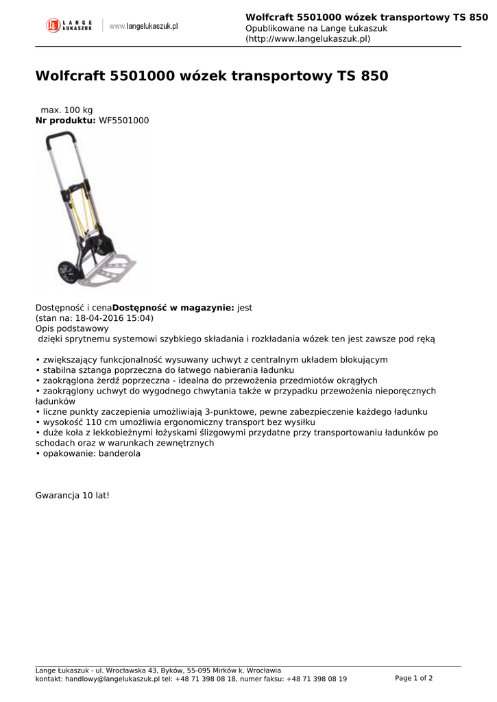 Wolfcraft 5501000 wózek transportowy TS 850 Opublikowane na Lange Łukaszuk (http://www.langelukaszuk.pl) Wolfcraft 5501000 wózek transportowy TS 850 max. 100 kg Nr produktu: WF5501000 Dostępność i cenaDostępność w magazynie: jest (stan na: 18-04-2016 15:04) Opis podstawowy dzięki sprytnemu systemowi szybkiego składania i rozkładania wózek ten jest zawsze pod ręką • zwiększający funkcjonalność wysuwany uchwyt z centralnym układem blokującym • stabilna sztanga poprzeczna do łatwego nabierania ładunku • zaokrąglona żerdź poprzeczna - idealna do przewożenia przedmiotów okrągłych • zaokrąglony uchwyt do wygodnego chwytania także w przypadku przewożenia nieporęcznych ładunków • liczne punkty zaczepienia umożliwiają 3-punktowe, pewne zabezpieczenie każdego ładunku • wysokość 110 cm umożliwia ergonomiczny transport bez wysiłku • duże koła z lekkobieżnymi łożyskami ślizgowymi przydatne przy transportowaniu ładunków po schodach oraz w warunkach zewnętrznych • opakowanie: banderola Gwarancja 10 lat! Lange Łukaszuk - ul. Wrocławska 43, Byków, 55-095 Mirków k. Wrocławia kontakt: [email protected] tel: +48 71 398 08 18, numer faksu: +48 71 398 08 19 Page 1 of 2 Wolfcraft 5501000 wózek transportowy TS 850 Opublikowane na Lange Łukaszuk (http://www.langelukaszuk.pl) ParametryNr katalogowy WF5501000 Max. wysokość 1100 mm Max. udźwig 100 kg Wymiary po rozłożeniu 540 x 1110 x 470 mm Wymiary po złożeniu 500 x 820 x 77 mm Waga 5,6 kg Tagi: do transportu, transportowy, wózek, wózki Lange Łukaszuk - ul. Wrocławska 43, Byków, 55-095 Mirków k. Wrocławia kontakt: [email protected] tel: +48 71 398 08 18, numer faksu: +48 71 398 08 19 Powered by TCPDF (www.tcpdf.org) Page 2 of 2