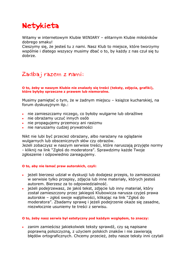 Netykieta Witamy w internetowym Klubie WINIARY – elitarnym Klubie miłośników dobrego smaku! Cieszymy się, że jesteś tu z nami. Nasz Klub to miejsce, które tworzymy wspólnie i dlatego wszyscy musimy dbać o to, by każdy z nas czuł się tu dobrze. Zadbaj razem z nami: O to, żeby w naszym Klubie nie znalazły się treści (teksty, zdjęcia, grafiki), które byłyby sprzeczne z prawem lub niemoralne. Musimy pamiętać o tym, że w żadnym miejscu – książce kucharskiej, na forum dyskusyjnym itp.: nie nie nie nie zamieszczamy niczego, co byłoby wulgarne lub obraźliwe obrażamy uczuć innych osób propagujemy przemocy ani rasizmu naruszamy cudzej prywatności Nikt nie lubi być przecież obrażany, albo narażany na oglądanie wulgarnych lub obscenicznych słów czy obrazów. Jeżeli zobaczysz w naszym serwisie treści, które naruszają przyjęte normy - kliknij na link “Zgłoś do moderatora”. Sprawdzimy każde Twoje zgłoszenie i odpowiednio zareagujemy. O to, aby nie łamać praw autorskich, czyli: jeżeli bierzesz udział w dyskusji lub dodajesz przepis, to zamieszczasz w serwisie tylko przepisy, zdjęcia lub inne materiały, których jesteś autorem. Bierzesz za to odpowiedzialność. jeżeli podejrzewasz, że jakiś tekst, zdjęcie lub inny materiał, który został zamieszczony przez jakiegoś Klubowicza narusza czyjeś prawa autorskie – zgłoś swoje wątpliwości, klikając na link “Zgłoś do moderatora”. Zbadamy sprawę i jeżeli podejrzenie okaże się zasadne, niezwłocznie usuniemy te treści z serwisu. O to, żeby nasz serwis był estetyczny pod każdym względem, to znaczy: zanim zamieścisz jakiekolwiek teksty sprawdź, czy są napisane poprawną polszczyzną, z użyciem polskich znaków i nie zawierają błędów ortograficznych. Chcemy przecież, żeby nasze teksty inni czytali z przyjemnością! Poza tym - jasno i czytelnie zredagowany przepis na pewno bardziej zainteresuje Klubowiczów i skorzysta z niego więcej osób. jeżeli chcesz umieścić jakieś fotografie lub inne materiały graficzne – zadbaj o to, by były estetyczne i wyraźne (oraz by nie naruszały norm prawnych i obyczajowych). Każdego z nas ładne zdjęcie potrawy zachęca do jej wypróbowania. Ze swej strony Nestle Polska S.A. zobowiązuje się do: przestrzegania ogólnie obowiązujących praw i norm obyczajowych. reagowania na każde zgłoszenie Klubowicza i usuwania z serwisu treści niezgodnych z w/wym. prawami i normami. ukarania osób rażąco i/lub stale naruszających w/wym. prawa i normy – np. przez usunięcie ich z Klubu. Nestle Polska S.A. zastrzega sobie zarazem, że nie ponosi odpowiedzialności za: jakość i użyteczność przepisów prezentowanych przez Klubowiczów inne materiały (teksty, zdjęcia itp.) zamieszczone przez użytkowników, także w przypadku, jeżeli naruszają one czyjeś prawa autorskie. szkody wynikające z tekstów opublikowanych przez Klubowiczów – wszelkie przepisy i porady użytkownicy wypróbowują na własną odpowiedzialność – nie możemy dać gwarancji, że uda Ci się każde danie. Pamiętaj, że wstępując do naszego Klubu akceptujesz zasady obowiązującej netykiety. Mamy nadzieję, że razem z Tobą uda nam się stworzyć tu miejsce, które zawsze chętnie odwiedzisz i gdzie przyjemnie spędzisz czas. Wszelkie pytania lub uwagi dotyczące funkcjonowania Klubu WINIARY oraz zgłoszenia przypadków łamania naszej netykiety możesz zgłosić pod adresem: [email protected]