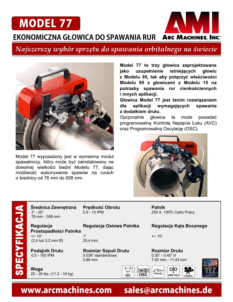 Ł Najszerszy wybór sprzętu do spawania orbitalnego na świecie Model 77 to trzy głowice zaprojektowane jako uzupełnienie istniejących głowic z Modelu 95, tak aby połączyć właściwości Modelu 95 z głowicami z Modelu 15 na potrzeby spawania rur cienkościennych i innych aplikacji. Głowica Model 77 jest tanim rozwiązaniem dla aplikacji wymagających spawania z dodatkiem drutu. Opcjonalnie głowica ta może posiadać programowalną Kontrolę Napięcia Łuku (AVC) oraz Programowalną Oscylację (OSC). Model 77 wyposażony jest w wymienny moduł spawalniczy, który może być zainstalowany na dowolnej wielkości bieżni Modelu 77, dając możliwość wykonywania spawów na rurach o średnicy od 76 mm do 508 mm. Średnica Zewnętrzna Prędkość Obrotu Palnik 3” - 20” 76 mm - 508 mm 0.5 - 10 IPM 250 A, 100% Cyklu Pracy Regulacja Regulacja Osiowa Palnika Prostopadłości Palnika Regulacja Kąta Bocznego +/- 10 (2,4 lub 3,2 mm Ø) 1” 25,4 mm Podajnik Drutu Rozmiar Szpuli Drutu Rozmiar Drutu 0.5 - 100 IPM 0.038” standardowa 0,89 mm 0.30” - 0.45” Ø 7,62 mm - 11,43 mm Waga 25 - 35 lbs. (11,3 - 16 kg) +/- 15 STANDARDOWE FUNKCJE Manualna kontrola długości łuku wraz z możliwością odchylenia palnika o 0.7" (17,8 mm). Ręczna regulacja osiowa palnika 1.0" (25,4 mm). Palnik 250 A chłodzony wodą. Pionowy nastawnik podajnika drutu. Osiowy nastawnik podajnika drutu. Podajnik drutu do 250cm/min wraz z uchwytem na szpulę (1kg). Regulacja modułu spawalniczego zapewniająca możliwość zastosowania na każdej wielkości bieżni Modelu 77. WYPOSAŻENIE DODATKOWE Cyfrowy system wizyjny monitorujący przód i tył palnika. Mechanizm AVC oraz oscylator osiowy palnika. BIEŻNIA GŁOWICY Model 77 wyposażony jest w bieżnię prowadzącą głowicę wokół rury. Bieżnia wykonana jest z materiałów zapewniających wysoką wytrzymałość i długą żywotność. Wielkość bieżni: M77-8625 dla rur o średnicy zewnętrznej (OD) od 3" (76 mm) do 8.625" (220 mm). M77-12750 dla rur o średnicy zewnętrznej (OD) od 6" (152 mm) do 12.750" (324 mm). M77-20000 dla rur o średnicy zewnętrznej (OD) od 12" (305 mm) do 20" (508 mm). Współpracuje z następującymi Źródłami Prądu AMI: Model 415, Model 227 oraz Model 307. Model 207 oraz Model 95-to-207 (do spawania bez dodatku drutu). Liderzy i Innowatorzy w Dziedzinie Automatycznego Spawania Orbitalnego Więcej informacji znajdą Państwo na naszej stronie www lub dzwoniąc do naszego biura w Niemczech SIEDZIBA FIRMY Arc Machines, Inc. ODDZIAŁ W EUROPIE Arc Machines, Inc. BIURO W NIEMCZECH Arc Machines GmbH 10500 Orbital Way Pacoima, CA 91331 U.S.A. Tel: +1 / 818 / 896 / 9556 Fax: +1 / 818 / 890 / 3724 [email protected] Chemin du Lavasson 2, CH-1196 Gland, Szwajcaria Tel: +41 / 22 / 995 / 0051 Fax: +41 / 22 / 995 / 0059 [email protected] Markelsbach 2 D-53804 Much, Niemcy Tel: +49 / 2245 / 91680 Fax: +49 / 2245 / 916868 [email protected] MKT 77 WH / April, 2012 / PL BIURO W ANGLII Arc Machines UK Limited Unit 2 Lamport Court Heartlands Business Park Daventry, NN11 8UF, UK Tel: +44 / 1327 / 312787 Fax: +44 / 1327 / 315034 [email protected]