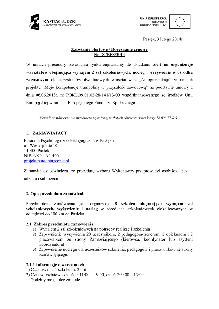 Pasłęk, 3 lutego 2014r. Zapytanie ofertowe / Rozeznanie cenowe Nr 18 /EFS/2014 W ramach procedury rozeznania rynku zapraszamy do składania ofert na organizacje warsztatów obejmująca wynajem 2 sal szkoleniowych, nocleg i wyżywienie w ośrodku wczasowym dla uczestników dwudniowych warsztatów z „Autoprezentacji” w ramach projektu „Moje kompetencje trampoliną w przyszłość zawodową” na podstawie umowy z dnia 06.06.2013r. nr POKL.09.01.02-28-141/13-00 współfinansowanego ze środków Unii Europejskiej w ramach Europejskiego Funduszu Społecznego. Wartość zamówienia nie przekracza wyrażonej w złotych równowartości kwoty 14 000 EURO . 1. ZAMAWIAJĄCY Poradnia Psychologiczno-Pedagogiczna w Pasłęku ul. Westerplatte 10 14-400 Pasłęk NIP:578-25-94-446 [email protected] Zamawiający oświadcza, że procedurę wyboru Wykonawcy przeprowadzi osobiście, bez udziału osób trzecich. 2. Opis przedmiotu zamówienia Przedmiotem zamówienia jest organizacja 8 szkoleń obejmująca wynajem sal szkoleniowych, wyżywienie i nocleg w ośrodkach szkoleniowych zlokalizowanych w odległości do 100 km od Pasłęka. 2.1. Zakres przedmiotu zamówienia: 1) Wynajem 2 sal szkoleniowych na potrzeby realizacji szkolenia 2) Zapewnienie wyżywienia 28 uczestnikom, 2 pedagogom-trenerom, 2 opiekunom i 2 pracownikom ze strony Zamawiającego (kierowca, koordynator lub asystent koordynatora) 3) Zapewnienie noclegu dla uczestników szkolenia, pedagogów i pracowników ze strony Zamawiającego. 2.1.1 Informacje o warsztatach: 1) Czas trwania 1 szkolenia: 2 dni 2) Czas warsztatów - dzień 1: 11:00 – 19:00, dzień 2: 9:00 – 13:00. Godziny mogą ulec zmianie. 3) Liczebność grupy: 30 osób (2x15 osób w każdej sali) 4) Liczba noclegów na warsztaty: 34 osoby 5) Terminy warsztatów: 28-29.02.2014, 07-08.03.2014, 14-15.03.2014, 28-29.03.2014, 04-05.04.2014, 11-12.04.2014, 09-10.05.2014, 06-07.06.2014. Terminy mogą ulec zmianie. Warsztaty odbędą się w terminie 28.02.2014r. -14.06.2014r. 2.1.2. Warunki organizacji: 1) Sala szkoleniowa –wyposażenie i warunki korzystania: a. sala minimum 15 osób b. liczba miejsc siedzących sali szkoleniowej oraz stołów lub wygodnych krzeseł z pulpitami odpowiada liczbie uczestników; c. możliwość dowolnej aranżacji ustawienia; d. możliwość oznakowania sali szkoleniowej dostarczonymi przez Zamawiającego materiałami (plakaty, wydruki informacyjne) o wizualizacji zgodnej z wymogami PO KL; e. przynajmniej w jednej sali projektor multimedialny z laptopem (sprawny); f. ekran lub ściana sali, umożliwiające projekcję wyraźnego obrazu z projektora multimedialnego, widocznego dla wszystkich uczestników; g. ze względu na konieczność przygotowania sali do zajęć szkoleniowych Zamawiający ma możliwość dostępu do sali na godzinę przed i po szkoleniu; h. w sali zostanie zapewniony bezpłatny dostęp do Internetu. 2) Wyżywienie a. przerwa kawowa: 1 dziennie na 1 uczestnika/uczestniczkę (minimum: kawa, herbata, woda, ciastka, soki, mleko, cukier, cytryna) jako przerwa ciągła (całodzienna), uzupełniana na bieżąco, dostępna dla uczestniczek/uczestników przez cały czas trwania szkolenia; b. obiad: 1 dziennie na uczestniczkę/uczestnika, minimum: zupa, drugie danie, woda, ciepły lub zimny napój, w pierwszym i drugim dniu szkolenia musi być inny zestaw obiadowy; c. śniadanie; d. menu (śniadanie, obiady, kolacja) powinno uwzględniać dania wegetariańskie; e. Zamawiający każdorazowo poinformuje wybranych Wykonawców o ilości posiłków wegetariańskich podczas przekazywania specyfikacji dotyczącej szkolenia; f. przerwa kawowa musi być zorganizowana w pobliżu Sali w której będzie odbywało się szkolenie lub bezpośrednio w Sali; g. w przypadku organizacji kilku wydarzeń w obiekcie Wykonawcy, Wykonawca ma obowiązek wyraźnego oznakowania przygotowanego dla grupy Zamawiającego cateringu; h. rozkład posiłków: Dzień 1 Przerwa kawowa ciągła: uczestnicy szkolenia Obiad: uczestnicy szkolenia korzystający z noclegów Kolacja: uczestnicy szkolenia korzystający z noclegów Dzień 2 śniadanie: uczestnicy szkolenia korzystający z noclegów Przerwa kawowa ciągła: uczestnicy szkolenia korzystający z noclegów obiad: uczestnicy szkolenia korzystający z noclegów 3) Zakwaterowanie a. w terminie szkolenia przed zameldowaniem i po wymeldowaniu nocujących osób bezpłatnie dostępna zamykana przechowalnia bagażu; b. w cenie noclegu należy uwzględnić koszt wyżywienia i opłatę miejscową/klimatyczną; c. zapewnienie pokoi z łazienkami (ogrzewane w okresie zimowym); d. ostateczna ilość noclegów zostanie podana minimum 3 dni robocze przed terminem szkolenia; e. ilość noclegów uczestników: 1 x nocleg z 1 na 2 dzień szkolenia na osobę; f. ilość noclegów trenerów i opiekunów: 1 x nocleg z 1 na 2 dzień szkolenia; g. ilość noclegów przedstawicieli Zamawiającego: według zapotrzebowania (nie więcej niż dwie osoby na dany termin (bez względu na ilość realizowanych szkoleń w tym terminie); h. typ pokoi:1, 2, 3 i 4 osobowe. 4) Infrastruktura a. pomieszczenia, w których będą przebywać uczestnicy szkolenia, muszą mieć zapewnione zaplecze do przeprowadzenia szkolenia, zgodnie z wymaganiami polskiego prawa, tj. spełniać odpowiednie warunki sanitarne, bezpieczeństwa, akustyczne i jakościowe; b. bezpłatny dostęp do Internetu w sali szkoleniowej i w pokojach, z dostępem do sieci Wi-Fi; c. bezpłatny parking dla autobusu, przywożący uczestników szkolenia; d. zapewnienie odbioru i bezpiecznego przechowania materiałów szkoleniowych i promocyjnych. 5) Pozostałe a. rozliczenie noclegów oraz posiłków nastąpi na podstawie rzeczywistego zużycia (po każdej grupie szkoleniowej); b. Zamawiający ma możliwość bezkosztowej zmiany terminów realizacji zamówienia; c. określenie maksymalnego zapotrzebowania nie rodzi po stronie Zamawiającego obowiązku realizacji wszystkich usług w ilościach wskazanyc