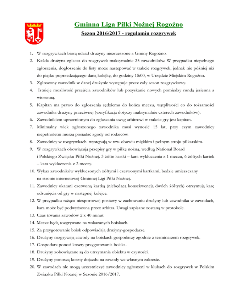Gminna Liga Piłki Nożnej Rogoźno Sezon 2016/2017 - regulamin rozgrywek 1. W rozgrywkach biorą udział drużyny niezrzeszone z Gminy Rogoźno. 2. Każda drużyna zgłasza do rozgrywek maksymalnie 25 zawodników. W przypadku niepełnego zgłoszenia, dogłoszenie do listy może następować w trakcie rozgrywek, jednak nie później niż do piątku poprzedzającego daną kolejkę, do godziny 15:00, w Urzędzie Miejskim Rogoźno. 3. Zgłoszony zawodnik w danej drużynie występuje przez cały sezon rozgrywkowy. 4. Istnieje możliwość przejścia zawodników lub pozyskanie nowych pomiędzy rundą jesienną a wiosenną. 5. Kapitan ma prawo do zgłoszenia sędziemu do końca meczu, wątpliwości co do tożsamości zawodnika drużyny przeciwnej (weryfikacja dotyczy maksymalnie czterech zawodników). 6. Zawodnikiem uprawnionym do zgłaszania uwag arbitrowi w trakcie gry jest kapitan. 7. Minimalny wiek zgłoszonego zawodnika musi wynosić 15 lat, przy czym zawodnicy niepełnoletni muszą posiadać zgody od rodziców. 8. Zawodnicy w rozgrywkach występują w tzw. obuwiu miękkim i pełnym stroju piłkarskim. 9. W rozgrywkach obowiązują przepisy gry w piłkę nożną, według National Board i Polskiego Związku Piłki Nożnej. 3 żółte kartki – kara wykluczenia z 1 meczu, 6 żółtych kartek – kara wykluczenia z 2 meczy. 10. Wykaz zawodników wykluczonych żółtymi i czerwonymi kartkami, będzie umieszczany na stronie internetowej Gminnej Ligi Piłki Nożnej. 11. Zawodnicy ukarani czerwoną kartką (niebędącą konsekwencją dwóch żółtych) otrzymują karę odsunięcia od gry w następnej kolejce. 12. W przypadku rażąco niesportowej postawy w zachowaniu drużyny lub zawodnika w zawodach, kara może być podwyższona przez arbitra. Uwagi zapisane zostaną w protokole. 13. Czas trwania zawodów 2 x 40 minut. 14. Mecze będą rozgrywane na wskazanych boiskach. 15. Za przygotowanie boisk odpowiadają drużyny-gospodarze. 16. Drużyny rozgrywają zawody na boiskach gospodarzy zgodnie z terminarzem rozgrywek. 17. Gospodarz ponosi koszty przygotowania boiska. 18. Drużyny zobowiązane są do utrzymania obiektu w czystości. 19. Drużyny ponoszą koszty dojazdu na zawody we własnym zakresie. 20. W zawodach nie mogą uczestniczyć zawodnicy zgłoszeni w klubach do rozgrywek w Polskim Związku Piłki Nożnej w Sezonie 2016/2017. 21. Każdy arbiter oraz zawodnik uczestniczący w meczu w czasie jego trwania podlegają ubezpieczeniu grupowemu od następstw nieszczęśliwych wypadków. 22. Organizator nie ponosi odpowiedzialności za przygotowanie fizyczne i stan zdrowia arbitrów oraz zawodników przystępujących do rozgrywek. 23. W trakcie rozgrywek obowiązuje zakaz spożywania alkoholu. 24. W przypadku, gdy dwa lub więcej zespołów zakończą rozgrywki z tą samą liczbą punktów, o kolejności w tabeli zadecyduje: 1/ większa liczba punktów zdobytych w meczach między zainteresowanymi klubami, 2/ różnica bramek w spotkaniach między zainteresowanymi klubami, 3/ strzelone bramki w spotkaniach między zainteresowanymi klubami, 4/ różnica bramek we wszystkich spotkaniach, 5/ strzelone bramki we wszystkich spotkaniach. 25. Lista zawodników uprawnionych do gry w danym sezonie powinna być dostarczona do czwartku tj. 08.09.2016r. 26. Zmiany zawodników muszą odbywać się w przerwie meczu, wcześniej zgłoszone sędziemu. 27. Jeżeli zawodnik nieprawnie wejdzie na boisko podczas meczu, wówczas ukarany zostanie żółtą kartką. 28. Drużyna, która zgłosi brak uczestnictwa w zawodach (najpóźniej do piątku poprzedzającego mecz do godz. 14:00) otrzymuje 0:3 i -1 pkt. 29. W przypadku nie przybycia drużyny na mecz, otrzymuje ona 0:3 i -3 pkt. Rogoźno, dnia 01.09.2016r.