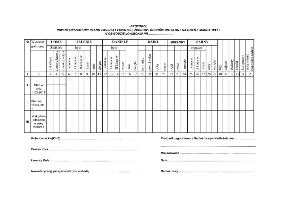 PROTOKÓŁ INWENTARYZACYJNY STANU ZWIERZĄT ŁOWNYCH, ŻUBRÓW i BOBRÓW USTALONY NA DZIEŃ 1 MARCA 2011 r. W OBWODZIE ŁOWIECKIM NR…………………….. 20 21 kuropatwy bobry-ilość stanowisk rodzin. kaczki bażanty zające lisy koźlęta kozy razem II klasa w. I klasa w. jagnięta owce tryki razem pow. 1 roku lochy do 1 roku 19 cielęta 9 10 11 12 13 14 15 16 17 18 łanie 8 razem 7 III klasa w. 6 II klasa w. 5 I klasa w. razem 4 cielęta III klasa w. rogacze 3 łanie SARNY MUFLONY byki II klasa w. Stan w dniu 1.03.2011 byki DZIKI I klasa w. I ŻUBRY DANIELE łoszaki/cielęta 2 JELENIE klempy/krowy 1 ŁOSIE byki/byki Nr Wyszczególnienie 22 23 24 25 26 27 28 29 30 31 32 33 34 35 II Stan na 15.03.201 1 Wyk.planu odstrzału III w roku 2010/11 Koło łowieckie(OHZ)………………………………...…………………....……………. Protokół uzgodniono z Nadleśniczym Nadleśnictwa: ……...………… …………………………………………………………………………………… Prezes Koła ………………...……….……………………….…..……………………… Miejscowość ………..…...……….……...…..………..…...………………… Łowczy Koła……………..….…………...….……....………….………………….…… Data……………………………………………………………………………… Inwentaryzację przeprowadzono metodą…………………………..………..…….. Nadleśniczy……………...………………..……....………………………….. ……...………… ………………… ………………… …………………
