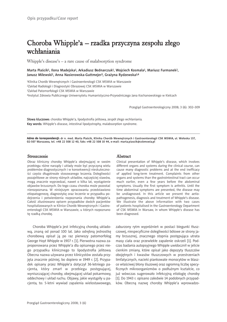 Opis przypadku/Case report Choroba Whipple’a – rzadka przyczyna zespo³u z³ego wch³aniania Whipple’s disease’s – a rare cause of malabsorption syndrome Marta Piaścik1, Ilona Madejska1, Arkadiusz Bednarczuk1, Wojciech Kosmala1, Mariusz Furmanek2, Janusz Milewski1, Anna Nasierowska-Guttmejer3, Grażyna Rydzewska1,4 1Klinika Chorób Wewnętrznych i Gastroenterologii CSK MSWiA w Warszawie Radiologii i Diagnostyki Obrazowej CSK MSWiA w Warszawie 3Zakład Patomorfologii CSK MSWiA w Warszawie 4Instytut Zdrowia Publicznego Uniwersytetu Humanistyczno-Przyrodniczego Jana Kochanowskiego w Kielcach 2Zakład Przegląd Gastroenterologiczny 2008; 3 (6): 302–309 Słowa kluczowe: choroba Whipple’a, lipodystrofia jelitowa, zespół złego wchłaniania. Key words: Whipple’s disease, intestinal lipodystrophy, malabsorption syndrome. Adres do korespondencji: dr n. med. Marta Piaścik, Klinika Chorób Wewnętrznych i Gastroenterologii CSK MSWiA, ul. Wołoska 137, 02-507 Warszawa, tel. +48 22 508 12 40, faks +48 22 508 10 44, e-mail: [email protected] Streszczenie Abstract Obraz kliniczny choroby Whipple’a obejmującej w swoim przebiegu różne narządy i układy może być przyczyną wielu problemów diagnostycznych i w konsekwencji nieskuteczności często długotrwale stosowanego leczenia. Dolegliwości pozajelitowe ze strony różnych układów, najczęściej stawów, mogą znacznie wyprzedzać, nawet o kilka lat, wystąpienie objawów brzusznych. Do tego czasu choroba może pozostać nierozpoznana. W niniejszym opracowaniu przedstawiono etiopatogenezę, diagnostykę oraz leczenie w przypadku podejrzenia i potwierdzenia rozpoznania choroby Whipple’a. Całość zilustrowano opisem przypadków dwóch pacjentów hospitalizowanych w Klinice Chorób Wewnętrznych i Gastroenterologii CSK MSWiA w Warszawie, u których rozpoznano tę rzadką chorobę. Clinical presentation of Whipple’s disease, which involves different organs and systems during the clinical course, can cause many diagnostic problems and at the end inefficacy of applied long-term treatment. Complaints from other organs and systems than the gastrointestinal tract can occur much earlier, even a few years before the abdominal symptoms. Usually the first symptom is arthritis. Until the time abdominal symptoms are presented, the disease may be undiagnosed. In this article we present the aetiopathogenesis, diagnosis and treatment of Whipple’s disease. We illustrate the above information with two cases of patients hospitalised in the Gastroenterology Department of CSK MSWiA in Warsaw, in whom Whipple’s disease has been diagnosed. Choroba Whipple’a jest infekcyjną chorobą układową, znaną od ponad 100 lat. Jako odrębną jednostkę chorobową opisał ją po raz pierwszy patomorfolog George Hoyt Whipple w 1907 r. [1]. Pierwotna nazwa zaproponowana przez Whipple’a dla opisanego przez niego przypadku klinicznego to lipodystrofia jelitowa. Obecna nazwa używana przez klinicystów została przyjęta znacznie później, bo dopiero w 1949 r. [2]. Przypadek opisany przez Whipple’a dotyczył 36-letniego pacjenta, który zmarł w przebiegu postępującej, wyniszczającej choroby, obejmującej układ pokarmowy, oddechowy i układ ruchu. Objawy, jakie wystąpiły u pacjenta, to: 5-letni wywiad zapalenia wielostawowego, zaburzony rytm wypróżnień w postaci biegunki tłuszczowej, niespecyficzne dolegliwości bólowe ze strony jamy brzusznej, znacznego stopnia postępująca utrata masy ciała oraz przewlekłe zapalenie oskrzeli [1]. Podczas badania autopsyjnego Whipple uwidocznił w jelicie cienkim zmiany, które opisał jako depozyty tłuszczów obojętnych i kwasów tłuszczowych w przestrzeniach limfatycznych, nacieki piankowate monocytów w blaszce właściwej błony śluzowej oraz ogromną liczbę specyficznych mikroorganizmów o podłużnym kształcie, co już wówczas sugerowało infekcyjną etiologię choroby [1]. Do 1943 r. opisano zaledwie 14 podobnych przypadków. Obecną nazwę choroby Whipple’a wprowadzo- Przegląd Gastroenterologiczny 2008; 3 (6) Choroba Whipple’a – rzadka przyczyna zespołu złego wchłaniania no 42 lata po pierwszym opisie, kiedy to w 1949 r. w kolejnych badaniach wykazano obecność w blaszce właściwej błony śluzowej jelita cienkiego nacieków makrofagów zawierających PAS-dodatni materiał wewnątrzkomórkowy [2]. Materiał badawczy pobierano w tamtym czasie podczas badań autopsyjnych lub laparotomii. W historii medycyny zwraca uwagę opis przypadku 66-letniego pacjenta z 1895 r., przedstawiony przez Allchina i Hebba [3], podobny w obrazie klinicznym do opisu pacjenta Whipple’a, którego materiał badawczy został zachowany w dziale dotyczącym chorób przewodu pokarmowego Muzeum Nauki i Techniki w Londynie. Podczas reorganizacji tego muzeum w 1961 r. przeprowadzono ponowne badania zachowanych preparatów przy użyciu najnowszych w ówczesnych czasach technologii, podczas których wykazano obecność PAS-dodatnich depozytów w makrofagach blaszki właściwej błony śluzowej jelita cienkiego [4]. Najprawdopodobniej więc pierwszy opisany w historii przypadek choroby Whipple’a pochodzi jeszcze z XIX w., chociaż nie została ona wówczas zdefiniowana jako nowa jednostka chorobowa. Infekcyjną etiologię choroby podejrzewano już od czasu publikacji Whipple’a w 1907 r. Mimo to do 1952 r. nie pojawiły się żadne doniesienia dotyczące skuteczności antybiotykoterapii [5]. Na początku lat 60. ubiegłego wieku Cohen [6], Chears [7] i Yardley [8] uwidocznili w mikroskopie elektronowym bakterię odpowiedzialną za rozwój choroby. Opisywali jej podobieństwo do bakterii stwierdzonej u chorych na gruźlicę. Od tego czasu badanie w mikroskopie elektronowym i obecność PAS-dodatnich depozytów w makrofagach stało się podstawą rozpoznania choroby Whipple’a. W 1991 r. diagnostyka zaczęła wykorzystywać w różnicowaniu możliwości genetyki molekularnej. Wilson i wsp. zidentyfik