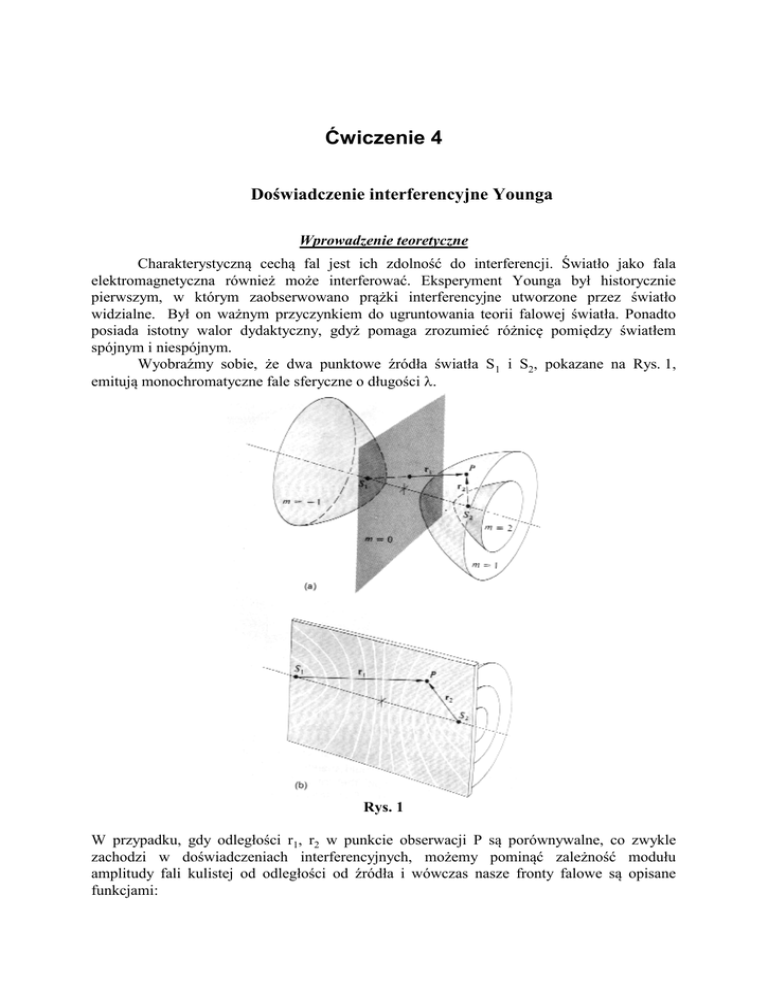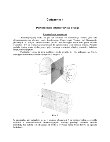 Ćwiczenie 4 Doświadczenie interferencyjne Younga Wprowadzenie teoretyczne Charakterystyczną cechą fal jest ich zdolność do interferencji. Światło jako fala elektromagnetyczna również może interferować. Eksperyment Younga był historycznie pierwszym, w którym zaobserwowano prążki interferencyjne utworzone przez światło widzialne. Był on ważnym przyczynkiem do ugruntowania teorii falowej światła. Ponadto posiada istotny walor dydaktyczny, gdyż pomaga zrozumieć różnicę pomiędzy światłem spójnym i niespójnym. Wyobraźmy sobie, że dwa punktowe źródła światła S1 i S2, pokazane na Rys. 1, emitują monochromatyczne fale sferyczne o długości . Rys. 1 W przypadku, gdy odległości r1, r2 w punkcie obserwacji P są porównywalne, co zwykle zachodzi w doświadczeniach interferencyjnych, możemy pominąć zależność modułu amplitudy fali kulistej od odległości od źródła i wówczas nasze fronty falowe są opisane funkcjami: E1 (r1 , t ) A1ei(kr1 t 1 ) , (1a) E2 (r2 , t ) A2ei(kr2 t 2 ) , (1b) gdzie k=2/. E1, E2 oznaczają składowe wektora pola elektrycznego wzdłuż ustalonego kierunku polaryzacji; r1, r2 są odległościami źródeł S1 i S2 od punktu P (Rys. 1); 1, 2 oznaczają fazy początkowe drgań pola elektromagnetycznego a A1>0 i A2>0 - ich amplitudy. Detektory, w tym oko ludzkie są czułe jedynie na natężenie pola świetlnego. Zgodnie z teorią elektromagnetyzmu, natężenie wypadkowe w punkcie P może być z dokładnością do stałej wyrażone jako kwadrat modułu wypadkowej (sumarycznej) amplitudy zespolonej pola świetlnego: 2 2 I ( P) E1 E2 I1 I 2 2 I1 I 2 cos (r1 r2 ) (1 2 ) , (2) gdzie I1=A12, I2=A22 są natężeniami, odpowiadającymi źródłom S1, S2. Znaczy to, że natężenie pola w punkcie P wynosiłoby I1 lub I2 gdyby falę emitowało tylko jedno ze źródeł. Zgodnie ze wzorem (2), w zależności od punktu obserwacji, wypadkowe natężenie zmienia się od wartości minimalnej: I min A1 A2 2 , (3) która odpowiada warunkowi: 2 r1 r2 1 2 2m 1 , do wartości maksymalnej: m=0,1,2,... I max A1 A2 (4) 2 , (5) kiedy obowiązuje równanie: 2 r1 r2 1 2 2 m . (6) W związku z powyższym, w przypadku oświetlenia monochromatycznym światłem widzialnym, obserwujemy na ekranie jasne prążki w miejscach odpowiadających warunkowi (6) lub ciemne prążki, gdy zachodzi równanie (4). Dokładne położenie powyższych prążków zależy od różnicy faz 1-2. Na Rys. 1 pokazano sytuację kiedy 1-2=0. Zgodnie z zależnościami (4) i (6) maksima lub minima interferencyjne tworzone przez dwa źródła punktowe zdefiniowane są równaniem r1-r2=const, co oznacza, że leżą one w przestrzeni na hiperboloidach obrotowych. Warunkiem zaobserwowania prążków interferencyjnych jest stała w czasie różnica faz 1-2. Mówimy wówczas, że źródła S1 i S2 są wzajemnie spójne (lub koherentne) czyli 2 emitują fale skorelowane ze sobą. W przypadku, gdy drgania elektromagnetyczne są emitowane niezależnie, ich fazy początkowe 1, 2 zmieniają się w ten sposób w czasie, że różnica 1-2 = (t) jest szybkozmienną funkcją czasu. Znaczy to, że w dowolnej chwili prążki interferencyjne powstają ale zmieniają się ich położenia. Ponieważ każdy detektor, w tym oko ludzkie, uśrednia swoją obserwację w czasie, zatem szybko "pływające" prążki na ekranie są niezauważalne i uśrednione natężenie światła daje zgodnie ze wzorem (2) wynik I ( P) I1 I2 const . W takiej sytuacji, kiedy prążki interferencyjne są niewidoczne mówimy, że źródła S1 i S2 są wzajemnie niespójne (lub niekoherentne). W praktyce wszystkie termiczne źródła światła jak żarówki, lampy monochromatyczne itp. emitują promieniowanie niespójne. Jedynym wyjątkiem jest tutaj laser, którego działanie opiera się na emisji wymuszonej, dzięki czemu poszczególne emisje fotonów są skorelowanie i wypromieniowana wiązka światła charakteryzuje się wysoką spójnością. Tym niemniej mając do dyspozycji jedynie termiczne źródło światła można zaobserwować zjawisko interferencji, tak jak to zrobił Young w swoim doświadczeniu zilustrowanym na Rys. 2 P r2 ym r1 S2 S m m a O m S1 B s Rys. 2 3 Rys. 2 cd. Gdyby Young oświetlił szczeliny S1 i S2 bezpośrednio źródłem termicznym, prążki interferencyjne na ekranie nie powstałyby, ponieważ S1, S2 emitowałyby światło wzajemnie niespójne. Jeżeli jednak przed szczelinami S1 i S2 jest dodatkowo umieszczona szczelina S, oświetlona źródłem termicznym: wówczas zgodnie z zasadą Huygensa każdy jej punkt staje się źródłem fali kulistej, która z kolei pada na szczeliny S1 i S2. Punkty tych szczelin emitują dalej wtórne fale kuliste, ale są już one wzajemnie spójne, gdyż powstają w wyniku promieniowania tego samego punktu szczeliny S. Jeżeli szczelina S jest umieszczona symetrycznie względem szczelin S 1 i S2, wtedy we wzorze (2) otrzymujemy I1=I2=I0 i 1-2=0. W takim przypadku równanie (2) ma uproszczoną formę: 2 I ( P) 4 I 0 cos 2 (r1 r2 ) , (7) Ze względu na symetrię układu, powstałe na ekranie prążki interferencyjne są równoległe do szczelin. Zgodnie z geometrią podaną na Rys. 2 dla warunku s>>a i małych kątów m można przyjąć: S1B= r1 - r2 ; tg m =S1B/a = ym /s. Zatem: r1 - r2 = ym a/s , (8) czyli równanie (7) ma postać: 4 ym a 2 I ( P) 4 I 0 cos s . 2 (9) Z powyższego wynika, że odległości między sąsiednimi maksimami interferencyjnymi wynoszą: s (10) y . a W doświadczeniu Younga ze światłem niespójnym ogromną rolę odgrywa szerokość pierwszej szczeliny S. Początkowo zakładaliśmy, że jest ona nieskończenie wąska, co oczywiście jest idealizacją i nie może być zrealizowane w praktyce. Realna sytuacja jest pokazana na Rys. 3, gdzie A i B oznaczają krawędzie szczeliny S o szerokości b. Leży ona w odległości l od płaszczyzny szczelin S1 i S2. Y S 2 B P A a S A P B b S 1 E K R AN l s Rys. 3 Ze względu na symetrię zagadnienia punkty sz
