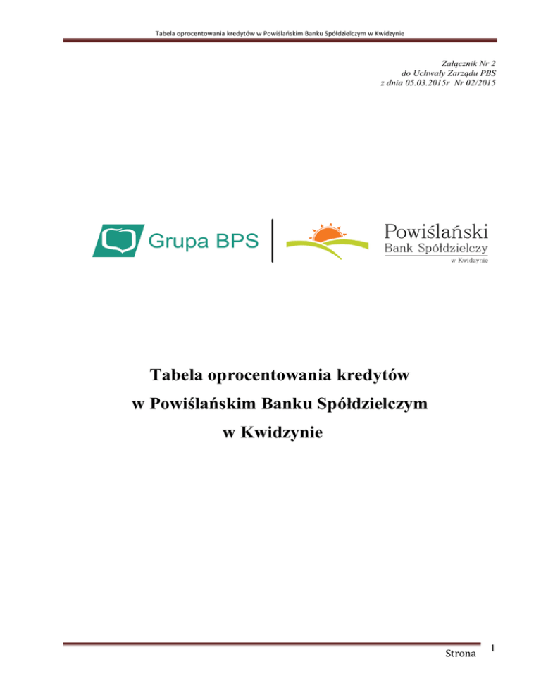 Tabela oprocentowania kredytów w Powiślańskim Banku Spółdzielczym w Kwidzynie Załącznik Nr 2 do Uchwały Zarządu PBS z dnia 05.03.2015r Nr 02/2015 Tabela oprocentowania kredytów w Powiślańskim Banku Spółdzielczym w Kwidzynie Strona 1 Tabela oprocentowania kredytów w Powiślańskim Banku Spółdzielczym w Kwidzynie Spis treści CZĘŚĆ A - KLIENCI INDYWIDUALNI………………….………………………………………………………3 Kredyty w rachunku oszczędnościowo-rozliczeniowym (ROR) ................................................... 3 Kredyty gotówkowe ....................................................................................................................................... 3 Kredyty na cele mieszkaniowe i remontowe ........................................................................................ 3 Karty kredytowe .............................................................................................................................................. 4 CZĘŚĆ B - KLIENCI INSTYTUCJONALNI…………….………………………….……………………………4 Kredyty w rachunku bieżącym ……………………………………………………..…………………………….4 Kredyty obrotowe w rachunku kredytowym ………………………………………………………………4 Kredyty inwestycyjne ………………………………………………………………………………………...………5 Kredyty preferencyjne dla rolników ……………………………………………………...……………………5 Karty kredytowe ………………………………………………………………………………………………………..5 CZĘŚĆ C – STAWKI OPROCENTOWANIA OBOWIĄZUJĄCE DLA CZĘŚCI A i B ……….……6 Kredyty restrukturyzowane………………………………………………………………………………………..6 Kredyty przeterminowane …………………………………………………………………………………………6 Stawka Bazowa Banku ……………………………………………………………………………………………….6 CZĘŚĆ D – POZOSTAŁE OPROCENTOWANIE …………………………………………………………...7 Kredyty gotówkowe i w ROR udzielone do dnia 11.09.2012r….…………………………………….7 Kredyty przeterminowane udzielone do dnia 12.08.2012r …………………………………….7 Kredyty z dotacją na zakup kolektorów słonecznych udzielone do dnia 17.02.2013r.........7 Kredyty restrukturyzowane zawarte do dnia 03.11.2013r ……………………………………..8 Inne kredyty udzielone do dnia 26.03.2013r……………………………………………………8 Strona 2 Tabela oprocentowania kredytów w Powiślańskim Banku Spółdzielczym w Kwidzynie CZĘŚĆ A - KLIENCI INDYWIDUALNI Kredyty w rachunku oszczędnościowo-rozliczeniowym (ROR) Lp. Rodzaj kredytu Oprocentowanie 1. Kredyt odnawialny w ROR 10,00% 31 31. STAŁA STOPA PROCENTOWA obowiązuje dla nowych kredytów udzielanych od dnia 05.03.2015r Kredyty gotówkowe Lp. 1. Rodzaj kredytu Okres kredytowania Oprocentowanie do 36 miesięcy 10,00%15 do 60 miesięcy WIBOR 6M + marża16 do 72 miesięcy WIBOR 6M + marża 25 do 84 miesięcy WIBOR 6M + marża 26 DOBRY KREDYT 2. KREDYT za 0% do 12 miesięcy 0,00% 3. SZYBKA GOTÓWKA do 24 miesięcy 10,00%6 4. BEZPIECZNA GOTÓWKA do 24 miesięcy 10,00%28 5. MINI KREDYT do 24 miesięcy 9,95%9 6. Kredyt konsumpcyjny HIPOTECZNY do 240 miesięcy WIBOR 3M + marża2 7. Kredyt ''NA ZAKUP UDZIAŁÓW I AKCJI'' do 60 miesięcy WIBOR 3M + marża29 50 2. zmienna stawka WIBOR 3M + marża 6. STAŁA STOPA PROCENTOWA 9. STAŁA STOPA PROCENTOWA 15. STAŁA STOPA PROCENTOWA 16 zmienna stawka WIBOR 6M + marża 25.zmienna stawka WIBOR 6M + marża 26.zmienna stawka WIBOR 6M +marża 28. STAŁA STOPA PROCENTOWA 29. zmienna stawka WIBOR 3M + marża 50 . STAŁA STOPA PROCENTOWA Kredyty na cele mieszkaniowe i remontowe Lp. Rodzaj kredytu 1. Kredyt mieszkaniowy „WŁASNA CHATA” WIBOR 3M + marża 11 ,,MIESZKANIE DLA MŁODYCH’’ WIBOR 3M + marża 52 WIBOR 3M + marża 21 2. Kredyt mieszkaniowy „LOKATORSKI” 3. Oprocentowanie 41 Kredyt z dotacją ''NA ZAKUP KOLEKTORÓW do 36 miesięcy od 8,00 % SŁONECZNYCH'' do 60 miesięcy WIBOR 6M + marża 42 11.zmienna stawka WIBOR 3M + marża 21. zmienna stawka WIBOR3M + marża 41. STAŁA STOPA PROCENTOWA 42. zmienna stawka WIBOR 6M + marża 52. zmienna stawka WIBOR 3M + marża Strona 3 Tabela oprocentowania kredytów w Powiślańskim Banku Spółdzielczym w Kwidzynie Karty kredytowe Rodzaj kredytu Lp. 1. VISA Credit Oprocentowanie 14) a) transakcje gotówkowe, bezgotówkowe oraz przelewy z kart 9,50% 48 b) plan ratalny 8,40% 49 a) transakcje gotówkowe, bezgotówkowe oraz przelewy z kart 9,50% 48 b) plan ratalny 8,40% 49 2. VISA GOLD 14) 14) obowiązuje dla transakcji gotówkowych, bezgotówkowych oraz spłat zadłużenia w innym banku 48) zmienna stawka : 3,8-krotność stopy kredytu lombardowego 49) zmienna stawka : 3,8-krotność stopy kredytu lombardowego – (minus) 1,10 p.p. CZĘŚĆ B - KLIENCI INSTYTUCJONALNI Kredyty w rachunku bieżącym Lp. Oprocentowanie Rodzaj kredytu 1 1. Kredyt w Rachunku Bieżącym dla firm WIBOR 3M + marża 2. Kredyt w Rachunku Bieżącym dla rolników WIBOR 3M + marża 46 3. Kredyt SZYBKA GOTÓWKA DLA FIRM WIBOR 3M + marża 22 Niewykorzystany limit kredytu w: 4. 2,00% Rachunku Bieżącym i Szybka Gotówka dla Firm 1. zmienna stawka WIBOR 3M + marża 46. zmienna stawka WIBOR 3M + marża 22.zmienna stawka WIBOR 3M +marża. . Kredyty obrotowe w rachunku kredytowym Lp. Rodzaj kredytu Oprocentowanie 1. Kredyt obrotowy „IMPET” WIBOR 3M + marża 5 2. Kredyt obrotowy „IMPET 36” WIBOR 3M + marża 3 3. Kredyt obrotowy "IMPET 60" WIBOR 3M + marża 4. Kredyt obrotowy AGRO - KREDYT rolniczy WI