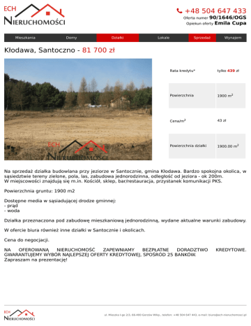 +48504647433 Ofertanumer90/1646/OGS OpiekunofertyEmilaCupa Mieszkania Domy Działki Lokale Sprzedaż Wynajem Kłodawa,Santoczno-81700zł Ratakredytu* tylko439zł Powierzchnia 1900m2 Cena/m2 43zł Powierzchniadziałki 1900.00m2 NasprzedażdziałkabudowlanaprzyjeziorzewSantocznie,gminaKłodawa.Bardzospokojnaokolica,w sąsiedztwieterenyzielone,pola,las,zabudowajednorodzinna,odległośćodjeziora-ok200m. Wmiejscowościznajdująsięm.in.Kościół,sklep,bar/restauracja,przystanekkomunikacjiPKS. Powierzchniagruntu:1900m2 Dostępnemediawsąsiadującejdrodzegminnej: -prąd -woda Działkaprzeznaczonapodzabudowęmieszkaniowąjednorodzinną,wydaneaktualnewarunkizabudowy. WoferciebiurarównieżinnedziałkiwSantocznieiokolicach. Cenadonegocjacji. NA OFEROWANĄ NIERUCHOMOŚĆ ZAPEWNIAMY BEZPŁATNE DORADZTWO GWARANTUJEMYWYBÓRNAJLEPSZEJOFERTYKREDYTOWEJ,SPOŚRÓD25BANKÓW. Zapraszamnaprezentację! KREDYTOWE. ul.MieszkaI-go2/3,66-400GorzówWlkp.,telefon:+48504647443,e-mail:[email protected]
