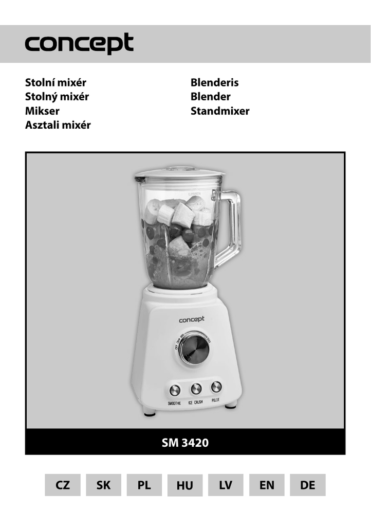 Stolní mixér Stolný mixér Mikser Asztali mixér Blenderis Blender Standmixer SM 3420 CZ SK PL HU LV EN DE CZ PODĚKOVÁNÍ Děkujeme Vám, že jste si zakoupili výrobek značky Concept a přejeme Vám, abyste byli s naším výrobkem spokojeni po celou dobu jeho používání. Před prvním použitím prostudujte pozorně celý návod k obsluze a potom si jej uschovejte. Zajistěte, aby i ostatní osoby, které budou s výrobkem manipulovat, byly seznámeny s tímto návodem. Technické parametry Napětí Příkon 220–240 V~ 50/60 Hz 800 W Hladina akustického výkonu max. 88 dB(A) Doba nepřetržitého provozu KB max. 120 sec. Dvojitá nebo zesílená izolace DŮLEŽITÁ BEZPEČNOSTNÍ UPOZORNĚNÍ • • • • • • • • • • • • • • • • • • • • • Nepoužívejte spotřebič jinak, než je popsáno v tomto návodu. Před prvním použitím odstraňte ze spotřebiče všechny obaly a marketingové materiály. Ověřte, zda připojované napětí odpovídá hodnotám na typovém štítku spotřebiče. Nenechávejte spotřebič bez dozoru, pokud je zapnutý, popřípadě zapojený do zásuvky elektrického napětí. Přístroj pokládejte na stabilní rovný povrch, nepokládejte ho na jakýkoliv jiný spotřebič. Neumisťujte spotřebič do blízkosti hořlavých látek, ohně, topných elementů nebo rozpálené trouby. Nezakrývejte spotřebič, hrozí nebezpečí přehřátí. Nic na spotřebič nepokládejte během provozu. Nepřenášejte spotřebič zapnutý. Udržujte spotřebič v čistotě, nedovolte, aby cizí tělesa pronikla do otvorů mřížek. Mohla by způsobit zkrat, poškodit spotřebič nebo způsobit požár. Při vypojování spotřebiče ze zásuvky elektrického napětí nikdy netahejte za přívodní kabel, ale uchopte zástrčku a tahem ji vypojte. Nedovolte dětem a nesvéprávným osobám se spotřebičem manipulovat, používejte ho mimo jejich dosahu. Osoby se sníženou pohybovou schopností, se sníženým smyslovým vnímáním, s nedostatečnou duševní způsobilostí nebo osoby neseznámené s obsluhou musí používat spotřebič jen pod dozorem zodpovědné seznámené osoby. Dbejte zvýšené opatrnosti, pokud je spotřebič používán v blízkosti dětí. Nedovolte, aby byl spotřebič používán jako hračka. Zabraňte tomu, aby přívodní kabel volně visel přes hranu pracovní desky, kde by na něho mohly dosáhnout děti. Nepoužívejte spotřebič ve venkovním prostředí nebo na mokrém povrchu, hrozí nebezpečí úrazu elektrickým proudem. Nepoužívejte jiné příslušenství, než je doporučeno výrobcem. Nepoužívejte spotřebič s poškozeným přívodním kabelem či zástrčkou, nechte závadu neprodleně odstranit autorizovaným servisním střediskem. Netahejte a nepřenášejte spotřebič za přívodní kabel. Držte spotřebič stranou od zdrojů tepla, jako jsou radiátory, trouby a podobně. Chraňte jej před přímým slunečním zářením, vlhkostí. SM 3420 3 CZ CZ • Nesahejte na spotřebič vlhkýma nebo mokrýma rukama. • Při nasazování příslušenství, během čištění nebo v případě poruchy vypněte spotřebič a vytáhněte zástrčku ze zásuvky elektrického napětí. • Nedotýkejte se pohyblivých součástí během provozu spotřebiče. Vyčkejte, až se úplně zastaví. • Spotřebič je vhodný pouze pro použití v domácnosti, není určen pro komerční použití. • Neponořujte přívodní kabel, zástrčku nebo spotřebič do vody ani do jiné kapaliny. • Pravidelně kontrolujte spotřebič i přívodní kabel z důvodu poškození. Nezapínejte poškozený spotřebič. • Nenechávejte volně viset vlasy a části oblečení blízko otvorů a pohybujících se částí spotřebiče. • Před připojením nebo vypojením spotřebiče ze zásuvky elektrického napětí se ujistěte, že je vypínač v poloze vypnuto. • Vždy dbejte zvýšené opatrnosti, když manipulujete s noži a krájecími kotouči. Jsou velmi ostré a mohou způsobit poranění. • Před čištěním a po použití spotřebič vypněte, vypojte ze zásuvky elektrického napětí a nechte vychladnout. • Spotřebič obsahuje ostré části. Při čištění dbejte zvýšené opatrnosti. • Nenechávejte přívodní kabel viset volně přes hranu pracovní desky. Dbejte na to, aby se nedotýkal horkých povrchů. • Nenechávejte spotřebič viset na přívodním kabelu. • Nepoužívejte spotřebič bez správně nasazeného příslušenství. • Nenechte běžet spotřebič naprázdno. • Neopravujte spotřebič sami. Obraťte se na autorizovaný servis. • Tento spotřebič mohou používat děti ve věku 8 let a starší a osoby se sníženými fyzickými či mentálními schopnostmi nebo nedostatkem zkušeností a znalostí, pokud jsou pod dozorem nebo byly poučeny o používání spotřebiče bezpečným způsobem a rozumí případným nebezpečím. Čištění a údržbu prováděnou uživatelem nesmějí provádět děti, pokud nejsou starší 8 let a pod dozorem. Děti mladší 8 let se musí držet mimo dosah spotřebiče a jeho přívodu. Děti si se spotřebičem nesmějí hrát. 1 6 2 3 POPIS VÝROBKU 1 2 3 4 5 6 7 8 9 10 11 12 7 Odměrka Těsnění víka Nádoba Nože Podstava nádoby Otevírání víka Držadlo Základna Regulace rychlosti (otočný přepínač) Tlačítko smoothie makeru Tlačítko režimu pro drcení ledu Tlačítko PULSE 4 5 8 9 Nedodržíte-li pokyny výrobce, nemůže být případná oprava uznána jako záruční. Inteligentní tlačítka 10 11 12 Otočný přepínač má tři polohy ON, OFF a Plynulá regulace otáček. Dále jsou zde tři tlačítka: SMOOTHIE (pozvolné mixování), ICE CRUSH (režim pro drceni ledu) a PULSE. ON/OFF přepínač Tento přepínač rychlostí zastaví chod mixéru, nebo změní rychlost otáček. Důležité: Aby mohl mixér začít pracovat, musí se přepínač otočit z polohy OFF.