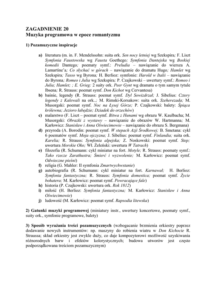 ZAGADNIENIE 20 Muzyka programowa w epoce romantyzmu 1) Pozamuzyczne inspiracje a) literatura (m. in. F. Mendelssohn: suita ork. Sen nocy letniej wg Szekspira; F. Liszt Symfonia Faustowska wg Fausta Goethego; Symfonia Dantejska wg Boskiej komedii Dantego; poematy symf.: Preludia – nawiązanie do wiersza A. Lamartine’a; Co słychać w górach – nawiązanie do dramatu Hugo; Hamlet wg Szekspira; Tasso wg Byrona; H. Berlioz: symfonie: Harold w Italii – nawiązanie do Byrona; Romeo i Julia wg Szekspira; P. Czajkowski – uwertury symf.: Romeo i Julia; Hamlet; ; E. Grieg: 2 suity ork. Peer Gynt wg dramatu o tym samym tytule Ibsena; R. Strauss: poemat symf. Don Kichot wg Cervantesa) b) baśnie, legendy (R. Strauss: poemat symf. Dyl Sowizdrzał; J. Sibelius: Cztery legendy z Kalewali na ork..; M. Rimski-Korsakow: suita ork. Szeherezada; M. Musorgski: poemat symf. Noc na Łysej Górze; P. Czajkowski: balety: Śpiąca królewna; Jezioro łabędzie; Dziadek do orzechów) c) malarstwo (F. Liszt – poemat symf. Bitwa z Hunami wg obrazu W. Kaulbacha; M. Musorgski: Obrazki z wystawy – nawiązanie do obrazów W. Hartmanna; M. Karłowicz: Stanisław i Anna Oświecimowie – nawiązanie do obrazu S. Bergmana) d) przyroda (A. Borodin: poemat symf. W stepach Azji Środkowej; B. Smetana: cykl 6 poematów symf. Moja ojczyzna; J. Sibelius: poemat symf. Finlandia; suita ork. Karelia; R. Strauss: Symfonia alpejska; Z. Noskowski: poemat symf. Step; uwertura Morskie Oko; Wł. Żeleński: uwertura W Tatrach) e) filozofia (R. Schumann: cykl miniatur na fort. Motyle; R. Strauss: poematy symf.: Tako rzecze Zarathustra; Śmierć i wyzwolenie; M. Karłowicz: poemat symf. Odwieczne pieśni) f) religia (G. Mahler: II symfonia Zmartwychwstanie) g) autobiografia (R. Schumann: cykl miniatur na fort. Karnawał; H. Berlioz: Symfonia fantastyczna; R. Strauss: Symfonia domestica; poemat symf. Życie bohatera; M. Karłowicz: poemat symf. Powracające fale) h) historia (P. Czajkowski: uwertura ork. Rok 1812) i) miłość (H. Berlioz: Symfonia fantastyczna; M. Karłowicz: Stanisław i Anna Oświecimowie) j) ludowość (M. Karłowicz: poemat symf. Rapsodia litewska) 2) Gatunki muzyki programowej (miniatury instr., uwertury koncertowe, poematy symf., suity ork., symfonie programowe, balety) 3) Sposób wyrażania treści pozamuzycznych (wzbogacanie brzmienia orkiestry poprzez dodawanie nowych instrumentów: np. maszyny do robienia wiatru w Don Kichocie R. Straussa; skład orkiestry jest zwykle duży, co daje kompozytorowi możliwość uzyskiwania różnorodnych barw i efektów kolorystycznych; budowa utworów jest często podporządkowana treściom pozamuzycznym)
