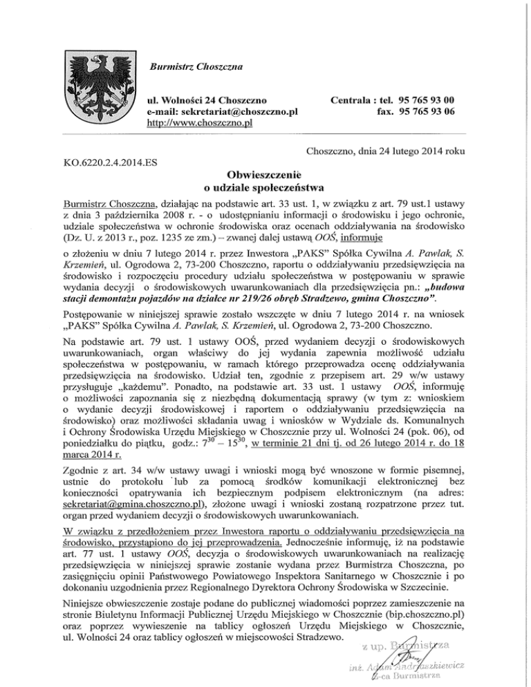 Burmistrz Choszczna Centrala : tel. 95 765 93 00 fax. 95 765 93 06 ul. Wolności 24 Choszczno e-mail: [email protected] http://www.choszczno.pl Choszczno, dnia 24 lutego 2014 roku KO.6220.2.4.2014.ES Obwieszczenie o udziale społeczeństwa Burmistrz Choszczna, działając na podstawie art. 33 ust. 1, w związku z art. 79 ust.l ustawy z dnia 3 października 2008 r. - o udostępnianiu informacji o środowisku i jego ochronie, udziale społeczeństwa w ochronie środowiska oraz ocenach oddziaływania na środowisko (Dz. U . z 2013 r., poz. 1235 ze zm.) - zwanej dalej ustawą OOS, infoimuje o złożeniu w dniu 7 lutego 2014 r. przez Inwestora „PAKS" Spółka Cywilna A. Pawlak, S. Krzemień, ul. Ogrodowa 2, 73-200 Choszczno, raportu o oddziaływaniu przedsięwzięcia na środowisko i rozpoczęciu procedury udziału społeczeństwa w postępowaniu w sprawie wydania decyzji o środowiskowych uwarunkowaniach dla przedsięwzięcia pn.: „budowa stacji demontażu pojazdów na działce nr 219/26 obręb Stradzewo, gmina Choszczno". Postępowanie w niniejszej sprawie zostało wszczęte w dniu 7 lutego 2014 r. na wniosek „PAKS" Spółka Cywilna^. Pawlak, S. Krzemień, ul. Ogrodowa 2, 73-200 Choszczno. N a podstawie art. 79 ust. 1 ustawy OOS, przed wydaniem decyzji o środowiskowych uwarunkowaniach, organ właściwy do jej wydania zapewnia możliwość udziału społeczeństwa w postępowaniu, w ramach którego przeprowadza ocenę oddziaływania przedsięwzięcia na środowisko. Udział ten, zgodnie z przepisem art. 29 w/w ustawy przysługuje „każdemu". Ponadto, na podstawie art. 33 ust. 1 ustawy OOS, informuję o możliwości zapoznania się z niezbędną dokumentacją sprawy (w tym z: wnioskiem 0 wydanie decyzji środowiskowej i raportem o oddziaływaniu przedsięwzięcia na środowisko) oraz możliwości składania uwag i wniosków w Wydziale ds. Komunalnych 1 Ochrony Środowiska Urzędu Miejskiego w Choszcznie przy ul. Wolności 24 (pok. 06), od 30 30 poniedziałku do piątku, godz.: 7 - 15 , w terminie 21 dni tj. od 26 lutego 2014 r. do 18 marca 2014 r. Zgodnie z art. 34 w/w ustawy uwagi i wnioski mogą być wnoszone w formie pisemnej, ustnie do protokołu lub za pomocą środków komunikacji elektronicznej bez konieczności opatrywania ich bezpiecznym podpisem elektronicznym (na adres: [email protected]), złożone uwagi i wnioski zostaną rozpatrzone przez tut. organ przed wydaniem decyzji o środowiskowych uwarunkowaniach. W związku z przedłożeniem przez Inwestora raportu o oddziaływaniu przedsięwzięcia na środowisko, przystąpiono do jej przeprowadzenia. Jednocześnie informuję, iż na podstawie art. 77 ust. 1 ustawy OOŚ, decyzja o środowiskowych uwarunkowaniach na realizację przedsięwzięcia w niniejszej sprawie zostanie wydana przez Burmistrza Choszczna, po zasięgnięciu opinii Państwowego Powiatowego Inspektora Sanitarnego w Choszcznie i po dokonaniu uzgodnienia przez Regionalnego Dyrektora Ochrony Środowiska w Szczecinie. Niniejsze obwieszczenie zostaje podane do publicznej wiadomości poprzez zamieszczenie na stronie Biuletynu Informacji Publicznej Urzędu Miejskiego w Choszcznie (bip.choszczno.pl) oraz poprzez wywieszenie na tablicy ogłoszeń Urzędu Miejskiego w Choszcznie, ul. Wolności 24 oraz tablicy ogłoszeń w miejscowości Stradzewo. xi