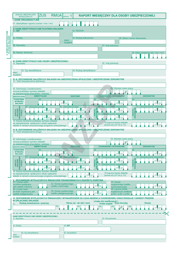 ZAK£AD UBEZPIECZEÑ SPO£ECZNYCH ZUS RMUA strona: 1 RAPORT MIESIÊCZNY DLA OSOBY UBEZPIECZONEJ I. DANE ORGANIZACYJNE II. DANE IDENTYFIKACYJNE P£ATNIKA SK£ADEK 01. NIP 02. REGON 04. Rodzaj dokumentu 03. PESEL 05. Seria i numer dokumentu INNY NUMER 06. Nazwisko 07. Imiê pierwsze 08. Nazwa skrócona 09. Data urodzenia (dd / mm / rrrr) III. DANE IDENTYFIKACYJNE OSOBY UBEZPIECZONEJ 01. Nazwisko 03. Typ identyfikatora 02. Imiê pierwsze 04. Rodzaj identyfikatora INNY NUMER IV. A. ZESTAWIENIE NALE¯NYCH SK£ADEK NA UBEZPIECZENIA SPO£ECZNE I UBEZPIECZENIE ZDROWOTNE 01. Tytu³ ubezpieczenia (pierwszy) 03. Wymiar czasu pracy 02. Informacja o przekroczeniu rocznej podstawy wymiaru sk³adek na ubezpieczenia emerytalne i rentowe , z³ , gr 07. Ubezpieczonego , , z³ , gr z³ , gr 05. z³ gr , z³ , gr z³ gr 12. P³atnika 14. Kwota obni¿enia podstawy wymiaru sk³adek na ubezpieczenia spo³eczne z tytu³u op³acania sk³adki w ramach pracowniczego programu emerytalnego ZDROWOTNE , z³ , gr 06. z³ gr z³ gr 09. Ubezpieczenie chorobowe 08. Ubezpieczonego z³ gr 11. P³atnika CHOROBOWE I WYPADKOWE RENTOWE 13. Ubezpieczenie wypadkowe , 10. Ubezpieczenie zdrowotne KWOTA SK£ADKI NA: 04. KWOTA SK£ADKI NA: EMERYTALNE PODSTAWA WYMIARU SK£ADKI KWOTA SK£ADKI FINANSOWANA PRZEZ: UBEZPIECZENIE , 15.£¹czna kwota sk³adek (suma od p.07 do p.13) z³ gr z³ gr IV. B. ZESTAWIENIE NALE¯NYCH SK£ADEK NA UBEZPIECZENIA SPO£ECZNE I UBEZPIECZENIE ZDROWOTNE 01. Tytu³ ubezpieczenia (drugi) 03. Wymiar czasu pracy 02. Informacja o przekroczeniu rocznej podstawy wymiaru sk³adek na ubezpieczenia emerytalne i rentowe 04. , z³ , gr 07. Ubezpieczonego , z³ gr , z³ , gr 14. Kwota obni¿enia podstawy wymiaru sk³adek na ubezpieczenia spo³eczne z tytu³u op³acania sk³adki w ramach pracowniczego programu emerytalnego ZDROWOTNE 06. z³ gr 09. Ubezpieczenie chorobowe z³ gr 12. P³atnika , z³ , gr z³ , gr 05. 08. Ubezpieczonego z³ gr 11. P³atnika CHOROBOWE I WYPADKOWE RENTOWE 13. Ubezpieczenie wypadkowe , 15.£¹czna kwota sk³adek (suma od p.07 do p.13) z³ gr V. ZESTAWIENIE WYP£ACONYCH ŒWIADCZEÑ FINANSOWANYCH Z BUD¯ETU PAÑSTWA 01. Liczba osób, 02. Kwota wyp³aconego na które wyp³acany z³ gr zasi³ku rodzinnego jest zasi³ek rodzinny 04. Liczba osób, 05. Kwota wyp³aconego na które wyp³acany jest z³ gr zasi³ku pielêgnacyjnego zasi³ek pielêgnacyjny , , 03. Kwota wyp³aconego zasi³ku wychowawczego 06. £¹czna kwota wyp³aconych zasi³ków (p.02 + p.03 + p.05) VI. ZESTAWIENIE WYP£ACONYCH ŒWIADCZEÑ I WYNAGRODZEÑ ZA CZAS ABSENCJI CHOROBOWEJ ORAZ RODZAJE I OKRESY PRZERW W OP£ACANIU SK£ADEK Liczba dni zasi³kowych / Kwota Okres od - do (dd / mm) Rodzaj œwiadczenia / przerwy liczba wyp³at Kod choroby 01. 02. 03. 04. 05. 06. DANE IDENTYFIKACYJNE OSOBY UBEZPIECZONEJ 01. Nazwisko 03. PESEL 05. Typ identyfikatora INNY NUMER 02. Imiê pierwsze 04. NIP 06. Identyfikator , z³ , gr z³ gr 10. Ubezpieczenie zdrowotne KWOTA SK£ADKI NA: EMERYTALNE PODSTAWA WYMIARU SK£ADKI KWOTA SK£ADKI NA: UBEZPIECZENIE KWOTA SK£ADKI FINANSOWANA PRZEZ: II. DANE IDENTYFIKACYJNE P£ATNIKA SK£ADEK 01. Identyfikator raportu (numer / mm / rrrr) , z³ gr , z³ , gr z³ gr , z³ gr # ZAK£AD UBEZPIECZEÑ SPO£ECZNYCH ZUS RMUA strona: 2 RAPORT MIESIÊCZNY DLA OSOBY UBEZPIECZONEJ VI. ZESTAWIENIE WYP£ACONYCH ŒWIADCZEÑ I WYNAGRODZEÑ ZA CZAS ABSENCJI CHOROBOWEJ ORAZ RODZAJE I OKRESY PRZERW W OP£ACANIU SK£ADEK Liczba dni zasi³kowych / Rodzaj œwiadczenia / przerwy Okres od - do (dd / mm) liczba wyp³at Kod choroby Kwota 07. 08. 09. 10. 11. 12. 13. 14. 15. 16. 17. 18. 20. 21. 22. 23. 24. 26. 27. 28. 29. 30. 32. 33. 34. 35. 36. 38. 39. 40. 41. 42. 44. 45. 46. 47. 48. 19. 25. 31. 37. 43. , z³ , gr z³ , gr z³ , gr z³ , gr z³ , gr z³ , gr z³ gr VII OŒWIADCZENIE P£ATNIKA SK£ADEK 01. Data wype³nienia (dd / mm / rrrr) Oœwiadczam, ¿e dane zawarte w formularzu s¹ zgodne ze stanem prawnym i faktycznym. Jestem œwiadomy(a) odpowiedzialnoœci karnej za zeznanie nieprawdy lub zatajenie prawdy. 02. Podpis p³atnika sk³adek lub osoby przez niego upowa¿nionej oraz piecz¹tka adresowa p³atnika # 01. Okres, którego raport dotyczy (mm / rrrr) 02. Kod oddzia³u NFZ 03. Podpis p³atnika sk³adek lub osoby przez niego upowa¿nionej oraz piecz¹tka adresowa p³atnika