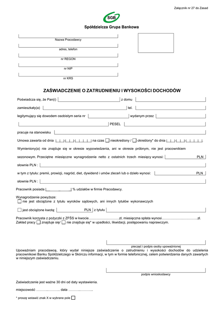 Załącznik nr 27 do Zasad Nazwa Pracodawcy adres, telefon nr REGON nr NIP nr KRS ZAŚWIADCZENIE O ZATRUDNIENIU I WYSOKOŚCI DOCHODÓW Poświadcza się, że Pan(i) z domu zamieszkały(a) tel. legitymujący się dowodem osobistym seria nr wydanym przez PESEL pracuje na stanowisku Umowa zawarta od dnia | | |-| | |-| | | | | na czas nieokreślony / określony* do dnia | | |-| | |-| | | | |. Wymieniony(a) nie znajduje się w okresie wypowiedzenia, ani w okresie próbnym, nie jest pracownikiem sezonowym. Przeciętne miesięczne wynagrodzenie netto z ostatnich trzech miesięcy wynosi: PLN słownie PLN : w tym z tytułu: premii, prowizji, nagród, diet, dywidend i umów zleceń lub o dzieło wynosi: PLN słownie PLN : Pracownik posiada |__ _ _| % udziałów w firmie Pracodawcy. Wynagrodzenie powyższe: nie jest obciążone z tytułu wyroków sądowych, ani innych tytułów wykonawczych jest obciążone kwotą: PLN z tytułu Pracownik korzysta z pożyczki z ZFŚS w kwocie………………………zł, miesięczna spłata wynosi…………………………..zł. Zakład pracy znajduje się/ nie znajduje się* w upadłości, likwidacji, postępowaniu naprawczym. pieczęć i podpis osoby upoważnionej Upoważniam pracodawcę, który wydał niniejsze zaświadczenie o zatrudnieniu i wysokości dochodów do udzielenia pracownikowi Banku Spółdzielczego w Skórczu informacji, w tym w formie telefonicznej, celem potwierdzenia danych zawartych w niniejszym zaświadczeniu. podpis wnioskodawcy Zaświadczenie jest ważne 30 dni od daty wystawienia. miejscowość ………..……….. data ………..………... * proszę wstawić znak X w wybrane pole