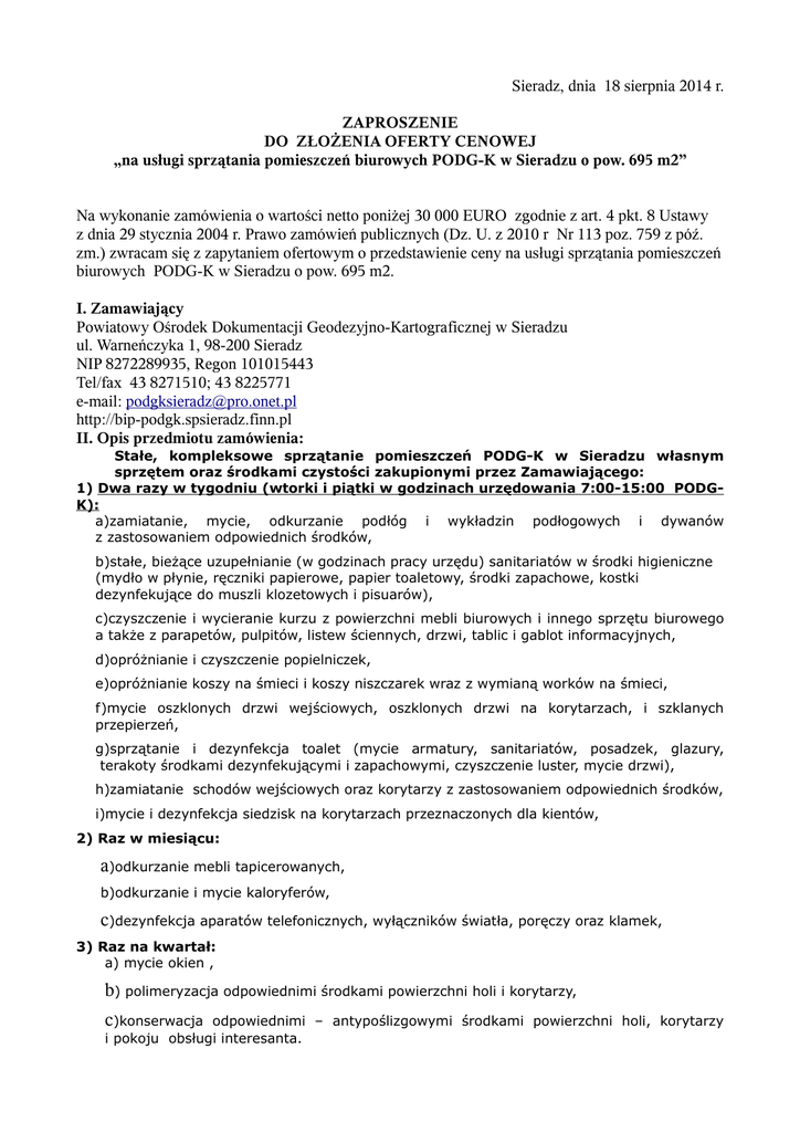 Sieradz, dnia 18 sierpnia 2014 r. ZAPROSZENIE DO ZŁOŻENIA OFERTY CENOWEJ „na usługi sprzątania pomieszczeń biurowych PODG-K w Sieradzu o pow. 695 m2” Na wykonanie zamówienia o wartości netto poniżej 30 000 EURO zgodnie z art. 4 pkt. 8 Ustawy z dnia 29 stycznia 2004 r. Prawo zamówień publicznych (Dz. U. z 2010 r Nr 113 poz. 759 z póź. zm.) zwracam się z zapytaniem ofertowym o przedstawienie ceny na usługi sprzątania pomieszczeń biurowych PODG-K w Sieradzu o pow. 695 m2. I. Zamawiający Powiatowy Ośrodek Dokumentacji Geodezyjno-Kartograficznej w Sieradzu ul. Warneńczyka 1, 98-200 Sieradz NIP 8272289935, Regon 101015443 Tel/fax 43 8271510; 43 8225771 e-mail: [email protected] http://bip-podgk.spsieradz.finn.pl II. Opis przedmiotu zamówienia: Stałe, kompleksowe sprzątanie pomieszczeń PODG-K w Sieradzu własnym sprzętem oraz środkami czystości zakupionymi przez Zamawiającego: 1) Dwa razy w tygodniu (wtorki i piątki w godzinach urzędowania 7:00-15:00 PODGK): a)zamiatanie, mycie, odkurzanie podłóg i wykładzin podłogowych i dywanów z zastosowaniem odpowiednich środków, b)stałe, bieżące uzupełnianie (w godzinach pracy urzędu) sanitariatów w środki higieniczne (mydło w płynie, ręczniki papierowe, papier toaletowy, środki zapachowe, kostki dezynfekujące do muszli klozetowych i pisuarów), c)czyszczenie i wycieranie kurzu z powierzchni mebli biurowych i innego sprzętu biurowego a także z parapetów, pulpitów, listew ściennych, drzwi, tablic i gablot informacyjnych, d)opróżnianie i czyszczenie popielniczek, e)opróżnianie koszy na śmieci i koszy niszczarek wraz z wymianą worków na śmieci, f)mycie oszklonych drzwi wejściowych, oszklonych drzwi na korytarzach, i szklanych przepierzeń, g)sprzątanie i dezynfekcja toalet (mycie armatury, sanitariatów, posadzek, glazury, terakoty środkami dezynfekującymi i zapachowymi, czyszczenie luster, mycie drzwi), h)zamiatanie schodów wejściowych oraz korytarzy z zastosowaniem odpowiednich środków, i)mycie i dezynfekcja siedzisk na korytarzach przeznaczonych dla kientów, 2) Raz w miesiącu: a)odkurzanie mebli tapicerowanych, b)odkurzanie i mycie kaloryferów, c)dezynfekcja aparatów telefonicznych, wyłączników światła, poręczy oraz klamek, 3) Raz na kwartał: a) mycie okien , b) polimeryzacja odpowiednimi środkami powierzchni holi i korytarzy, c)konserwacja odpowiednimi – antypoślizgowymi środkami powierzchni holi, korytarzy i pokoju obsługi interesanta. 4) Każdorazowo: a)generalne sprzątanie po malowaniu i remontach pomieszczeń w dniach i godzinach uzgodnionych z Zamawiającym. b)środki chemiczne używane do utrzymania czystości muszą posiadać świadectwo jakości zdrowotnej PZH. c) Wykonawca zobowiązany jest w zakresie realizacji zamówienia wykonać dodatkowe czynności porządkowe po usuniętych awariach. Wykaz powierzchni i urządzeń sanitarnych przeznaczonych do sprzątania: 1 Budynek biurowy Powiatowego Ośrodka Dokumentacji Kartograficznej w Sieradzu ul. Warneńczyka 1 Biuro usytuowane na parterze, ogólna powierzchnia - 695 m2 a)pokoje biurowe b)pomieszczenia gospodarcze c)pomieszczenia archiwum d)pomieszczenie magazynowe e)sala (zasób) f)serwerownia g)korytarz/hol h)kuchnia i)wiatrołap j)okna k) oszklone przepierzenia na holu Powierzchnie: − wykładzina dywanowa − płytki PCV − płytki ceramiczne podłogowe − lustra - płytki ceramiczne ścienne - parkiet Łazienki w tym: umywalki muszle klozetowe pisuary zlewozmywak w kuchni Ilość podajników: − na mydło w płynie − na ręczniki do rąk. - ilość koszy na śmieci - koszo-popielniczki wystawione na zewnątrz 14 1 1 1 1 1 2 1 1 29 szt (pow. 71,355m2) 2 szt (pow. 25x2,3=11,50m2) ok. ok. ok. ok. ok. ok. 3 5 4 2 1 264,71 67,79 220,33 5,00 83,38 141,00 m2 m2 m2 m2 m2 m2 szt szt. szt. szt. szt. 5 szt. 5 szt 25 szt. 2 szt Drzwi drzwi wewnętrzne drzwi wewnętrzne drzwi zewnętrzne przeszklone przeszklone Geodezyjno- - 23 szt (pow. 0,9x2x23=41,40m2) - 5 szt ( pow. ok. 17 m2 ) - 2 szt ( pow. ok. 12 m2 ) 1) PODG-K zatrudnia na stałe 14 pracowników. 2) Odzież ochronną zapewnia Wykonawca dla osób wykonujących usługę. 3)Zapłata za usługi sprzątania pomieszczeń biurowych PODG-K w Sieradzu o pow. 695 m2 będzie dokonana bezgotówkowo przelewem bankowym na wskazany przez Wykonawcę rachunek bankowy, w ciągu 14 dni, od daty dostarczenia Zamawiającemu prawidłowo wystawionej faktury VAT lub rachunku w terminie miesięcznym na koniec każdego miesiąca. III. Oznaczenie terminu wykonania zamówienia: Wymagany termin realizacji usługi sprzątania pomieszczeń biurowych PODG-K w Sieradzu o pow. 695 m2 w okresie od 01 października 2014 r. do dnia 31 grudnia 2015 r. IV. Sposób przygotowania oferty: Oferent powinien stworzyć ofertę na formularzu załączonym do niniejszego zapytania. Oferta powinna być: -opatrzona pieczątką firmową Wykonawcy lub należy wpisać nazwę oferenta -posiadać datę sporządzenia, -zawierać adres lub siedzibę oferenta, numer telefonu, numer NIP, -podpisana czytelnie przez Wykonawcę. -ofertę należy opakować w kopertę, opisać „zaproszenie ofertowe na usługi sprzątania pomieszczeń biurowych PODG-K w Sieradzu o pow. 695 m2” V. Miejsce oraz termin składania ofert 1.Ofertę na formularzu ofertowym, który stanowi załącznik do niniejszego zaproszenia należy złożyć w terminie do dnia 26 sierpnia 2014 r. do godz. 10:00 w formie: – pisemnej (osobiście, listownie) na adres: Powiatowy Ośrodek Dokumentacji GeodezyjnoKartograficznej w Sieradzu ul. Warneńczyka 1, 98-200 Sieradz, - Oferty zawierające braki formalne nie będą rozpatrywane. 2.Ocena ofert zostanie dokonana w dniu 26.08.2014 r. o godz. 10:05, a wyniki i wybór najkorzystniejszej cenowo oferty zostanie wywieszone w formie ogłoszenia w dniu 26.08.2014 r. w siedzibie PODG-K w Sieradzu na tablicy ogłoszeń oraz umieszczone na stronie internetowej http://bip-podgk.spsieradz.finn.pl 3. Oferty złożon