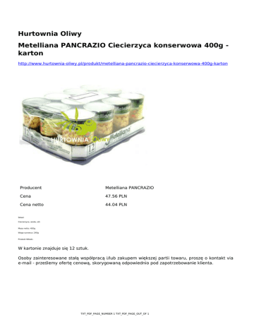 Hurtownia Oliwy Metelliana PANCRAZIO Ciecierzyca konserwowa 400g karton http://www.hurtownia-oliwy.pl/produkt/metelliana-pancrazio-ciecierzyca-konserwowa-400g-karton Producent Metelliana PANCRAZIO Cena 47.56 PLN Cena netto 44.04 PLN Skład: Ciecierzyca, woda, sól. Masa netto: 400g Waga surowca: 240g Produkt Włoski. W kartonie znajduje się 12 sztuk. Osoby zainteresowane stałą współpracą i/lub zakupem większej partii towaru, proszę o kontakt via e-mail - prześlemy ofertę cenową, skorygowaną odpowiednio pod zapotrzebowanie klienta. TXT_PDF_PAGE_NUMBER 1 TXT_PDF_PAGE_OUT_OF 1