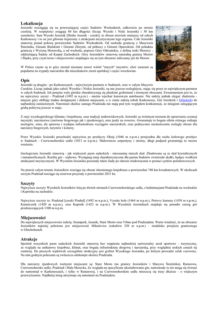 Lokalizacja Jesioniki rozciągają się na przeważającej części Sudetów Wschodnich, całkowicie po stronie czeskiej. W rozpiętości osiągają 80 km długości (licząc Wysoki i Niski Jesionik) i 30 km szerokości. Sam Wysoki Jesionik [Hruby Jesenik - czeski], to obszar niewiele mniejszy od całych Karkonoszy i to on jest głównie kojarzony z atrakcjami turystycznymi tego regionu. Całe Jesioniki stanowią ponad połowę powierzchni Sudetów Wschodnich. Od zachodu graniczą z Masywem Śnieżnika, Górami Bialskimi i Górami Złotymi, od północy z Górami Opawskimi. Od południa graniczą z Wyżyną Morawską, a od wschodu, poprzez Góry Odrzańskie, z doliną rzeki Morawy oddzielającą Sudety od Karpat Zachodnich. Góry Jesioników stanowią naturalną granicę Moraw i Śląska, przy czym teren i miejscowości znajdujące się na tym obszarze zaliczamy już do Moraw. W Polsce często są to góry niemal nieznane nawet wśród "starych" turystów, choć zarazem są popularne na wypady narciarskie dla mieszkańców ziemi opolskiej i części wrocławian. Opis Jesioniki są drugim - po Karkonoszach - najwyższym pasmem w Sudetach, oraz w całym Masywie Czeskim. Licząc jednak jako całość Wysokie i Niskie Jesioniki, są one jeszcze rozleglejsze, stając się przez to największym pasmem w całych Sudetach. Ich potężne wały górskie charakteryzują się płaskimi grzbietami i stromymi zboczami. Ewenementem jest to, że na najwyższy szczyt - Pradziad (1492 m n.p.m.) - można wjechać kursowym autobusem. Nie należy jednak ulegać złudzeniu tutejsze góry obfituję trudno dostępnymi i dzikimi miejscami, a w zimie należą (obok Karkonoszy, Gór Izerskich i Orlickich) do najbardziej zaśnieżonych. Natomiast okolice samego Pradziada nie mają pod tym względem konkurencji, ze śniegiem zalegającym grubą pokrywą jeszcze w maju. Z racji wysokogórskiego klimatu i krajobrazu, oraz tradycji uzdrowiskowych, Jesioniki są świetnym terenem do uprawiania czynnej turystyki, narciarstwa (zarówno biegowego jak i zjazdowego), oraz jazdy na rowerze. Gwarantuje to bogata oferta różnego rodzaju noclegów, stara, ale sprawna i wydajna infrastruktura wyciągów narciarskich, oraz praktycznie nieskończenie rozległy obszar dla narciarzy biegowych, turystów i kolarzy. Przez Wysokie Jesioniki przechodzi najwyższa po przełęczy Okraj (1046 m n.p.m.) przejezdna dla ruchu kołowego przełęcz w Sudetach - Czerwonohorskie sedlo (1013 m n.p.m.). Malownicze serpentyny i stromy, długi podjazd gwarantują tu mocne wrażenia. Geologicznie Jesioniki stanowią - jak większość pasm sudeckich - mieszaninę starych skał. Zbudowane są ze skał krystalicznych i metamorficznych. Rzeźba gór - zrębowa. Występują tutaj charakterystyczne dla pasma Sudetów zwietrzałe skałki, będące wielkimi atrakcjami turystycznymi. W Wysokim Jesioniku pozostały także ślady po okresie zlodowacenia w postaci cyrków polodowcowych. Na prawie całym terenie Jesioników rozciąga się obszar chronionego krajobrazu o powierzchni 740 km kwadratowych. W okolicach szczytu Pradziad rozciąga się rezerwat przyrody o powierzchni 2031 ha. Szczyty Najwyższe szczyty Wysokich Jesioników leżą po dwóch stronach Czerwonohorskiego sedla, z kulminacjami Pradziada na wschodzie i Keprnika na zachodzie. Najwyższe szczyty to: Pradziad [czeski Praded] (1492 m n.p.m.), Vysoke hole (1464 m n.p.m.), Petrovy kameny (1438 m n.p.m.), Kamzicznik (1420 m n.p.m.), oraz Keprnik (1423 m n.p.m.). W Wysokich Jesionikach znajduje się ponadto szereg gór przekraczających 1300 m n.p.m. Miejscowości Do największych miejscowości należą: Szumperk, Jesenik, Stare Mesto oraz Vrbno pod Pradziadem. Warto wiedzieć, że na obszarze Jesioników najniżej położona jest miejscowość Mikulovice (zaledwie 320 m n.p.m.) - niedaleko przejścia granicznego w Głuchołazach. Atrakcje Spośród wszystkich pasm sudeckich Jesioniki stanowią bez wątpienia najbardziej uniwersalny areał sportowo - turystyczny, ze względu na unikatowy krajobraz, klimat, oraz bogatą infrastrukturę drogową i narciarską, przy względnie niskich cenach tej ostatniej. Do pieszych wędrówek szczególnie atrakcyjny jest grzbiet Wysokiego Jesionika, po którym prowadzi szlak czerwony. Na nim godnym polecenia są zwłaszcza odsłonięte okolice Pradziada. Dla narciarzy zjazdowych ważnymi miejscami są: Stare Mesto (na granicy Jesioników i Masywu Śnieżnika), Ramzowa, Czerwonohorske sedlo, Pradziad i Mala Moravka. Ze względu na specyficzne ukształtowanie gór, nartostrady te nie mogą się równać do nartostrad w Karkonoszach, i tylko w Ramzowej, i na Czerwonohorskim sedlu mieszczą się trasy dłuższe - o większym przewyższeniu. Najdłużej śnieg utrzymuje się natomiast na Pradziadzie. Najatrakcyjniejsze trasy biegowe mieszczę się w okolicach Czerwonohorskiego sedla, zarówno w stronę zachodnią jak i wschodnią. Dla rowerzystów ważne są zwłaszcza drogi drugorzędne prowadzące często przez atrakcyjne widokowo zbocza, oraz wchodzące na znaczne wysokości. Najważniejszym celem powinien być oczywiście sam Pradziad. Na jego szczycie znajduje się wysoka na 145 metrów wieża telewizyjna z platformą widokową. Klimat Klimat Jesioników jest bardzo zróżnicowany - od łagodnego w dolinach, do bardzo surowego i wręcz alpejskiego w najwyższych partiach Wysokich Jesioników. Podobnie zróżnicowane są opady, przekraczające w szczytowych partiach 1400 mm rocznie. Takie opady w połączeniu z niskimi temperaturami powodują, że jazda na nartach w maju na Pradziadzie nie jest niczym nadzwyczajnym. Natomiast śnieg potrafi leżeć w górach już od października. Fauna Z rzadka nawet ryś oraz sprowadzone z Alp kozice - czy przywędrowały też ze Słowacji
