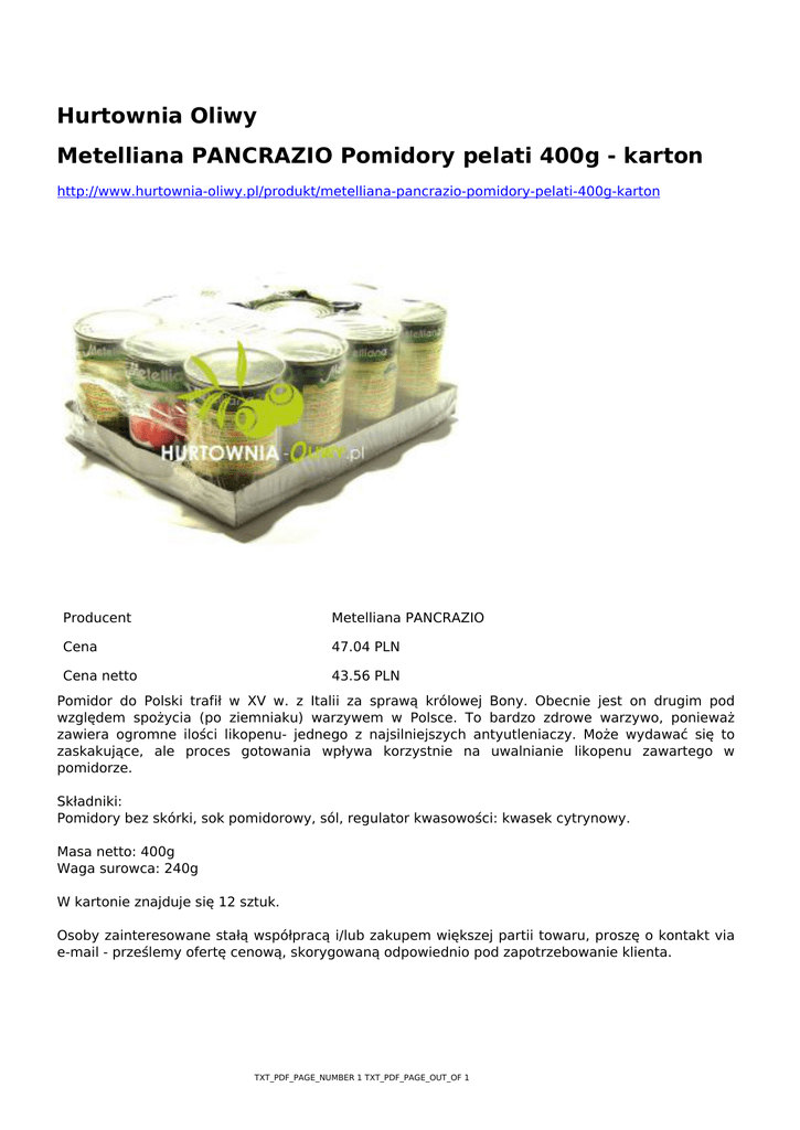 Hurtownia Oliwy Metelliana PANCRAZIO Pomidory pelati 400g - karton http://www.hurtownia-oliwy.pl/produkt/metelliana-pancrazio-pomidory-pelati-400g-karton Producent Metelliana PANCRAZIO Cena 47.04 PLN Cena netto 43.56 PLN Pomidor do Polski trafił w XV w. z Italii za sprawą królowej Bony. Obecnie jest on drugim pod względem spożycia (po ziemniaku) warzywem w Polsce. To bardzo zdrowe warzywo, ponieważ zawiera ogromne ilości likopenu- jednego z najsilniejszych antyutleniaczy. Może wydawać się to zaskakujące, ale proces gotowania wpływa korzystnie na uwalnianie likopenu zawartego w pomidorze. Składniki: Pomidory bez skórki, sok pomidorowy, sól, regulator kwasowości: kwasek cytrynowy. Masa netto: 400g Waga surowca: 240g W kartonie znajduje się 12 sztuk. Osoby zainteresowane stałą współpracą i/lub zakupem większej partii towaru, proszę o kontakt via e-mail - prześlemy ofertę cenową, skorygowaną odpowiednio pod zapotrzebowanie klienta. TXT_PDF_PAGE_NUMBER 1 TXT_PDF_PAGE_OUT_OF 1