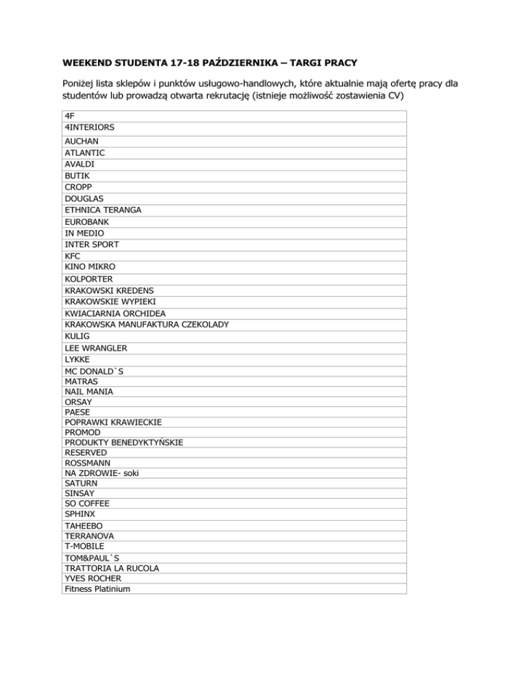 WEEKEND STUDENTA 17-18 PAŹDZIERNIKA – TARGI PRACY Poniżej lista sklepów i punktów usługowo-handlowych, które aktualnie mają ofertę pracy dla studentów lub prowadzą otwarta rekrutację (istnieje możliwość zostawienia CV) 4F 4INTERIORS AUCHAN ATLANTIC AVALDI BUTIK CROPP DOUGLAS ETHNICA TERANGA EUROBANK IN MEDIO INTER SPORT KFC KINO MIKRO KOLPORTER KRAKOWSKI KREDENS KRAKOWSKIE WYPIEKI KWIACIARNIA ORCHIDEA KRAKOWSKA MANUFAKTURA CZEKOLADY KULIG LEE WRANGLER LYKKE MC DONALD`S MATRAS NAIL MANIA ORSAY PAESE POPRAWKI KRAWIECKIE PROMOD PRODUKTY BENEDYKTYŃSKIE RESERVED ROSSMANN NA ZDROWIE- soki SATURN SINSAY SO COFFEE SPHINX TAHEEBO TERRANOVA T-MOBILE TOM&PAUL`S TRATTORIA LA RUCOLA YVES ROCHER Fitness Platinium