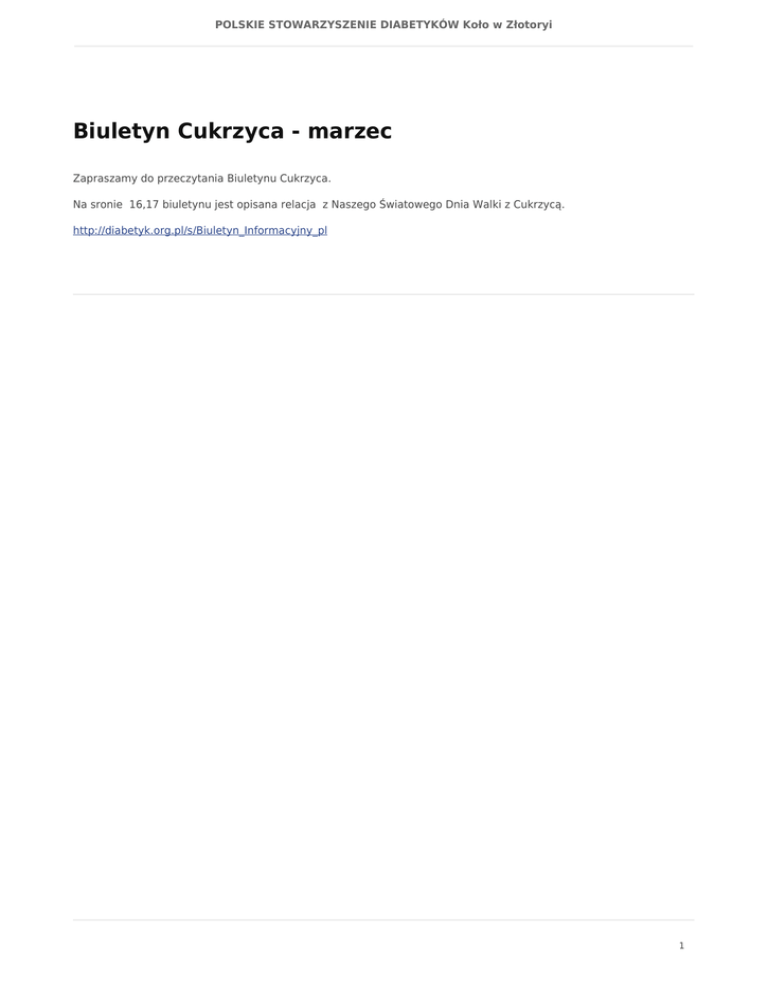 POLSKIE STOWARZYSZENIE DIABETYKÓW Koło w Złotoryi Biuletyn Cukrzyca - marzec Zapraszamy do przeczytania Biuletynu Cukrzyca. Na sronie 16,17 biuletynu jest opisana relacja z Naszego Światowego Dnia Walki z Cukrzycą. http://diabetyk.org.pl/s/Biuletyn_Informacyjny_pl 1