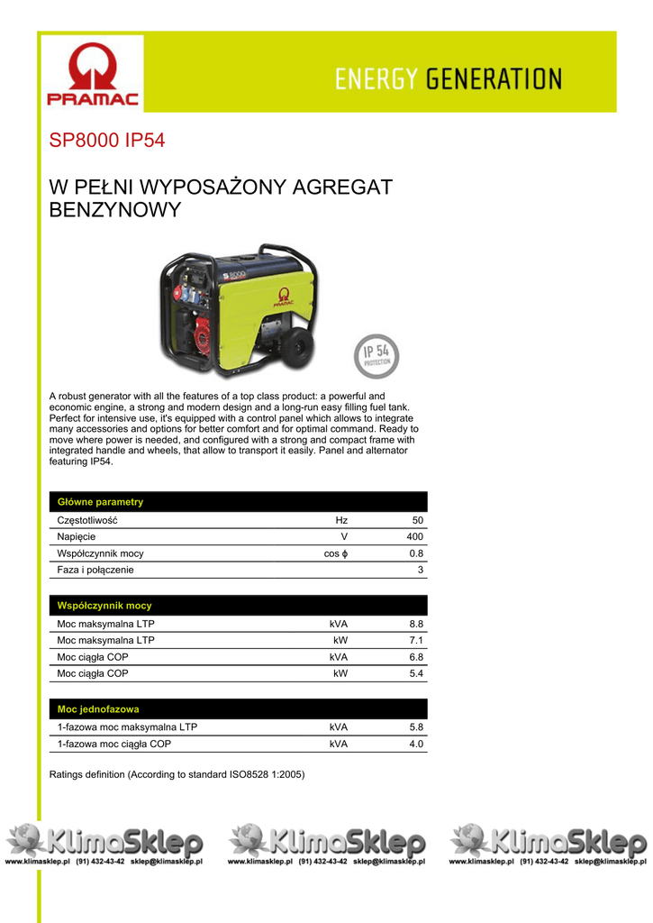 SP8000 IP54 W PEŁNI WYPOSAŻONY AGREGAT BENZYNOWY A robust generator with all the features of a top class product: a powerful and economic engine, a strong and modern design and a long-run easy filling fuel tank. Perfect for intensive use, it's equipped with a control panel which allows to integrate many accessories and options for better comfort and for optimal command. Ready to move where power is needed, and configured with a strong and compact frame with integrated handle and wheels, that allow to transport it easily. Panel and alternator featuring IP54. Główne parametry Częstotliwość Napięcie Współczynnik mocy Hz 50 V 400 cos ϕ 0.8 Faza i połączenie 3 Współczynnik mocy Moc maksymalna LTP kVA 8.8 Moc maksymalna LTP kW 7.1 Moc ciągła COP kVA 6.8 Moc ciągła COP kW 5.4 1-fazowa moc maksymalna LTP kVA 5.8 1-fazowa moc ciągła COP kVA 4.0 Moc jednofazowa Ratings definition (According to standard ISO8528 1:2005) Dane silnika Producent silnika Honda Model GX390 Recoil System chłodzenia silnika Pojemność Powietrza cm³ Zasilanie Obroty znamionowe Wolnossący rpm Regulator obrotów 3000 Mechaniczna Paliwo Pojemność układu smarowania 389 Benzyna l Rozruch 1.1 Ręczny Dane alternatora Typ Bezszczotkowy Klasa izolacji H Voltage regulation system Elektroniczny Klasa IP 54 Bieguny 2 Częstotliwość Hz 50 (L) mm 840 Szerokość (W) mm 615 Wysokość (H) mm 753 Kg 113 l 26.5 Czas pracy przy @ 75% PRP h 12.33 Czas pracy przy @ 100% PRP h 9.23 Gwarantowany poziom hałasu (LWA) dB(A) 97 Poziom ciśnienia akustycznego z 7 m dB(A) 69 Dane wymiarowe Długość Waga (suchy) Pojemność zbiornika paliwa Czas pracy Poziom hałasu Genset equipment Innowacyjna, kompaktowa konstrukcja oraz akcesoria dla profesjonalnych zastosowań Budowa: • Stalowa rama rurowa typu roll bar • Boczne metalowe osłony (zdejmowane z odpowiednimi otworami w celu łatwej obsługi) Zbiornik Paliwa: • Zwiększona pojemność zbiornika (standardowa autonomia powyżej przeciętnej) • Wskaźnik poziomu paliwa • Bagnet wlewu paliwa • Wstępny filtr paliwa • Kranik paliwa (na przednim panelu sterowania) • Filtr paliwa Silnik: • Amortyzatory drgań • Wydajny tłumik z łapaczem iskier • Czujnik niskiego poziomu oleju Transport: • Zintegrowany zestaw transportowy składający się z dwóch gumowych kół oraz antypoślizgowej rączki • 2 punkty do podnoszenia na górnej części ramy Instrukcja: • Praktyczna instrukcja użytkownika na przednim panelu (idealna dla wypożyczalni) Zabezpieczenia: • Panel i alternator z zabezpieczeniem IP54 • Czujnik izolacji (IPP) • Elektroniczny Regulator Napięcia (AVR) PANEL STEROWANIA Umiejscowiony na agregacie i wyposażony w: wskaźniki, sterowanie, zabezpieczenia STEROWANIE: - Stacyjka z kluczem: OFF-ON WSKAZANIA - Woltomierz - Licznik motogodzin - Częstotliwościomierz - Wskaźnik paliwa ZABEZPIECZENIA - Wyłącznik instalacyjny - Czujnik izolacji (IPP) - Osłona bezpieczeników - Czujnik poziomu oleju GNIAZDA SCHUKO 230V 16A IP54 2 3P+N+T CEE 400V 16A IP67 1 KLIMASKLEP ul. Orzechowa 3 72-010 Przęsocin k/Szczecina tel.: (91) 432-43-42 tel.: (91) 432-43-49 e-mail: [email protected] www: www.KlimaSklep.pl Printed on 16/07/2015 (ID 2478) ©2012 | PR INDUSTRIAL s.r.l. | All rights reserved | Image shown may not reflect actual package. Specifications subject to change without notice | ENERGY GENERATION is registered trademarks of PR INDUSTRIAL s.r.l. Other company, product or service names may be trademarks or service marks of others. RevA (06/2012).