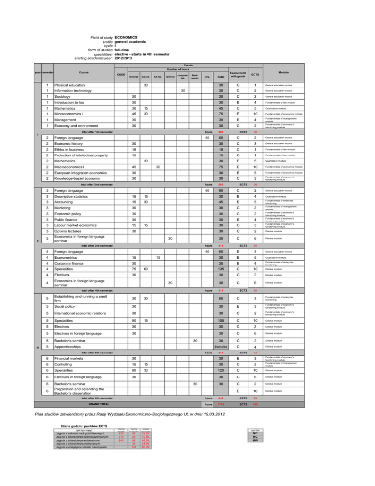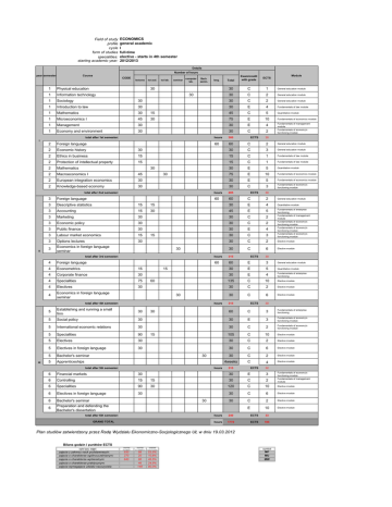Field of study profile cycle form of studies specialities: starting academic year: ECONOMICS general academic I full-time elective - starts in 4th semester 2012/2013 Details Number of hours year semester Course CODE lectures tut aud. tut lab. seminar computer lab. Bach. semin. lang. 30 Module Total Exam/credit with grade ECTS 30 C 1 General education module 30 C 2 General education module 1 Physical education 1 Information technology 1 Sociology 30 30 C 2 General education module 1 Introduction to law 30 30 E 4 Fundamentals of law module 1 Mathematics 30 15 45 C 5 Quantitative module 1 Microeconomics I 45 30 75 E 10 1 Management 30 30 E 4 1 Economy and environment 30 C 30 30 total after 1st semester: hours 300 60 2 ECTS Fundamentals of economics module Fundamentals of management module Fundamentals of economy's functioning module 30 I 2 Foreign language 60 C 2 General education module 2 Economic history 30 30 C 3 General education module 2 Ethics in business 15 15 C 1 Fundamentals of law module 2 Protection of intellectual property 15 15 C 1 Fundamentals of law module 2 Mathematics 30 E 5 Quantitative module 2 Macroeconomics I 45 75 E 10 Fundamentals of economics module 2 European integration economics 30 30 E 5 Fundamentals of economics module 2 Knowledge-based economy 30 30 C 3 Fundamentals of economy's functioning module 30 30 total after 2nd semester: II 285 60 ECTS 30 3 Foreign language 60 C 2 General education module 3 Descriptive statistics 15 15 30 E 4 Quantitative module 3 Accounting 15 30 45 E 5 3 Marketing 30 30 C 2 3 Economic policy 30 30 C 2 3 Public finance 30 30 E 4 3 Labour market economics 15 30 C 3 Fundamentals of enterprise functioning Fundamentals of management module Fundamentals of economy's functioning module Fundamentals of economy's functioning module Fundamentals of economy's functioning module 3 Options lectures Economics in foreign language seminar 30 30 C 2 Elective module 30 C 6 Elective module 3 15 30 total after 3rd semester: 4 Foreign language 4 Econometrics 15 4 Corporate finance 30 4 Specialities 75 4 Electives 30 4 Economics in foreign language seminar 5 Establishing and running a small firm 30 5 Social policy 5 hours 315 60 60 E 3 General education module 30 E 5 Quantitative module 30 E 4 Fundamentals of enterprise functioning 135 C 10 Elective module 30 C 2 Elective module 30 C 6 Elective module 15 60 30 total after 4th semester: III hours hours ECTS 315 ECTS 30 30 60 C 3 Fundamentals of enterprise functioning 30 30 E 3 Fundamentals of economy's functioning module International economic relations 30 30 C 2 Fundamentals of economy's functioning module 5 Specialities 90 105 C 10 Elective module 5 Electives 30 30 C 2 Elective module 5 Electives in foreign language 30 30 C 6 Elective module 5 Bachelor's seminar 30 C 2 Elective module 5 Apprenticeships 4weeks C 4 Elective module 30 15 30 total after 5th semester: hours 315 ECTS 32 Fundamentals of economy's functioning module Fundamentals of management module 6 Financial markets 30 30 E 3 6 Controlling 15 15 30 C 2 6 Specialities 90 30 120 C 10 Elective module 6 Electives in foreign language 30 30 C 6 Elective module 6 Bachelor's seminar Preparation and defending the Bachelor's dissertation 30 C 2 Elective module E 10 Elective module 6 30 total after 6th semester: GRAND TOTAL hours 240 ECTS 33 hours 1770 ECTS 185 Plan studiów zatwierdzony przez Radę Wydziału Ekonomiczno-Socjologicznego UŁ w dniu 19.03.2012 Bilans godzin i punktów ECTS opis typu zajęć zajęcia z zakresu nauk podstawowych: zajęcia o charakterze ogólnouczelnianym: zajęcia o charakterze wybieralnym: zajecia o charakterze praktycznym: zajęcia wymagajace udziału nauczyciela suma godzin 930 270 840 suma udział punktów procento 99 20 86 46 148 53,5% 10,8% 46,5% 24,9% 80,0% symbol MP MU MW