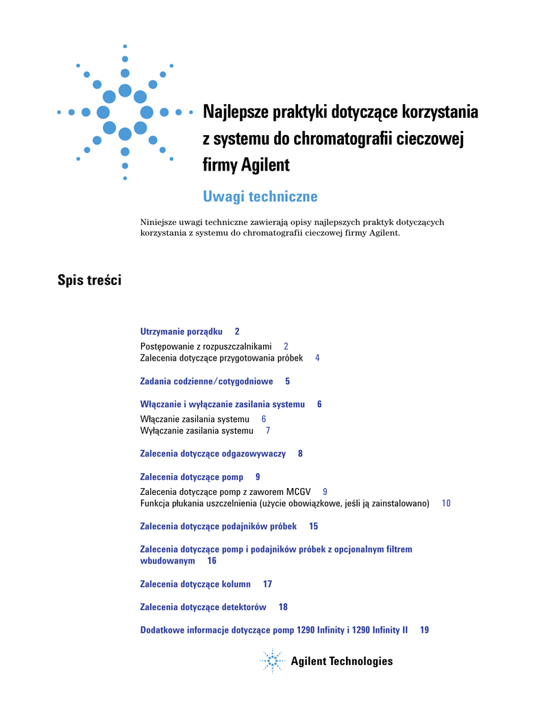 Najlepsze praktyki dotyczące korzystania z systemu do chromatografii cieczowej firmy Agilent Uwagi techniczne Najlepsze praktyki — uwagi techniczne Niniejsze uwagi techniczne zawierają opisy najlepszych praktyk dotyczących korzystania z systemu do chromatografii cieczowej firmy Agilent. Spis treści Utrzymanie porządku 2 Postępowanie z rozpuszczalnikami 2 Zalecenia dotyczące przygotowania próbek Zadania codzienne/cotygodniowe 4 5 Włączanie i wyłączanie zasilania systemu 6 Włączanie zasilania systemu 6 Wyłączanie zasilania systemu 7 Zalecenia dotyczące odgazowywaczy Zalecenia dotyczące pomp 8 9 Zalecenia dotyczące pomp z zaworem MCGV 9 Funkcja płukania uszczelnienia (użycie obowiązkowe, jeśli ją zainstalowano) Zalecenia dotyczące podajników próbek 15 Zalecenia dotyczące pomp i podajników próbek z opcjonalnym filtrem wbudowanym 16 Zalecenia dotyczące kolumn 17 Zalecenia dotyczące detektorów 18 Dodatkowe informacje dotyczące pomp 1290 Infinity i 1290 Infinity II Agilent Technologies 19 10 Utrzymanie porządku Postępowanie z rozpuszczalnikami Utrzymanie porządku Postępowanie z rozpuszczalnikami • Używać tylko czystych butelek. • Używać tylko butelek ze szkła borowo-krzemowego. • Butelkę należy opłukać odpowiednim rozpuszczalnikiem przed jej napełnieniem. • Detergenty stosowane w zmywarkach mogą pozostawiać osad na butelkach. • Rozpuszczalniki na bazie wody należy wymieniać codziennie. • Rozwój alg może doprowadzić do zablokowania odgazowywacza lub filtrów. • Precypitacja nierozpuszczalnych soli może doprowadzić do zablokowania filtrów lub kapilar. • Należy stosować rozpuszczalnik w ilości, którą można zużyć w ciągu 1–2 dni. • Używać tylko rozpuszczalników klasy HPLC i wody przefiltrowanej przez filtry 0,2 μm. • Osady lub zanieczyszczenia mogą zablokować filtry lub kapilary. • Odpowiednio oznaczyć butelki informacją o zawartości, dacie napełnienia i terminie ważności. • Należy stosować filtry wlotowe rozpuszczalnika w celu ochrony systemu przed napływającym cząsteczkami. • Należy zminimalizować ryzyko rozwoju alg: należy używać brązowych butelek w przypadku rozpuszczalników wodnych, unikać wystawiania ich na bezpośrednie działanie promieni słonecznych lub owinąć butelki folią aluminiową. PRZESTROGA Zanieczyszczony rozpuszczalnik do płukania uszczelnienia ➔ Aby uniknąć zanieczyszczenia, nie wolno ponownie używać rozpuszczalnika do płukania uszczelnienia. ➔ Rozpuszczalnik do płukania uszczelnienia należy wymieniać co tydzień. ➔ Zdecydowanie zaleca się stosowanie produktu Zestaw głowicy do butelki z płynem do płukania uszczelnienia (5067-6131). 2 Utrzymanie porządku Postępowanie z rozpuszczalnikami Dodatkowe działania w przypadku acetonitrylu (ACN) • Acetonitryl (ACN) należy filtrować przy użyciu nylonowego filtra o średnicy porów 0,45 μm. NOTATKA W przypadku wysokoczułej chromatografii cieczowej ze spektrometrią mas nie zaleca się filtrowania z zastosowaniem nylonowych filtrów. • Aby zapobiec reakcjom fotochemicznym i utlenianiu, acetonitryl należy przelać do brązowych butelek, a jego ilość należy utrzymywać na minimalnym poziomie. NOTATKA Dodać 5 – 10 % wody do acetonitrylu, szczególnie (jeśli to możliwe) w przypadku zastosowań w chromatografii cieczowej ze spektrometrią mas z obecnością 0,1 % kwasu mrówkowego. • Raz na miesiąc płukać system ciepłą wodą (60 – 70 °C (140 – 158 °F)) – 1 L, stosując prędkość przepływu wynoszącą 2 mL/min, aby rozpuścić pozostałości produktów reakcji acetonitrylu. 3 Utrzymanie porządku Zalecenia dotyczące przygotowania próbek Zalecenia dotyczące przygotowania próbek PRZESTROGA Możliwość precypitacji próbki ➔ Należy się upewnić, że próbka jest całkowicie rozpuszczalna zarówno w zastosowanym rozpuszczalniku do próbki, jak i w fazie ruchomej w warunkach startowych. ➔ Aby zapobiec precypitacji, należy dobrać rozpuszczalnik do próbki o parametrach najbardziej zbliżonych do fazy ruchomej. • Przefiltrować, odcedzić lub odwirować próbkę, aby oddzielić ją od nierozpuszczalnych substancji stałych. • Należy się upewnić, że rozpuszczalnik do próbki nie zawiera cząsteczek. 4 Zadania codzienne/cotygodniowe Zalecenia dotyczące przygotowania próbek Zadania codzienne/cotygodniowe Zadania codzienne • Wymienić rozpuszczalniki i butelki z rozpuszczalnikiem do fazy ruchomej na podstawie wody/bufora. • Wymienić rozpuszczalniki i butelki z rozpuszczalnikiem do organicznej fazy ruchomej na podstawie wody/bufora. • Sprawdzić obecność rozpuszczalnika do płukania uszczelnienia. • Oczyścić każdy kanał świeżym rozpuszczalnikiem, stosując prędkość przepływu wynoszącą 2,5 – 3 mL/min przez 5 min. • Równoważyć system przez 15 min, stosując substancję o składzie wskazanym do aktualnego zastosowania. Stosować kondycjonowanie przeznaczone do systemów 1290. Zadania cotygodniowe • Wymienić rozpuszczalnik do płukania uszczelnienia (10 % / 90 % alkohol izopropylowy/woda) i butelkę. • W przypadku zastosowań z buforem płukać wszystkie kanały wodą, stosując prędkość przepływu wynoszącą 2,5 – 3 mL/min przez 5 min, aby usunąć osady soli. • Skontrolować filtry rozpuszczalnika pod kątem zanieczyszczenia lub niedrożności. Należy je oczyścić lub wymienić w przypadku braku wypływu cieczy z przewodu rozpuszczalnika po odłączeniu od wlotu odgazowywacza. 5 Włączanie i wyłączanie zasilania systemu Włączanie zasilania systemu Włączanie i wyłączanie zasilania systemu Włączanie zasilania systemu Włączanie zasilania pompy • Użyć nowej lub innej fazy ruchomej (jeśli to konieczne). • Oczyścić każdy kanał, stosując prędkość przepływu wynoszącą 2,5 – 3 mL/min przez 5 min. Otworzyć zawór oczyszczania (1260) lub użyć polecenia Purge (Oczyszczanie) (1290). • Równo