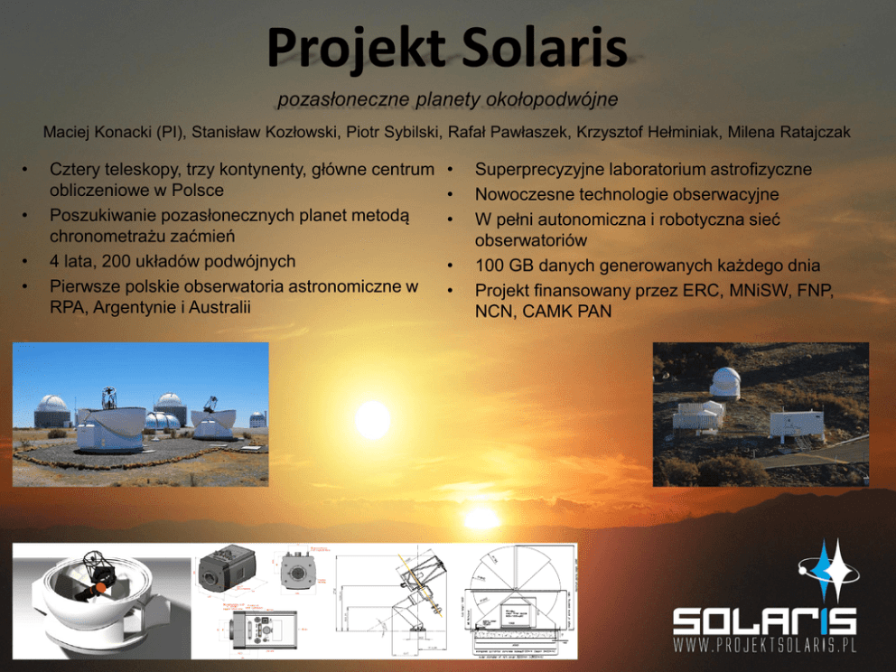 Projekt Solaris pozasłoneczne planety okołopodwójne Maciej Konacki (PI), Stanisław Kozłowski, Piotr Sybilski, Rafał Pawłaszek, Krzysztof Hełminiak, Milena Ratajczak • • • • Cztery teleskopy, trzy kontynenty, główne centrum obliczeniowe w Polsce Poszukiwanie pozasłonecznych planet metodą chronometrażu zaćmień 4 lata, 200 układów podwójnych Pierwsze polskie obserwatoria astronomiczne w RPA, Argentynie i Australii • • • • • Superprecyzyjne laboratorium astrofizyczne Nowoczesne technologie obserwacyjne W pełni autonomiczna i robotyczna sieć obserwatoriów 100 GB danych generowanych każdego dnia Projekt finansowany przez ERC, MNiSW, FNP, NCN, CAMK PAN Projekt Solaris Architektura systemu Client Features · · · · · · GUI Observation Planning Data Access Emergency Services (Connection To DbM, HwM) Remote Execution Of Data Reduction Security Management Hardware Manager Microsoft Robotics Asynchronous Drivers Devices All Sky Camera ASC Driver ASC CCD Camera Andor Driver Andor iKon-L Cloud Sensor Reinhardt Driver Reinhardt Dome Baader Dome Driver Baader Dome External CCTV Camera Mobotix Driver Mobotix Camera Flat Field Screen FlatManXL Driver FlatManXL Flat Mount FlatMount Driver Flat Mount Field Rotator Field Rotator Driver ASA Field Rotator Filter Wheel FLI Driver FLI Filter Wheel Focuser Focuser Driver ASA Focuser GPS Receiver Meinberg Driver Meinberg 170 PEX Internal CCTV Camera Mobotix Driver Mobotix Camera Internal Sensors ElUSB Driver ElUSB Power Distribution Unit APC PDU Driver APC PDU Neol PDU Driver Neol PDU Programmable Logic Controller PLC Driver CTC 5300 Storm Sensor Boltek Driver Boltek Telescope DDM 160 Driver DDM 160 Uninterruptible Power Supply APC UPS Driver APC UPS Eaton UPS Driver Eaton UPS Weather Station Vaisala Driver Vaisala Client REMOTE Hardware Manager TCP/IP Services Station Manager Database Manager A/C Weather Stations GPS Time Source Filter Wheel All Sky Camera Flat Field Screen Dome UPS System Telescope PDU System Scientific Camera Storm Sensor FlatMount … On-Station Features CCTV · · · · · · Data Handling Data Reduction Hardware Management Local Emergency Services Client Services Global Manager Services ON-STATION Global Manager Features Global Manager Small Hardware Manager TORUŃ HEADQUARTERS Station Manager · · · · Data Supervision Inter-Site Management Alert Handling Station Monitoring Big Database Manager