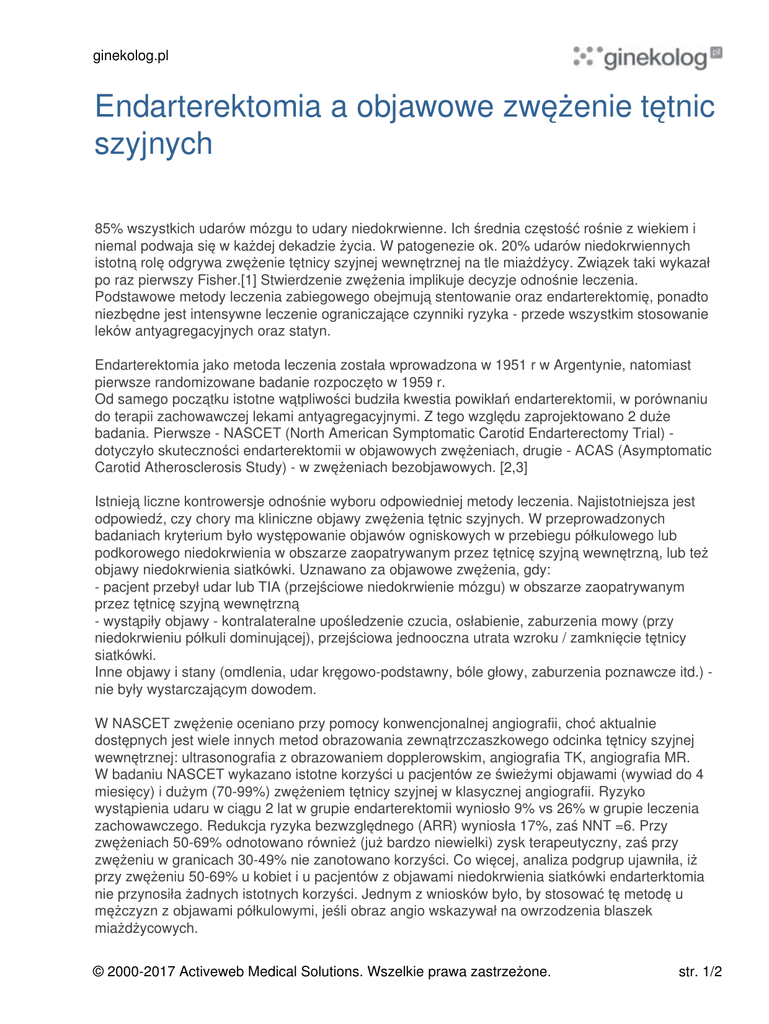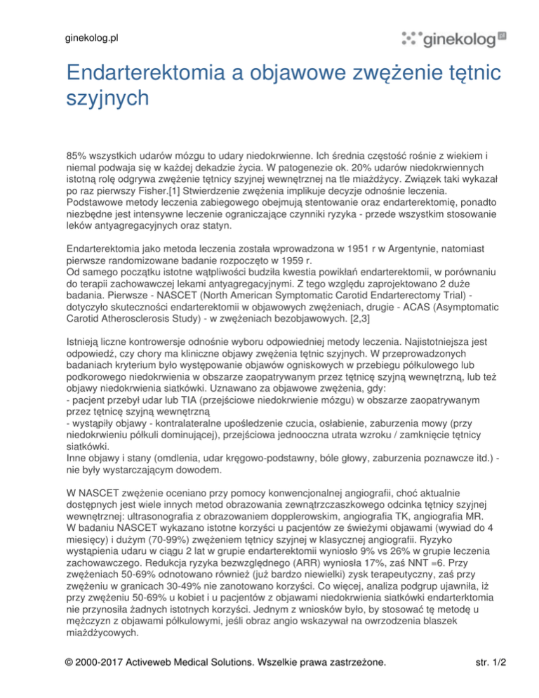 ginekolog.pl Endarterektomia a objawowe zwężenie tętnic szyjnych 85% wszystkich udarów mózgu to udary niedokrwienne. Ich średnia częstość rośnie z wiekiem i niemal podwaja się w każdej dekadzie życia. W patogenezie ok. 20% udarów niedokrwiennych istotną rolę odgrywa zwężenie tętnicy szyjnej wewnętrznej na tle miażdżycy. Związek taki wykazał po raz pierwszy Fisher.[1] Stwierdzenie zwężenia implikuje decyzje odnośnie leczenia. Podstawowe metody leczenia zabiegowego obejmują stentowanie oraz endarterektomię, ponadto niezbędne jest intensywne leczenie ograniczające czynniki ryzyka - przede wszystkim stosowanie leków antyagregacyjnych oraz statyn. Endarterektomia jako metoda leczenia została wprowadzona w 1951 r w Argentynie, natomiast pierwsze randomizowane badanie rozpoczęto w 1959 r. Od samego początku istotne wątpliwości budziła kwestia powikłań endarterektomii, w porównaniu do terapii zachowawczej lekami antyagregacyjnymi. Z tego względu zaprojektowano 2 duże badania. Pierwsze - NASCET (North American Symptomatic Carotid Endarterectomy Trial) dotyczyło skuteczności endarterektomii w objawowych zwężeniach, drugie - ACAS (Asymptomatic Carotid Atherosclerosis Study) - w zwężeniach bezobjawowych. [2,3] Istnieją liczne kontrowersje odnośnie wyboru odpowiedniej metody leczenia. Najistotniejsza jest odpowiedź, czy chory ma kliniczne objawy zwężenia tętnic szyjnych. W przeprowadzonych badaniach kryterium było występowanie objawów ogniskowych w przebiegu półkulowego lub podkorowego niedokrwienia w obszarze zaopatrywanym przez tętnicę szyjną wewnętrzną, lub też objawy niedokrwienia siatkówki. Uznawano za objawowe zwężenia, gdy: - pacjent przebył udar lub TIA (przejściowe niedokrwienie mózgu) w obszarze zaopatrywanym przez tętnicę szyjną wewnętrzną - wystąpiły objawy - kontralateralne upośledzenie czucia, osłabienie, zaburzenia mowy (przy niedokrwieniu półkuli dominującej), przejściowa jednooczna utrata wzroku / zamknięcie tętnicy siatkówki. Inne objawy i stany (omdlenia, udar kręgowo-podstawny, bóle głowy, zaburzenia poznawcze itd.) nie były wystarczającym dowodem. W NASCET zwężenie oceniano przy pomocy konwencjonalnej angiografii, choć aktualnie dostępnych jest wiele innych metod obrazowania zewnątrzczaszkowego odcinka tętnicy szyjnej wewnętrznej: ultrasonografia z obrazowaniem dopplerowskim, angiografia TK, angiografia MR. W badaniu NASCET wykazano istotne korzyści u pacjentów ze świeżymi objawami (wywiad do 4 miesięcy) i dużym (70-99%) zwężeniem tętnicy szyjnej w klasycznej angiografii. Ryzyko wystąpienia udaru w ciągu 2 lat w grupie endarterektomii wyniosło 9% vs 26% w grupie leczenia zachowawczego. Redukcja ryzyka bezwzględnego (ARR) wyniosła 17%, zaś NNT =6. Przy zwężeniach 50-69% odnotowano również (już bardzo niewielki) zysk terapeutyczny, zaś przy zwężeniu w granicach 30-49% nie zanotowano korzyści. Co więcej, analiza podgrup ujawniła, iż przy zwężeniu 50-69% u kobiet i u pacjentów z objawami niedokrwienia siatkówki endarterktomia nie przynosiła żadnych istotnych korzyści. Jednym z wniosków było, by stosować tę metodę u mężczyzn z objawami półkulowymi, jeśli obraz angio wskazywał na owrzodzenia blaszek miażdżycowych. © 2000-2017 Activeweb Medical Solutions. Wszelkie prawa zastrzeżone. str. 1/2 ginekolog.pl Dane z badań NASCET i ECST (European Carotid Surgery Trial) dostarczyły też innych ważnych wniosków. Ryzyko udarów w 2-letniej obserwacji u chorych z przejściowym niedokrwieniem siatkówki w porównaniu do grupy z niedokrwieniem półkulowym było mniejsze przy leczeniu zachowawczym (17% vs 44%). Stwierdzenia owrzodzenia blaszek miażdżycowych w obrazie angio zwiększało zaś ryzyko udaru przy leczeniu zachowawczym prawie 2-krotnie.[5] Istotne również było stwierdzenie, czy pierwotny epizod był lakunarny (podkorowy udar, ognisko śr. do 1,5cm, w torebce wewnętrznej, wzgórzu lub moście), gdyż większe korzyści z endarterketomii odnosili pacjenci po udarach nielakunarnych (RRR 35% vs 61%).[6] Autorzy NASCET stwierdzili, że większe korzyści z endarterektomii widoczne są po 75 r.ż., ale trzeba zauważyć, że do badania nie właczano pacjentów ze schorzeniami sercowo-naczyniowymi tj. świeże niedokrwienie mięśnia sercowego, zastoinowa niewydolność serca, czy migotanie przedsionków. Panuje opinia, by do leczenia metodą endarterektomii kwalifikować osoby, u których spodziewana długość dalszego życia wynosi minimum 5 lat. Istotnym czynnikiem okazało się także krążenie oboczne - gdy było dobrze rozwinięte ryzyko półkulowego udaru w okresie 2 lat wynosiło ok. 11% vs 28% przy słabym. Jak widać stopień komplikacji danych z badania NASCET (a także z innych jak ECST, oraz z analiz post-hoc) jest bardzo duży. Można pokusić się o stwierdzenie, iż czynnikami przemawiającymi za zakwalifikowaniem pacjenta do endarterektomii są: wiek >70 rż., objawy półkulowe, płeć męska, owrzodziałe blaszki miażdżycowe w ocenie angio, słabe krążenie oboczne, oraz nielakunarny udar mózgu. © 2000-2017 Activeweb Medical Solutions. Wszelkie prawa zastrzeżone. str. 2/2