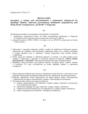 1 Sygnatura akt V GUp 3/13 REGULAMIN sprzedaży z wolnej reki nieruchomości i ruchomości należących do upadłego Elżbiety Jędrczak prowadzącej działalność gospodarczą pod firmą Firma Transportowa „ELDAR” w Pajęcznie. §1 Przedmiotem sprzedaży są następujące nieruchomości i ruchomości: 1. spółdzielcze własnościowe prawo do lokalu mieszkalnego położonego w Pajęcznie ul. Osiedlowa 4A/8, którego wartość oszacowano na kwotę 31.400,-zł, 2. samochód osobowy OPEL ASTRA 1,6 sedan o nr rej. EPJU338 oszacowany na kwotę 3.100,-zł brutto. §2 1. Ogłoszenie o sprzedaży dokonuje syndyk i podaje do publicznej wiadomości poprzez zaproszenie do składania ofert pisemnych. Ogłoszenie ukaże się w jednym dzienniku o zasięgu lokalnym oraz w internecie. Termin rozpoznania ofert zostanie podany w ogłoszeniu. 2. Oferty mogą być składane w zaklejonej kopercie w terminie i na adres podany przez syndyka w ogłoszeniu o sprzedaży z czytelnym napisem na kopercie: „Oferta zakupu nieruchomości / ruchomości” (decyduje data doręczenia oferty na podany adres). 3. Składający ofertę powinien, pod rygorem odmowy przyjęcia oferty, wpłacić wadium w wysokości 5% ceny wywoławczej na konto upadłego podane w ogłoszeniu o konkursie. §3 1. Oferty mogą być składane przez krajowe i zagraniczne osoby fizyczne i osoby prawne oraz jednostki organizacyjne posiadające zdolność prawną i zdolność do czynności prawnych. 2. Podmioty zagraniczne winny legitymować się zgodą Ministra Spraw Wewnętrznych i Administracji na nabycie nieruchomości, zgodnie z obowiązującymi przepisami. 3. W konkursie jako oferenci nie mogą uczestniczyć: a) syndyk, sędzia-komisarz, ich małżonek, wstępni, zstępni, rodzeństwo, powinowaty w tej samej linii lub stopniu; b) reprezentant upadłego oraz jego małżonek, wstępni, zstępni, rodzeństwo; c) członkowie komisji konkursowej, ich małżonkowie, wstępni, zstępni, rodzeństwo; d) osoby występujące przy konkursie w charakterze urzędowym. §4 2 Pisemne oferty powinny zawierać: 1. firmę i siedzibę (osoby fizyczne – imię, nazwisko i adres zamieszkania) oferenta, 2. proponowaną cenę, sposób i termin jej uiszczenia, 3. dowód wpłaty wadium w wysokości 5 % ceny wywoławczej na konto upadłego podane w ogłoszeniu, 4. oświadczenie o zapoznaniu się z regulaminem i przyjęciu go bez zastrzeżeń, 5. oświadczenie o zapoznaniu się ze stanem prawnym i technicznym nieruchomości, 6. oryginalny, czytelny podpis składającego ofertę, 7. dokumenty potwierdzające posiadanie środków finansowych umożliwiających zapłatę proponowanej ceny, 8. w przypadku oferentów nie będących osobami fizycznymi aktualny wypis z właściwego rejestru dokumentujący prawo do składania wiążących oświadczeń woli w imieniu danego podmiotu, prze osobę, która podpisała ofertę, a jeżeli ofertę podpisuje pełnomocnik, to również pełnomocnictwo podpisane zgodnie z zasadą reprezentacji. 9. Osoby zagraniczne (w rozumieniu ustawy o nabywaniu nieruchomości przez cudzoziemców) obowiązane są dostarczyć zezwolenie lub promesę właściwego organu na zakup nieruchomości, §5 Oferty, które nie spełniają warunków określonych w paragrafie poprzedzającym lub które wpłynęły po dniu przyjmowania ofert określonym w ogłoszeniu nie będą rozpatrywane. §6 1. Pełnomocnictwo do złożenia oferty oraz do złożenia oświadczeń wymaganych niniejszym regulaminem powinno być stwierdzone dokumentem z podpisem notarialnie poświadczonym. 2. Pełnomocnictwa udzielone adwokatom lub radcom prawnym nie wymagają poświadczenia. §7 Ogłoszenie o konkursie ofert powinno zawierać: 1. informację o nieruchomości będącej przedmiotem sprzedaży, jej położeniu i urządzonej dla niej księdze wieczystej, informacje o ruchomościach przeznaczonych do sprzedaży, 2. zaproszenie do składania ofert, 3. termin, sposób i miejsce składania ofert, 4. cenę wywoławczą, wysokość wadium oraz termin i sposób jego wniesienia, 5. termin i miejsce przeprowadzenia otwarcia i rozpoznania, 6. informację o miejscu wyłożenia do wglądu regulaminu sprzedaży, 7. wskazówki o możliwości uzyskania informacji na temat nieruchomości i ruchomości, 8. wskazanie terminu w jakim można oglądać nieruchomość, po wcześniejszym uzgodnieniu z syndykiem, 9. pouczenie o skutkach uchylenia się od zawarcia umowy, 10. zastrzeżenie, że syndykowi przysługuje prawo odstąpienia lub unieważnienia konkursu bez podania przyczyny. §8 3 1. Wadium wpłacone przez uczestnika, którego oferta została wybrana zalicza się na poczet ceny sprzedaży. 2. Wadium wpłacone przez pozostałych uczestników podlega zwrotowi w terminie 10 dni od dnia otwarcia i rozpoznania ofert. 3. Wadium przepada na rzecz masy upadłości w razie uchylenia się, bądź odstąpienia uczestnika, którego oferta została wybrana, od zawarcia umowy sprzedaży w formie aktu notarialnego, w terminie wyznaczonym przez syndyka. §9 1. Konkurs przeprowadza syndyk. 2. Syndyk może powołać komisję konkursową, której przysługują wyłącznie uprawnienia doradcze i opiniujące. 3. W skład komisji konkursowej wchodzą osoby wskazane w stosownym zarządzeniu syndyka masy upadłości o powołaniu komisji konkursowej, w szczególności reprezentant upadłego (jeżeli wyrazi zgodę), główny księgowy. § 10 1. Syndyk dokonuje jawnego otwarcia ofert przy udziale komisji konkursowej, jeżeli zostanie powołana, w dniu określonym w ogłoszeniu i wybiera najkorzystniejszą z nich bądź ustala, że konkurs został zamknięty bez wyboru którejkolwiek z ofert. 2. Rozpatrywane będą tylko te oferty, które wpłynęły na ręce syndyka najpóźniej w ostatnim dniu składania ofert. 3. Z otwarcia ofert należy sporządzić protokół, podając w nim rozstrzygnięcie konkursu. Protokół podpisują obecni. 4. Syndyk powiadamia pisemnie, niezwłocznie oferenta, którego oferta została wybrana. §