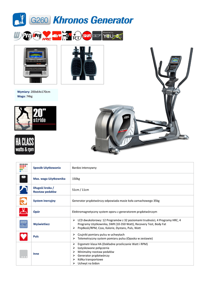 Wymiary: 200x64x170cm Waga: 74kg Sposób Użytkowania Bardzo intensywny Max. waga Użytkownika 150kg Długość kroku / Rozstaw pedałów 51cm / 11cm System inercyjny Generator prądotwórczy odpowiada masie koła zamachowego 35kg Opór Elektromagnetyczny system oporu z generatorem prądotwórczym Wyświetlacz  LCD dwukolorowy: 12 Programów z 32 poziomami trudności, 4 Programy HRC, 4 Programy Użytkownika, SWR (10‐350 Watt), Recovery Test, Body Fat  Prędkość/RPM, Czas, Kalorie, Dystans, Puls, Watt Puls  Czujniki pomiaru pulsu w uchwytach  Telemetryczny system pomiaru pulsu (Opaska w zestawie) Inne       Ergometr klasa HA (Dokładne przeliczanie Watt i RPM) Łożyskowane połączenia Minimalny rozstaw pedałów Generator prądotwórczy Kółka transportowe Uchwyt na bidon