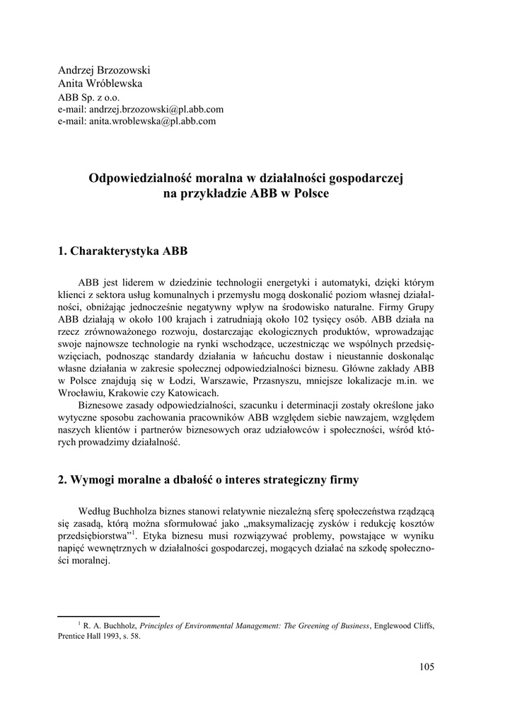 Andrzej Brzozowski Anita Wróblewska ABB Sp. z o.o. e-mail: [email protected] e-mail: [email protected] Odpowiedzialność moralna w działalności gospodarczej na przykładzie ABB w Polsce 1. Charakterystyka ABB ABB jest liderem w dziedzinie technologii energetyki i automatyki, dzięki którym klienci z sektora usług komunalnych i przemysłu mogą doskonalić poziom własnej działalności, obniżając jednocześnie negatywny wpływ na środowisko naturalne. Firmy Grupy ABB działają w około 100 krajach i zatrudniają około 102 tysięcy osób. ABB działa na rzecz zrównoważonego rozwoju, dostarczając ekologicznych produktów, wprowadzając swoje najnowsze technologie na rynki wschodzące, uczestnicząc we wspólnych przedsięwzięciach, podnosząc standardy działania w łańcuchu dostaw i nieustannie doskonaląc własne działania w zakresie społecznej odpowiedzialności biznesu. Główne zakłady ABB w Polsce znajdują się w Łodzi, Warszawie, Przasnyszu, mniejsze lokalizacje m.in. we Wrocławiu, Krakowie czy Katowicach. Biznesowe zasady odpowiedzialności, szacunku i determinacji zostały określone jako wytyczne sposobu zachowania pracowników ABB względem siebie nawzajem, względem naszych klientów i partnerów biznesowych oraz udziałowców i społeczności, wśród których prowadzimy działalność. 2. Wymogi moralne a dbałość o interes strategiczny firmy Według Buchholza biznes stanowi relatywnie niezależną sferę społeczeństwa rządzącą się zasadą, którą można sformułować jako „maksymalizację zysków i redukcję kosztów przedsiębiorstwa”1. Etyka biznesu musi rozwiązywać problemy, powstające w wyniku napięć wewnętrznych w działalności gospodarczej, mogących działać na szkodę społeczności moralnej. 1 R. A. Buchholz, Principles of Environmental Management: The Greening of Business, Englewood Cliffs, Prentice Hall 1993, s. 58. 105 W działalności gospodarczej ci uczestnicy procesu, którzy systematycznie dążą do osiągnięcia zysku, stosując jednocześnie metody przynoszące szkodę ich partnerom w tej wymianie, muszą liczyć się w konsekwencji z brakiem woli współpracy2. Opcja strategiczna, czy też inaczej mówiąc zasada ekonomicznej efektywności często przeważa nad stanowiskiem opartym na systemie wartości. Jeden z powodów wyboru tej opcji wiąże się z koniecznością zapewnienia nieprzerwanej działalności danej jednostki organizacyjnej. Jednak tak pojęty interes strategiczny może być także akceptowalny, jeśli nie jest całkowicie oderwany od argumentów moralnych i ta linia postępowania może przynieść dla organizacji korzystne konsekwencje. W biznesie potrzebny jest moralny fundament zaufania. Zasadniczym celem etyki biznesu jest, więc wyszukiwanie rozwiązań pośrednich, ale jednocześnie optymalnych pod względem możliwości godzenia wymogów moralnych z dbałością o interes strategiczny firmy. Aby osiągnąć ten zasadniczy cel w działalności gospodarczej realizowane muszą być dwa składowe cele etyki3. Pierwszy cel polega na ocenie praktyk ludzkich w powiązaniu, czy raczej odwołaniu się do standardów moralnych. Implikuje on potrzebę analizy i oceny wydarzeń, relacji, zaistniałych sytuacji (odniesienie do przeszłości). Opinia i ocena daje możliwość zobrazowania kwestii moralnych, stojących u podstaw określonych rozwiązań. Często możliwe rozwiązania mają cechy zarówno pozytywne jak i negatywne, co skutkuje pojawieniem się dylematu moralnego. Drugim celem jest, więc rozstrzygnięcie obecnych i przyszłych dylematów i wybór właściwej linii postępowania. Cel ten może być osiągnięty dzięki rzetelnej i konkretnej informacji, co do właściwych standardów moralnych. ABB jako przedsiębiorstwo zajmujące się produkcją wyrobów i świadczeniem usług wysokiej jakości, przyjmuje na siebie określoną odpowiedzialność moralną a etyka biznesu traktowana jest jako jeden z głównych procesów organizacji (schemat 1). 2 R. Jeurissen, Business in Response to the Morally Concerned Public, [w:] H. van Luijk, P. Ulrich, Fading Public Interest: Ethical Challenge on Business Policy and Corporate Communications, Kluwer Academic Publisher, Dordrecht 1995, s. 11. 3 P. Partley, Etyka w biznesie, Gebethner & Spółka, Warszawa 1998, s. 12. 106 S c h e m a t 1. Proces Etyki Biznesu4 RADA ETYKI BIZNESU ABB STANDARDY GRUPY SZKOLENIA PRACOWNICY – DEKLARACJA ETYKI – OŚWIADCZENIE „KONFLIKT INTERESÓW” ANALIZA I OCENA SZKOLENIA TELEFON ZAUFANIA ABB SANKCJE UCZCIWOŚĆ WEWNĄTRZ FIRMY ORAZ W RELACJACH Z KLIENTAMI I PARTNERAMI BIZNESOWYMI TROSKA O ŚRODOWISKO NATURALNE TROSKA O ZAGWARANTOWANIE ODPOWIEDNICH WARUNKÓW PRACY Idea zrównoważonego rozwoju – zasady polityki społecznej ABB. Moralne i społeczne podejście do biznesu należy połączyć ze strategicznymi instrumentami prawa i popytu konsumenckiego. W całej Grupie ABB działania strategiczne kierowane są na działalność społeczną poprzez wdrażanie idei zrównoważonego rozwoju. 4 Proces etyki biznesu opisany jest w dalszej części artykułu. 107 Pojęcie zrównoważonego rozwoju jest rozumiane w ABB zgodnie z jego klasyczną definicją Światowej Komisji Środowiska i Rozwoju przy Organizacji Narodów Zjednoczonych (1987): Ludzkość jest w stanie rozwijać się w sposób zrównoważony – tak, aby spełniać potrzeby dnia dzisiejszego bez uchybiania prawu przyszłych pokoleń do spełniania swych potrzeb. Idea zrównoważonego rozwoju jest ważną wartością cenioną przez akcjonariuszy ABB oraz jest kryterium akceptacji społecznej działań całej Grupy ABB dąży do zwiększenia zysków swych akcjonariuszy, zapewniając realizację strategicznych interesów, jednocześnie jednak kontynuuje programy przydatne dla społeczności lokalnych. Na schemacie 2 przedstawiono model zrównoważonego rozwoju w firmie ABB. Opiera się on na potrójnej linii przewodniej (a triple bottom line), według której fir