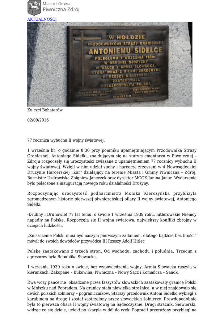 AKTUALNOŚCI Ku czci Bohaterów 02/09/2016 77 rocznica wybuchu II wojny światowej. 1 września br. o godzinie 8:30 przy pomniku upamiętniającym Przodownika Straży Granicznej, Antoniego Sidełki, znajdującym się na starym cmentarzu w Piwnicznej – Zdroju rozpoczęły się uroczystości związane z upamiętnieniem 77 rocznicy wybuchu II wojny światowej. Wzięli w nim udział zuchy i harcerze zrzeszeni w 4 Nowosądeckiej Drużynie Harcerskiej „Żar” działający na terenie Miasta i Gminy Piwniczna – Zdrój, Burmistrz Uzdrowiska Zbigniew Janeczek oraz dyrektor MGOK Janina Janur. Wydarzenie było połączone z inauguracją nowego roku działalności Drużyny. Rozpoczynając uroczystość podharcmistrz Monika Kierczyńska przybliżyła zgromadzonym historię pierwszej piwniczańskiej ofiary II wojny światowej, Antoniego Sidełki. -Druhny i Druhowie! 77 lat temu, o świcie 1 września 1939 roku, hitlerowskie Niemcy napadły na Polskę. Rozpoczęła się II wojna światowa, największy konflikt zbrojny w dziejach ludzkości. „Zniszczenie Polski musi być naszym pierwszym zadaniem, dlatego bądźcie bez litości” mówił do swoich dowódców przywódca III Rzeszy Adolf Hitler. Polskę zaatakowano z trzech stron. Od wschodu, zachodu i południa. Trzecim z agresorów była Republika Słowacka. 1 września 1939 roku o świcie, bez wypowiedzenia wojny, Armia Słowacka ruszyła w kierunkach: Zakopane – Bukowina, Piwniczna – Nowy Sącz i Komańcza – Sanok. Dwa wozy pancerne obsadzone przez faszystów słowackich zaatakowały granicę Polski w Mniszku nad Popradem. Na granicy stała niewielka strażnica, a w niej znajdowało się dwóch polskich żołnierzy – pograniczników. Starszy przodownik Antoni Sidełko wybiegł z karabinem na drogę i został zastrzelony przez słowackich żołnierzy. Prawdopodobnie była to pierwsza ofiara II wojny światowej na Sądecczyźnie. Drugi strażnik, Siewierski, widząc co się dzieje, uciekł po skarpie w dół do rzeki Poprad i przerażony przybiegł na dworzec kolejowy w Piwnicznej, gdzie zgromadzonym mężczyznom opowiedział o incydencie na granicy. Jeden z wozów pancernych staranował szlaban, lecz po chwili został ostrzelany z działka przeciwpancernego, które ustawiono 30 sierpnia na polanie, na Podoliku. Po uszkodzony pojazd od strony słowackiej przyjechał drugi samochód, wziął go na hol, a zabitego strażnika Słowacy przywiązali liną do auta i wlekli zwłoki po drodze do Mniszka. Tam zostawili ciało i odjechali. Mieszkańcy Mniszka przekazali ciało księdzu, który po wpisaniu nazwiska do księgi zgonów, polecił pochować zabitego Polaka na starym cmentarzu na górce. Dzięki obowiązkowości, odpowiedzialności, odwadze i ofiarności Antoniego Sidełki i setek tysięcy podobnych do niego młodych Polaków, którzy w chwili próby stanęli bez wahania w obronie Ojczyzny, mogliśmy dzisiaj ubrać mundury z biało-czerwoną flagą na piersi i szczęśliwie rozpocząć nowy rok harcerski. Życzę wszystkim zuchom, harcerzom i instruktorom sukcesów i wytrwałości w realizacji swoich planów. Postarajcie się być obowiązkowi, odpowiedzialni, odważni i ofiarni jak nasz bohater Antoni Sidełko. Burmistrz Zbigniew Janeczek podkreślił, że cześć oddawana bohaterom wpływa pozytywnie na kształtowanie wśród młodych ludzi właściwych wzorców zachowania. -Współcześnie wpajanie idei patriotyzmu nie polega na przelewaniu krwi za Polskę. Należy jednak na każdym kroku podkreślać, że dzięki ofierze ludzi takich, jak Antoni Sidełko możemy dziś mówić po polsku i nie wstydzić się przynależności do naszej Ojczyzny. Należy stale przypominać ludziom, że historia składa się nie tylko z wielkich postaci, ale również z osób, które przez wiele lat były skazane na zapomnienie. Powinniśmy więc czcić pamięć o ludziach takich, jak Antoni Sidełko i nie możemy skazywać ich na zapomnienie – powiedział Burmistrz. Po złożeniu kwiatów i zapaleniu zniczy przed pomnikiem Przodownika Straży Granicznej uczestnicy uroczystości udali się przed pomnik ofiar II wojny światowej stojący przed piwniczańskim ratuszem, gdzie oddano cześć wszystkim pomordowanym w czasie trwania wojny.