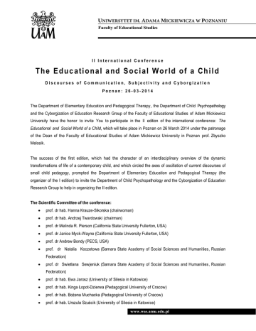 Faculty of Educational Studies II International Conference The E duc a ti onal a nd S oc i al Worl d of a Chi l d Discourses of Communication, Subjectivity and Cyborgization Poznan: 26-03-2014 The Department of Elementary Education and Pedagogical Therapy, the Department of Child Psychopathology and the Cyborgization of Education Research Group of the Faculty of Educational Studies of Adam Mickiewicz University have the honor to invite You to participate in the II edition of the international conference: The Educational and Social World of a Child, which will take place in Poznan on 26 March 2014 under the patronage of the Dean of the Faculty of Educational Studies of Adam Mickiewicz University in Poznan prof. Zbyszko Melosik. The success of the first edition, which had the character of an interdisciplinary overview of the dynamic transformations of life of a contemporary child, and which circled the axes of oscillation of current discourses of small child pedagogy, prompted the Department of Elementary Education and Pedagogical Therapy (the organizer of the I edition) to invite the Department of Child Psychopathology and the Cyborgization of Education Research Group to help in organizing the II edition. The Scientific Committee of the conference: prof. dr hab. Hanna Krauze-Sikorska (chairwoman) prof. dr hab. Andrzej Twardowski (chairman) prof. dr Melinda R. Pierson (California State University Fullerton, USA) prof. dr Janice Myck-Wayne (California State University Fullerton, USA) prof. dr Andrew Bondy (PECS, USA) prof. dr Natalia Koczetowa (Samara State Academy of Social Sciences and Humanities, Russian Federation) prof. dr Swietlana Sewjeniuk (Samara State Academy of Social Sciences and Humanities, Russian Federation) prof. dr hab. Ewa Jarosz (University of Silesia in Katowice) prof. dr hab. Kinga Łopot-Dzierwa (Pedagogical University of Cracow) prof. dr hab. Bożena Muchacka (Pedagogical University of Cracow) prof. dr hab. Urszula Szuścik (University of Silesia in Katowice) www.wse.amu.edu.pl Faculty of Educational Studies prof. dr hab. Anna Brzezińska (AMU Institute of Psychology) prof. dr hab. Katarzyna Dziubalska-Kołaczyk (AMU Faculty of English) prof. dr hab. Iwona Chrzanowska (AMU Faculty of Educational Studies) prof. dr hab. Agnieszka Gromkowska-Melosik (AMU Faculty of Educational Studies) prof. dr hab. Beata Jachimczak (AMU Faculty of Educational Studies) prof. dr hab. Kinga Kuszak (AMU Faculty of Educational Studies) prof. dr hab. Dorota Żołądź-Strzelczyk (AMU Faculty of Educational Studies) dr hab. Anna Jakoniuk-Diallo (AMU Faculty of Educational Studies) dr hab. Jacek Pyżalski (AMU Faculty of Educational Studies) We propose the following thematic areas: Child – Language – Communication (coordinators: prof. dr hab. Kinga Kuszak, dr Grażyna Rura) Child – Family – Peers (coordinators: prof. dr hab. Andrzej Twardowski, mgr Paulina Gołaska) Child – Surroundings – Institution (coordinators: dr Maria P. Stasiakiewicz, dr Hanna Kubiak) Child – Adult – Culture (coordinators: prof. dr hab. Hanna Krauze-Sikorska, dr Katarzyna Sadowska) Child – Technology – Cyborgization (coordinators: dr Michał Klichowski, dr Mariusz Przybyła) Application for participation in the conference: The application deadline is: 30 January 2014. Please send your application form (attachment no. I) to the following e-mail address: [email protected]. www.wse.amu.edu.pl Faculty of Educational Studies Publication: Statements in the form of scientific articles will be – after receiving positive reviews – published in English as a collective work released by Adam Mickiewicz University Press: The Educational and Social World of a Child: Discourses of Communication, Subjectivity and Cyborgization. Articles should be sent to the following e-mail address: [email protected], the deadline being: 20 March 2014 r. (editorial instructions in attachment no. II). The Organizing Committee prof. UAM dr hab. Hanna Krauze-Sikorska (chairwoman) prof. UAM dr hab. Andrzej Twardowski (chairman) dr Michał Klichowski (secretary) mgr Paulina Gołaska (secretary) dr Mateusz Marciniak www.wse.amu.edu.pl Faculty of Educational Studies Attachment no. I Application form Name Academic degree Name and address of university Address, phone number, email Title of paper Abstract (max 300 characters) www.wse.amu.edu.pl Faculty of Educational Studies Attachment no. II Guide for Authors Text should be written in a text editor Word with full footnotes (do not use: ibid, etc.). Please do not make the division of words, not flip single, ending line letters to a new line. Please use text font: Times New Roman, size 12, 1.5 line spacing, alignment to the left. Please do not use bold. All drawings and graphs must be done independently (there is no possibility of reprints from other publications). Article must have abstract and key words (minimum 3, maximum 5). A model of footnotes BOOK: D. A. Kolb, Experiential Learning, Prentice Hall, Englewood Cliffs, New York 1984, p. 16. CHAPTER IN EDITED BOOK: P. Bourdieu, The forms of Capital, [in:] Handbook of Theory and Research for the Sociology of Education, ed. J. G. Richardson, Greenwood, New York 1985, p. 248. JOURNAL ARTICLE: S. Freeman, Capitalism in The Classical and High Liberal Traditions, „Social Philosophy & Policy” 2011, Vol. 2, p. 22. ARTICLE ONLINE: J. A. Chmurzyński, Henri Piéron, http://www.nencki.gov.pl/ptetol/biogramy/pieron.htm, [access: 10.03.2011]. www.wse.amu.edu.pl