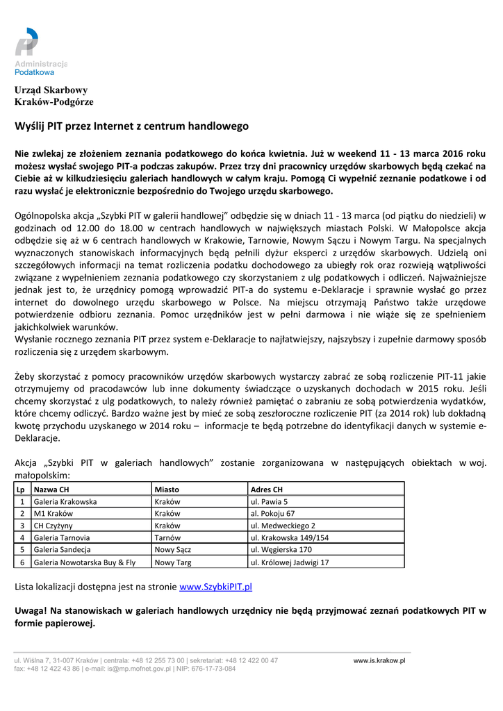 Urząd Skarbowy Kraków-Podgórze Wyślij PIT przez Internet z centrum handlowego Nie zwlekaj ze złożeniem zeznania podatkowego do końca kwietnia. Już w weekend 11 - 13 marca 2016 roku możesz wysłać swojego PIT-a podczas zakupów. Przez trzy dni pracownicy urzędów skarbowych będą czekać na Ciebie aż w kilkudziesięciu galeriach handlowych w całym kraju. Pomogą Ci wypełnić zeznanie podatkowe i od razu wysłać je elektronicznie bezpośrednio do Twojego urzędu skarbowego. Ogólnopolska akcja „Szybki PIT w galerii handlowej” odbędzie się w dniach 11 - 13 marca (od piątku do niedzieli) w godzinach od 12.00 do 18.00 w centrach handlowych w największych miastach Polski. W Małopolsce akcja odbędzie się aż w 6 centrach handlowych w Krakowie, Tarnowie, Nowym Sączu i Nowym Targu. Na specjalnych wyznaczonych stanowiskach informacyjnych będą pełnili dyżur eksperci z urzędów skarbowych. Udzielą oni szczegółowych informacji na temat rozliczenia podatku dochodowego za ubiegły rok oraz rozwieją wątpliwości związane z wypełnieniem zeznania podatkowego czy skorzystaniem z ulg podatkowych i odliczeń. Najważniejsze jednak jest to, że urzędnicy pomogą wprowadzić PIT-a do systemu e-Deklaracje i sprawnie wysłać go przez internet do dowolnego urzędu skarbowego w Polsce. Na miejscu otrzymają Państwo także urzędowe potwierdzenie odbioru zeznania. Pomoc urzędników jest w pełni darmowa i nie wiąże się ze spełnieniem jakichkolwiek warunków. Wysłanie rocznego zeznania PIT przez system e-Deklaracje to najłatwiejszy, najszybszy i zupełnie darmowy sposób rozliczenia się z urzędem skarbowym. Żeby skorzystać z pomocy pracowników urzędów skarbowych wystarczy zabrać ze sobą rozliczenie PIT-11 jakie otrzymujemy od pracodawców lub inne dokumenty świadczące o uzyskanych dochodach w 2015 roku. Jeśli chcemy skorzystać z ulg podatkowych, to należy również pamiętać o zabraniu ze sobą potwierdzenia wydatków, które chcemy odliczyć. Bardzo ważne jest by mieć ze sobą zeszłoroczne rozliczenie PIT (za 2014 rok) lub dokładną kwotę przychodu uzyskanego w 2014 roku – informacje te będą potrzebne do identyfikacji danych w systemie eDeklaracje. Akcja „Szybki PIT w galeriach handlowych” zostanie zorganizowana w następujących obiektach w woj. małopolskim: Lp 1 2 3 4 5 6 Nazwa CH Galeria Krakowska M1 Kraków CH Czyżyny Galeria Tarnovia Galeria Sandecja Galeria Nowotarska Buy & Fly Miasto Kraków Kraków Kraków Tarnów Nowy Sącz Nowy Targ Adres CH ul. Pawia 5 al. Pokoju 67 ul. Medweckiego 2 ul. Krakowska 149/154 ul. Węgierska 170 ul. Królowej Jadwigi 17 Lista lokalizacji dostępna jest na stronie www.SzybkiPIT.pl Uwaga! Na stanowiskach w galeriach handlowych urzędnicy nie będą przyjmować zeznań podatkowych PIT w formie papierowej. ul. Wiślna 7, 31-007 Kraków | centrala: +48 12 255 73 00 | sekretariat: +48 12 422 00 47 fax: +48 12 422 43 86 | e-mail: [email protected] | NIP: 676-17-73-084 www.is.krakow.pl
