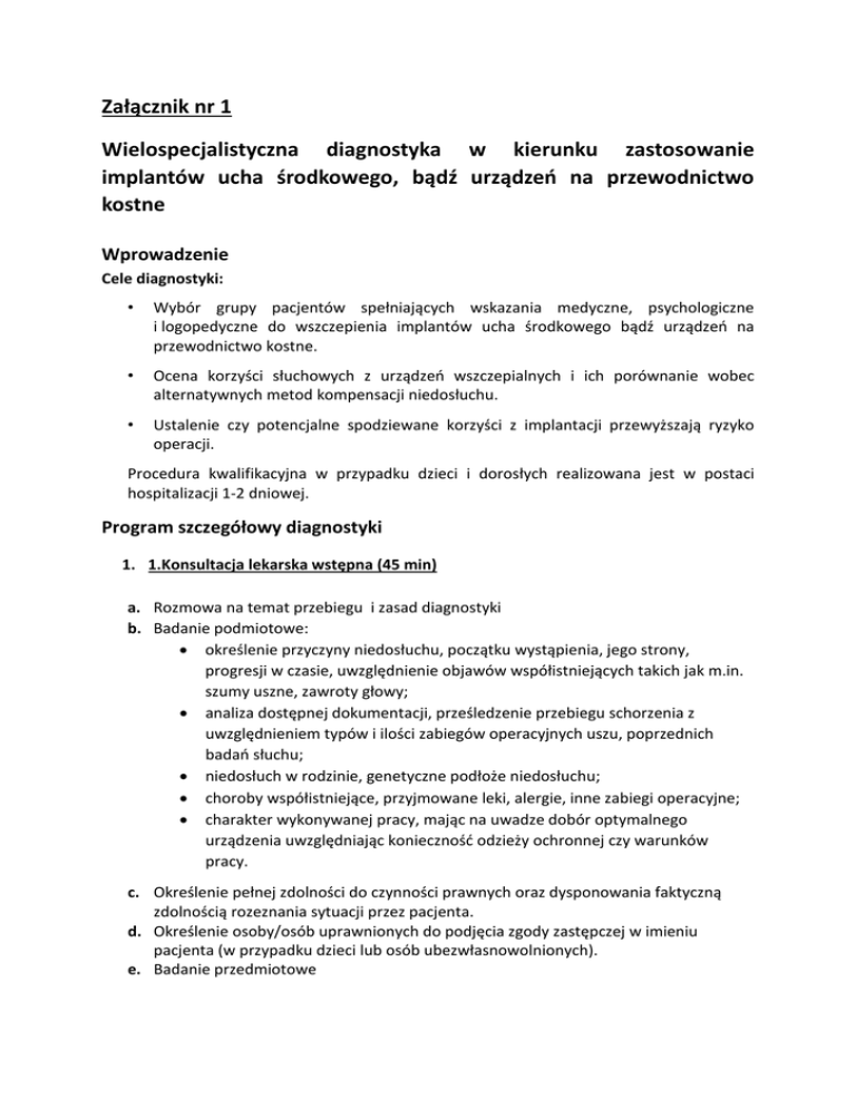 Załącznik nr 1 Wielospecjalistyczna diagnostyka w kierunku zastosowanie implantów ucha środkowego, bądź urządzeń na przewodnictwo kostne Wprowadzenie Cele diagnostyki: • Wybór grupy pacjentów spełniających wskazania medyczne, psychologiczne i logopedyczne do wszczepienia implantów ucha środkowego bądź urządzeń na przewodnictwo kostne. • Ocena korzyści słuchowych z urządzeń wszczepialnych i ich porównanie wobec alternatywnych metod kompensacji niedosłuchu. • Ustalenie czy potencjalne spodziewane korzyści z implantacji przewyższają ryzyko operacji. Procedura kwalifikacyjna w przypadku dzieci i dorosłych realizowana jest w postaci hospitalizacji 1-2 dniowej. Program szczegółowy diagnostyki 1. 1.Konsultacja lekarska wstępna (45 min) a. Rozmowa na temat przebiegu i zasad diagnostyki b. Badanie podmiotowe: • określenie przyczyny niedosłuchu, początku wystąpienia, jego strony, progresji w czasie, uwzględnienie objawów współistniejących takich jak m.in. szumy uszne, zawroty głowy; • analiza dostępnej dokumentacji, prześledzenie przebiegu schorzenia z uwzględnieniem typów i ilości zabiegów operacyjnych uszu, poprzednich badań słuchu; • niedosłuch w rodzinie, genetyczne podłoże niedosłuchu; • choroby współistniejące, przyjmowane leki, alergie, inne zabiegi operacyjne; • charakter wykonywanej pracy, mając na uwadze dobór optymalnego urządzenia uwzględniając konieczność odzieży ochronnej czy warunków pracy. c. Określenie pełnej zdolności do czynności prawnych oraz dysponowania faktyczną zdolnością rozeznania sytuacji przez pacjenta. d. Określenie osoby/osób uprawnionych do podjęcia zgody zastępczej w imieniu pacjenta (w przypadku dzieci lub osób ubezwłasnowolnionych). e. Badanie przedmiotowe Badanie otorynolaryngologiczne z oceną videotoskopową i mikroskopową uszu, z ew. oczyszczeniem, szczególnie w przypadkach pacjentów z przewlekłym zapaleniem uszu, po operacjach uszu, szczegółowa analiza stanu miejscowego uszu z oceną zachowanych elementów ucha zewnętrznego i środkowego. f. Badanie audiometrii tonalnej (AT), audiometrii słownej (AS) oraz ew. badanie odruchów z mięśnia strzemiączkowego, audiometrii impedancyjnej (AI), otoemisji akustycznych (OEAE). 2. Wizyta w pracowni badań słuchu I (60 – 90 min) a. Audiometria tonalna (AT) co pół oktawy. b. Audiometria słowna (AS) w słuchawkach nausznych, wyznaczenie progu słyszenia, progu rozumienia mowy i stopnia dyskryminacji lub progu dyskryminacji dla każdego ucha, W uzasadnionych medycznie przypadkach: tympanometria, badanie progu odruchów z mięśnia strzemiączkowego. 3. 2.Konsultacja lekarska (30min) a. Omówienie wyników badań b. Zaplanowanie typu i strony symulacji na podstawie badania podmiotowego, przedmiotowego oraz wyników AT, AS c. Udzielenie informacji o urządzeniach, których symulacje będą wykonane 4. Wizyta w pracowni audioprotetycznej (60 – 180 min. w zależności od wieku, współpracy, konieczności badania jedno lub obustronnie. W przypadku dzieci i osób starszych niezbędne są dodatkowe przerwy (20-30 min.) między badaniami, w celu uzyskania pełnego skupienia, warunkującego wiarygodność badań). a. Kontrola aparatów własnych pacjenta: • kontrola ustawień aparatów własnych; • wykonanie audiometrii progowej dla wybranych częstotliwości i słownej w polu swobodnym dla wybranych natężeń ( od 2-4 ) dla każdego ucha protezowanego oddzielnie z aparatem i bez; b. Prezentacja na temat wybranych urządzeń wszczepialnych, których symulacje zostały zaplanowane dla danego pacjenta: • przedstawienie zasady działania i ogólnej budowy urządzenia wszczepialnego. c. Przeprowadzenie symulacji działania wybranych zgodnie z charakterystyką niedosłuchu urządzeń wszczepialnych: • audiometria progowa w polu swobodnym z wyznaczonym urządzeniem dla wybranych częstotliwości, • audiometria słowna w polu swobodnym z wyznaczonym urządzeniem (symulacja) dla wybranych natężeń dźwięków( od 2-4 natężeń) dla jednego lub dla obu uszu oddzielnie, uwzględniając maskowanie ucha przeciwnego, w warunkach cisza, szum. d. Przedstawienie zasad opieki pooperacyjnej, ewentualnych ograniczeń po zabiegu implantacji. e. Zapoznanie pacjenta z procedurą dopasowania procesora dźwięku. f. Uzupełnienie kwestionariuszy oceniających wpływ niedosłuchu na funkcjonowanie pacjenta. 5. Konsultacja psychologa (45 - 60 min.) • • • • Ocena wpływu niedosłuchu na funkcjonowanie pacjenta w życiu codziennym i oczekiwań dotyczących poprawy słuchu. Ocena sytuacji psychospołecznej i wpływu dodatkowych osób na decyzję pacjenta o implantacji. Korelacja wyników symulacji z poprawą słuchu po implantacji. Ocena motywacji uczestnictwa pacjenta w procedurze implantacji i wizytach związanych z dopasowaniem procesora dźwięku. 6. Konsultacja radiologiczna dostępnych wyników badań obrazowych (20-30 min.). • Ocena możliwości anatomicznych zastosowania proponowanych wszczepialnych, konsultacja wyników badań z innych ośrodków. urządzeń 7. Konsultacja lekarska końcowa (30 min) a. Omówienie wyników przeprowadzonych badań i symulacji działania urządzeń wszczepialnych. b. Ocena zysku – efektu słuchowego, z symulacji urządzeń wszczepialnych w porównaniu do konwencjonalnych aparatów słuchowych. c. Weryfikacja wskazań i ewentualne skierowanie na badania obrazowe głowy oceniające możliwości anatomiczne zastosowania wybranych urządzeń wszczepialnych. Najczęściej badaniem z wyboru jest tomografia komputerowa kości skroniowych oceniająca możliwość zastosowania urządzeń na przewodnictwo kostne bądź implantu ucha środkowego w przypadkach wad wrodzonych, przewlekłych zapaleń uszu. d. Przekazanie informacji dotyczących kolejnych kroków procedury kwalifikacyjnej, niezbędnych badań przedoperacyjnych, szczegółów dotyczących samego zabiegu operacyjnego implantacji, przeb