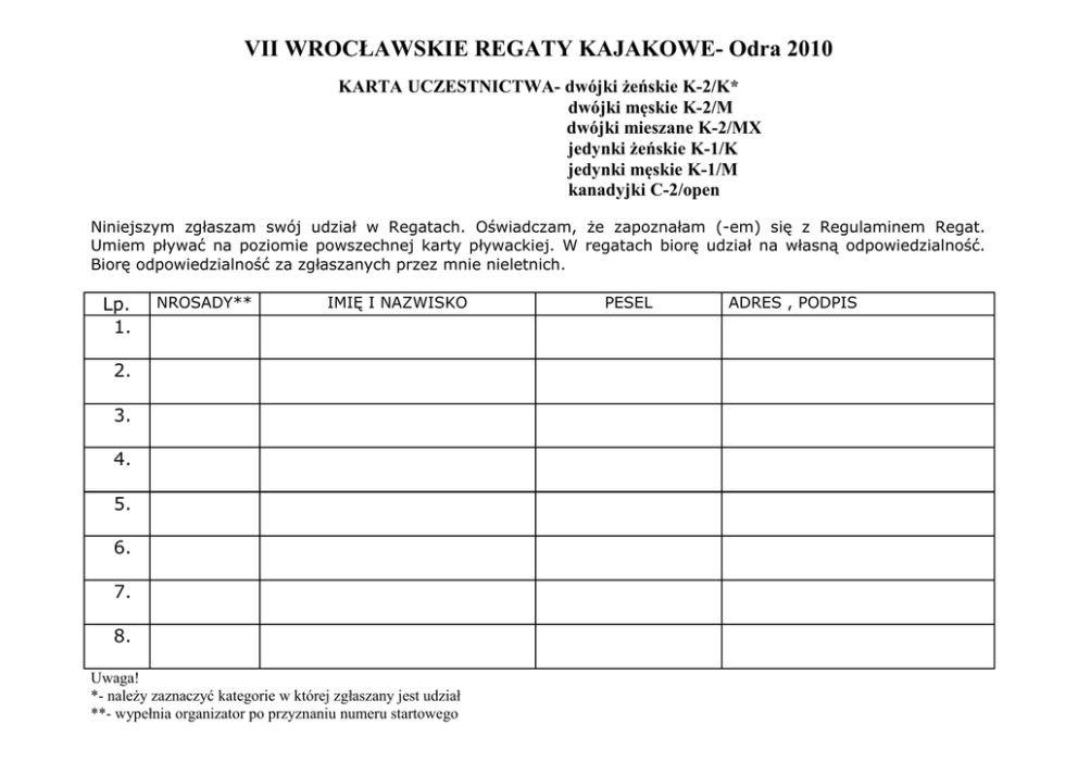 VII WROCŁAWSKIE REGATY KAJAKOWE- Odra 2010 KARTA UCZESTNICTWA- dwójki żeńskie K-2/K* dwójki męskie K-2/M dwójki mieszane K-2/MX jedynki żeńskie K-1/K jedynki męskie K-1/M kanadyjki C-2/open Niniejszym zgłaszam swój udział w Regatach. Oświadczam, że zapoznałam (-em) się z Regulaminem Regat. Umiem pływać na poziomie powszechnej karty pływackiej. W regatach biorę udział na własną odpowiedzialność. Biorę odpowiedzialność za zgłaszanych przez mnie nieletnich. Lp. 1. NROSADY** IMIĘ I NAZWISKO 2. 3. 4. 5. 6. 7. 8. Uwaga! *- należy zaznaczyć kategorie w której zgłaszany jest udział **- wypełnia organizator po przyznaniu numeru startowego PESEL ADRES , PODPIS